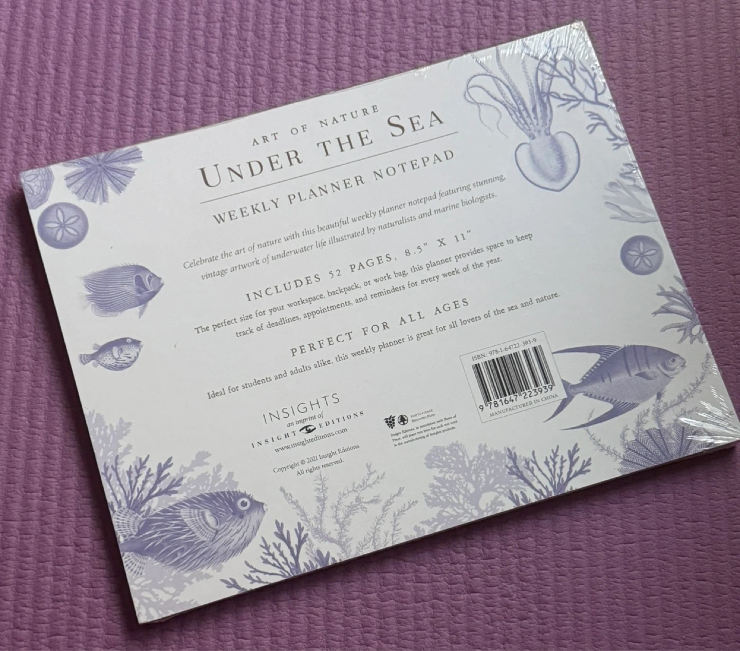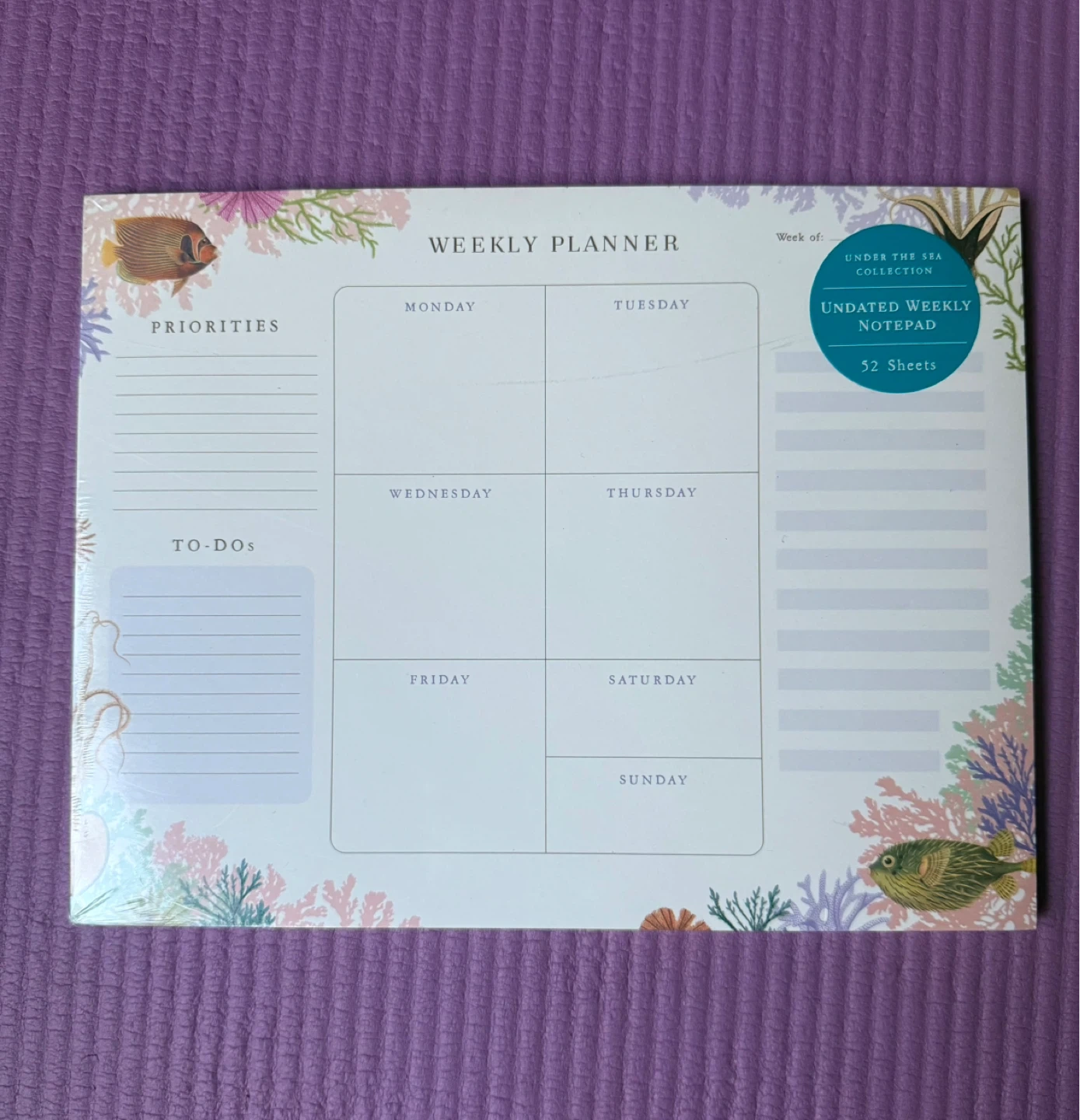 This undated weekly planner notepad features an 'Under the Sea' collection design. It includes 52 pages and measures 8.5" x 11". It's perfect for students and adults alike for planning the week.
