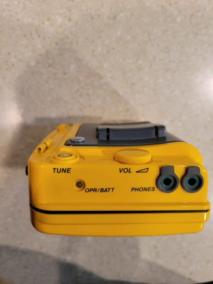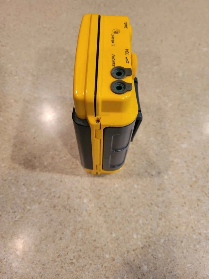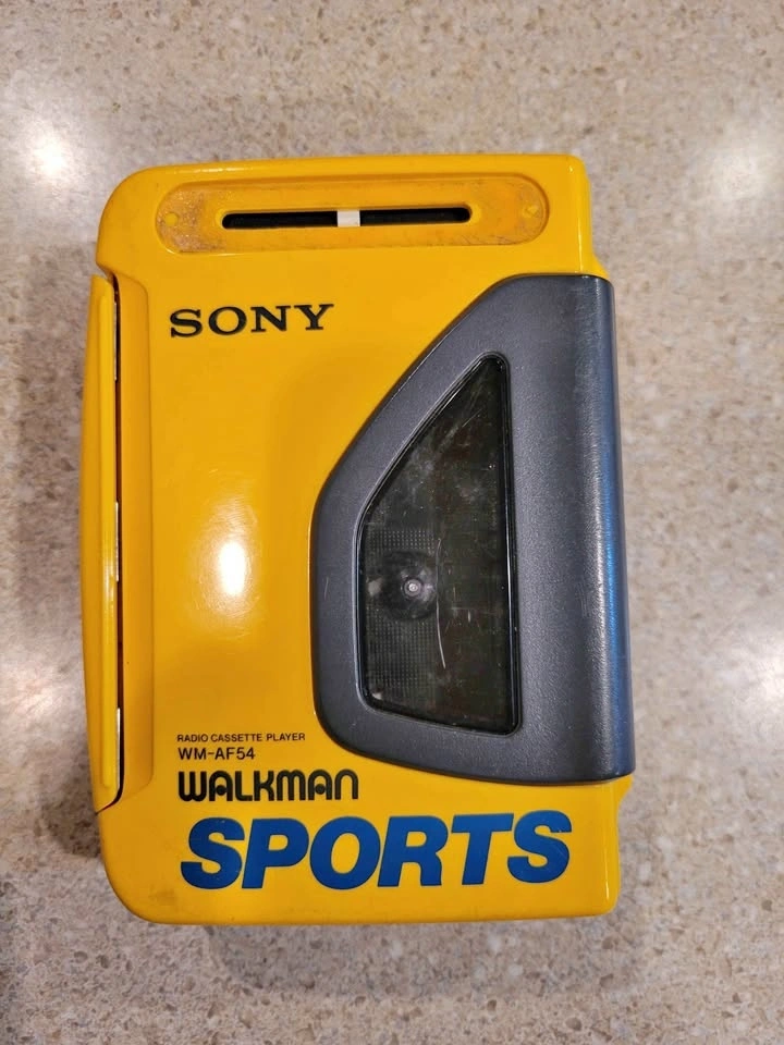Sony WM-AF54 Sports Walkman, a portable radio cassette player. This vintage model, first released in 1989, is part of the durable Walkman Sports line. Please note: earphones are not included, and the radio turning dial, radio station face plate, and battery cover are missing. The Walkman is in working condition, and I will include brand new batteries.
