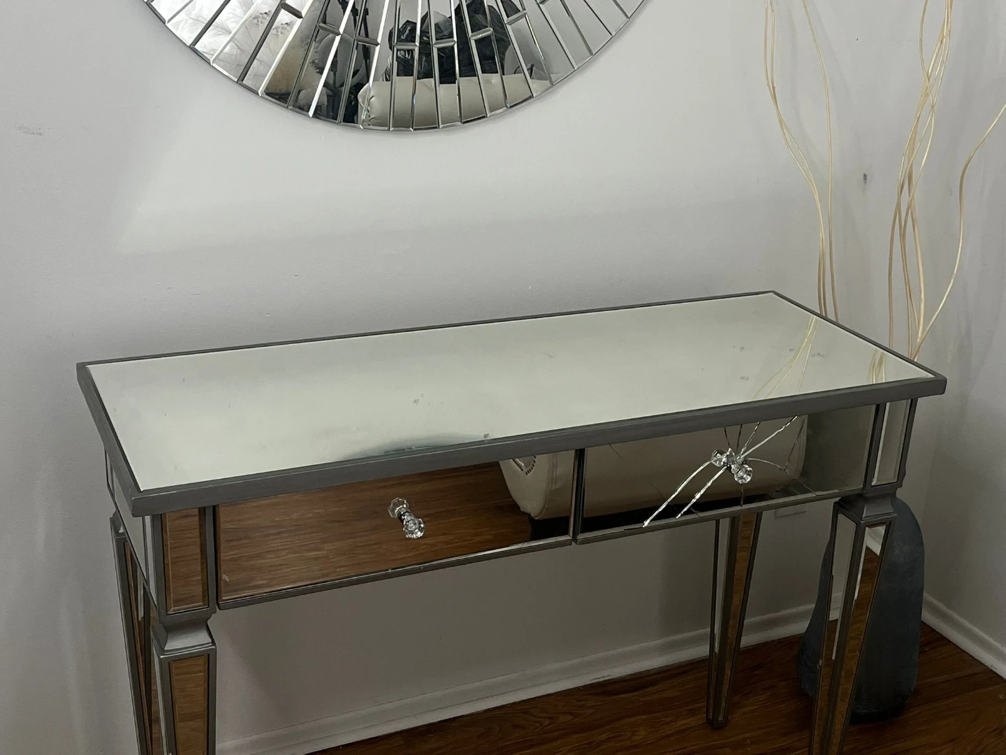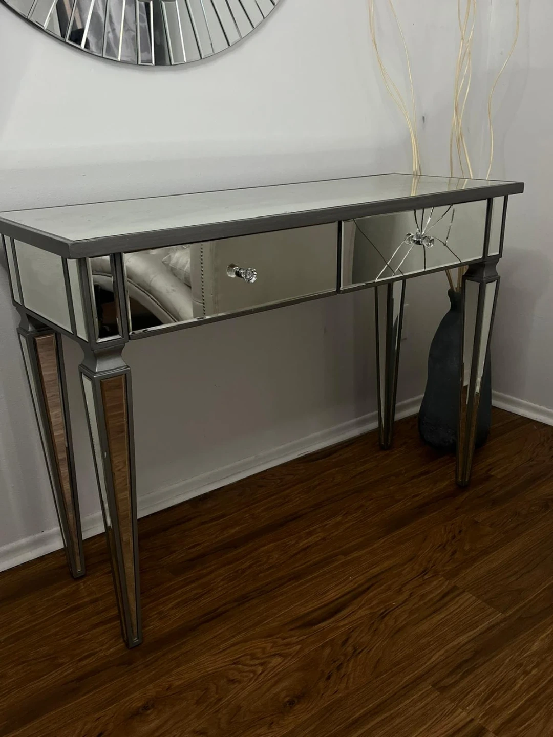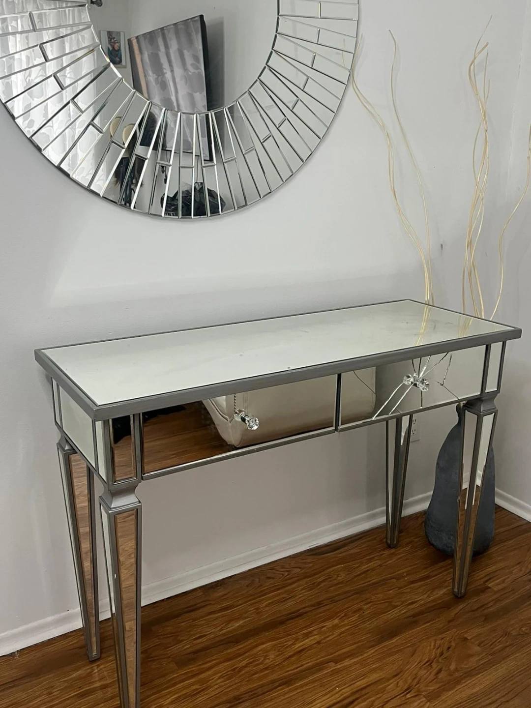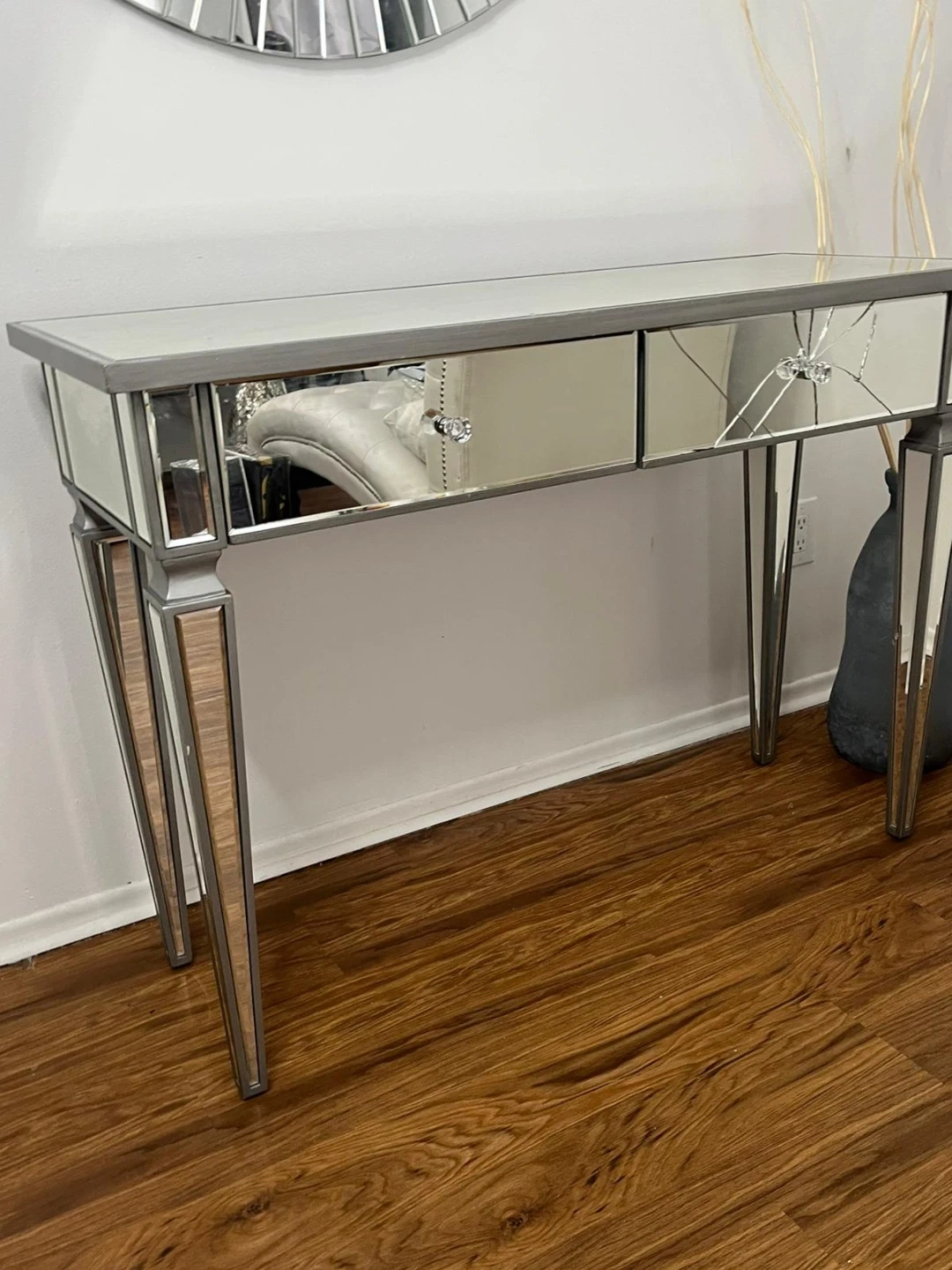 A stylish mirrored console table with two drawers and crystal-like knobs. Mirrored finish on all sides. This piece's reflective surface makes it a lovely addition to any entryway or living space.Had a cracked on one side