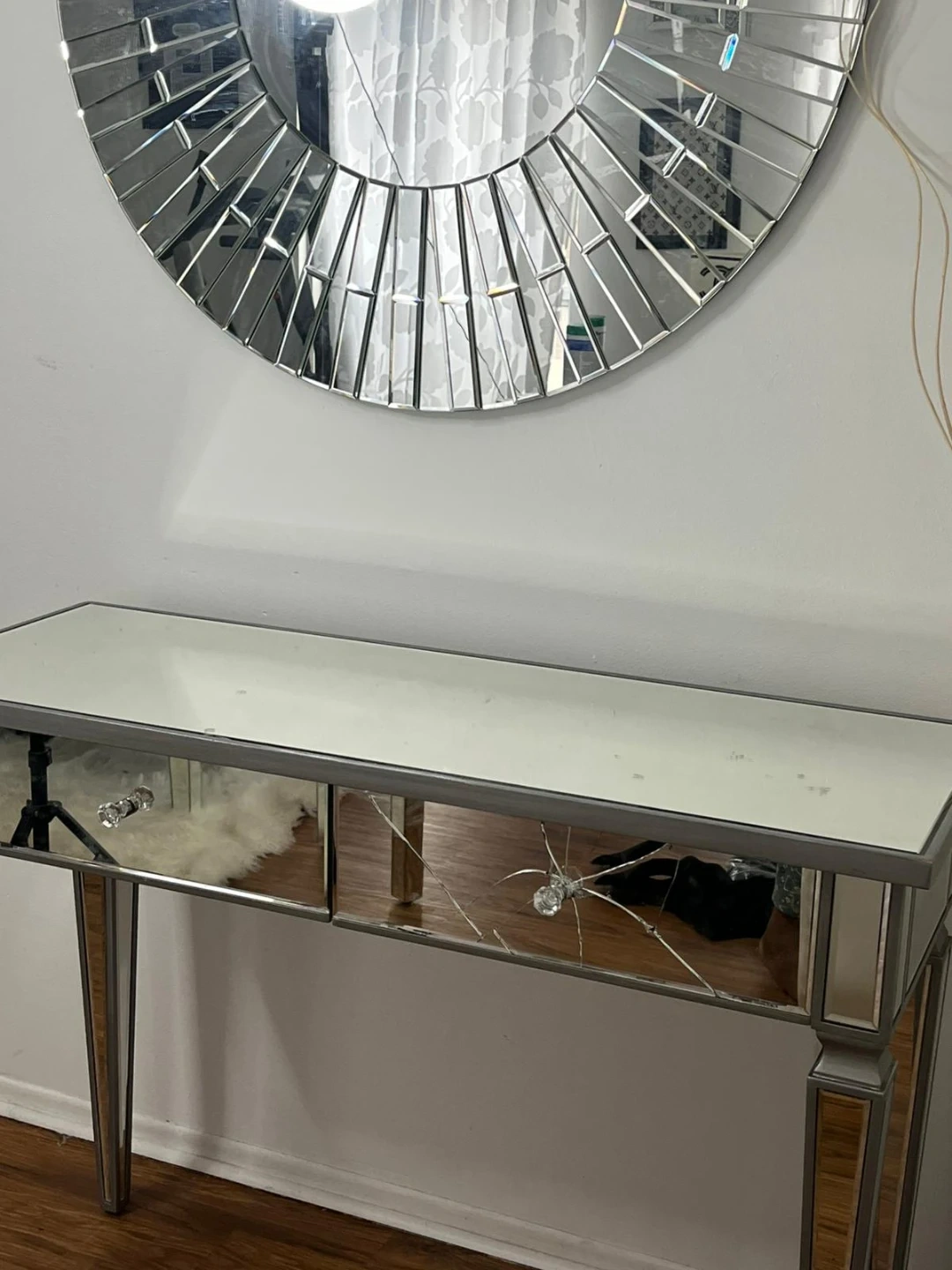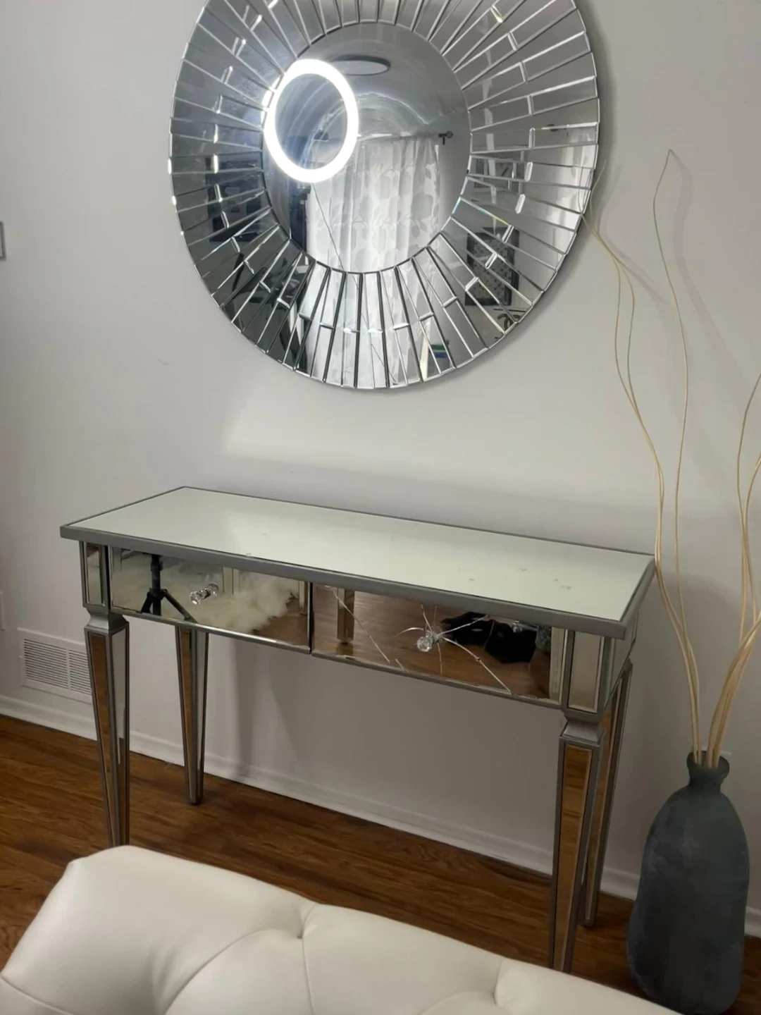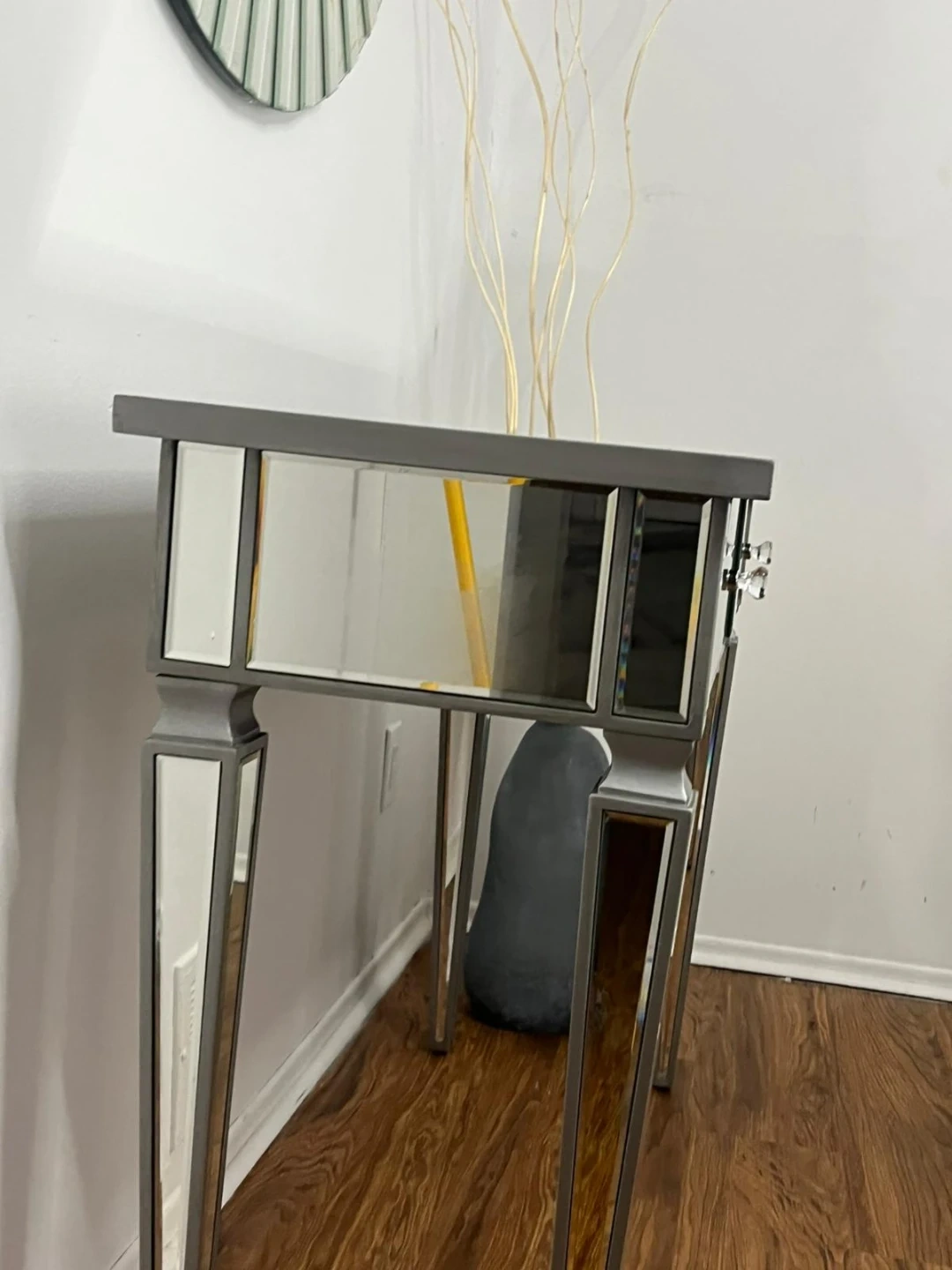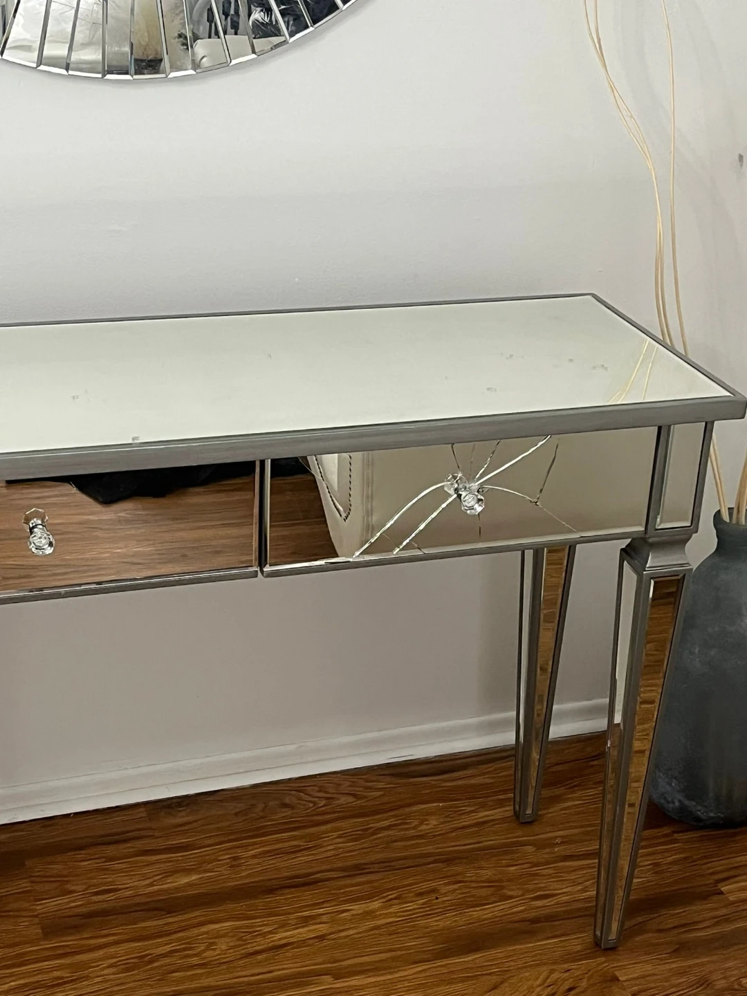 A stylish mirrored console table with two drawers and crystal-like knobs. Mirrored finish on all sides. This piece's reflective surface makes it a lovely addition to any entryway or living space.Had a cracked on one side