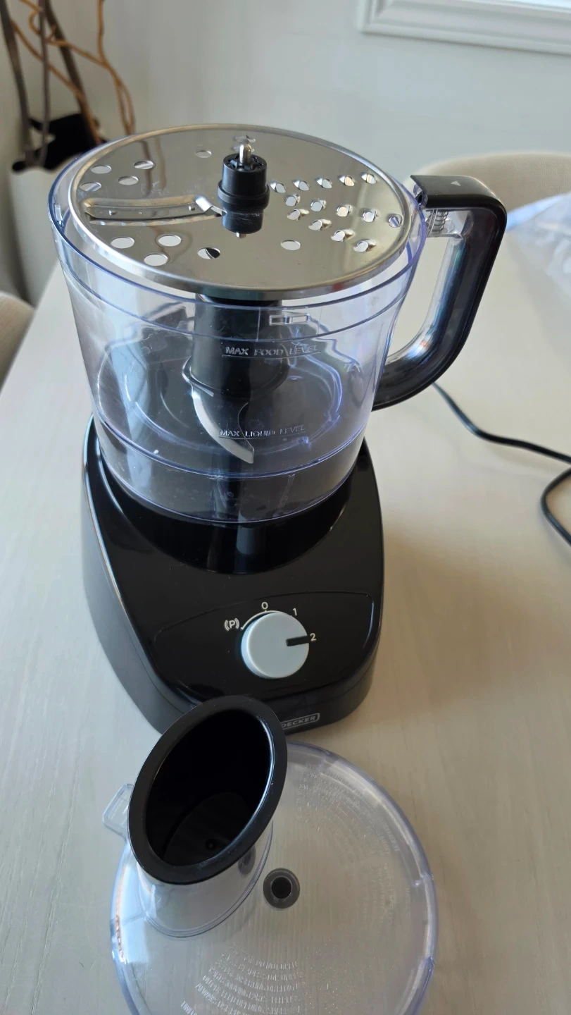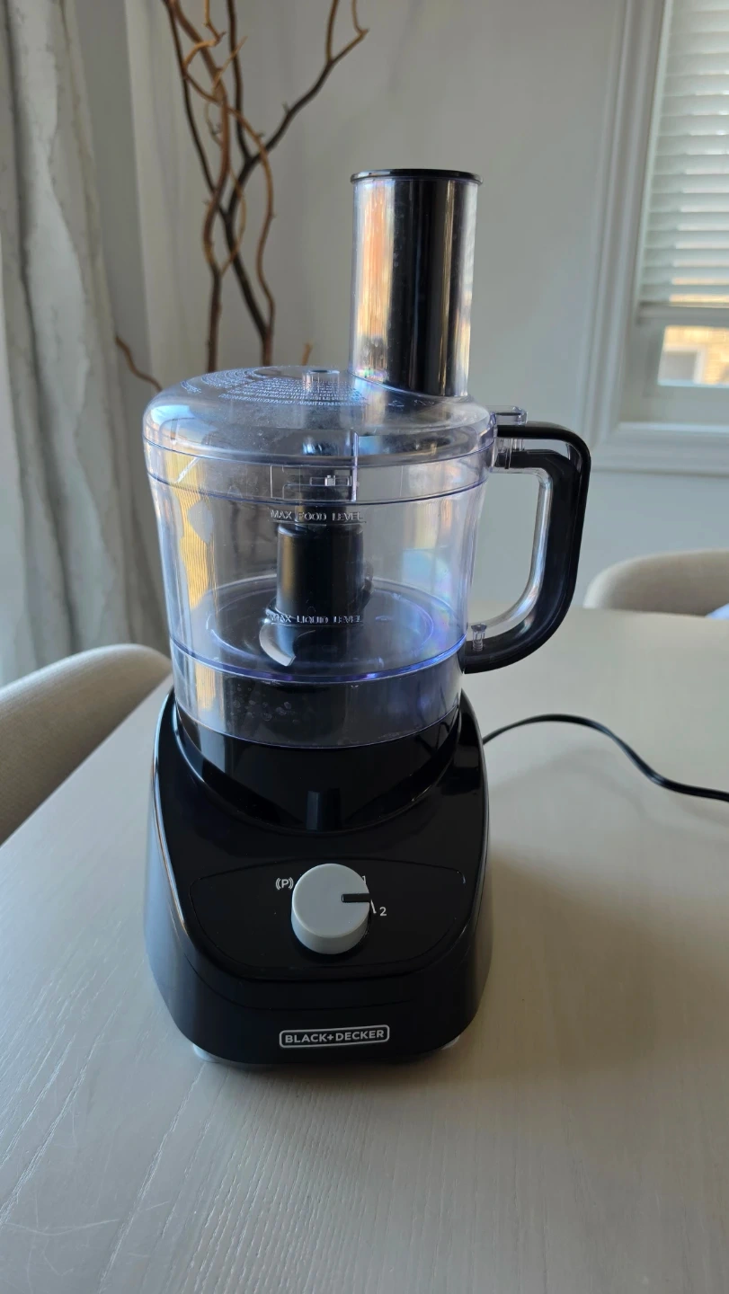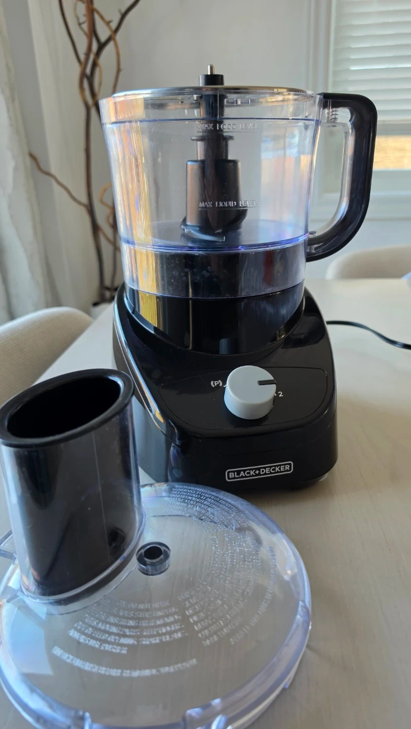 Black+Decker 8-cup food processor in black. It includes the food processor base, bowl, lid, food pusher, and blade. Great for chopping, slicing, and shredding.