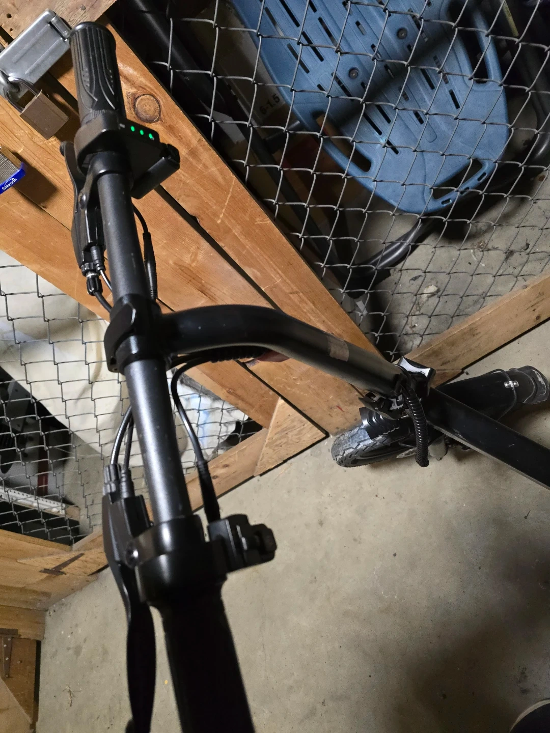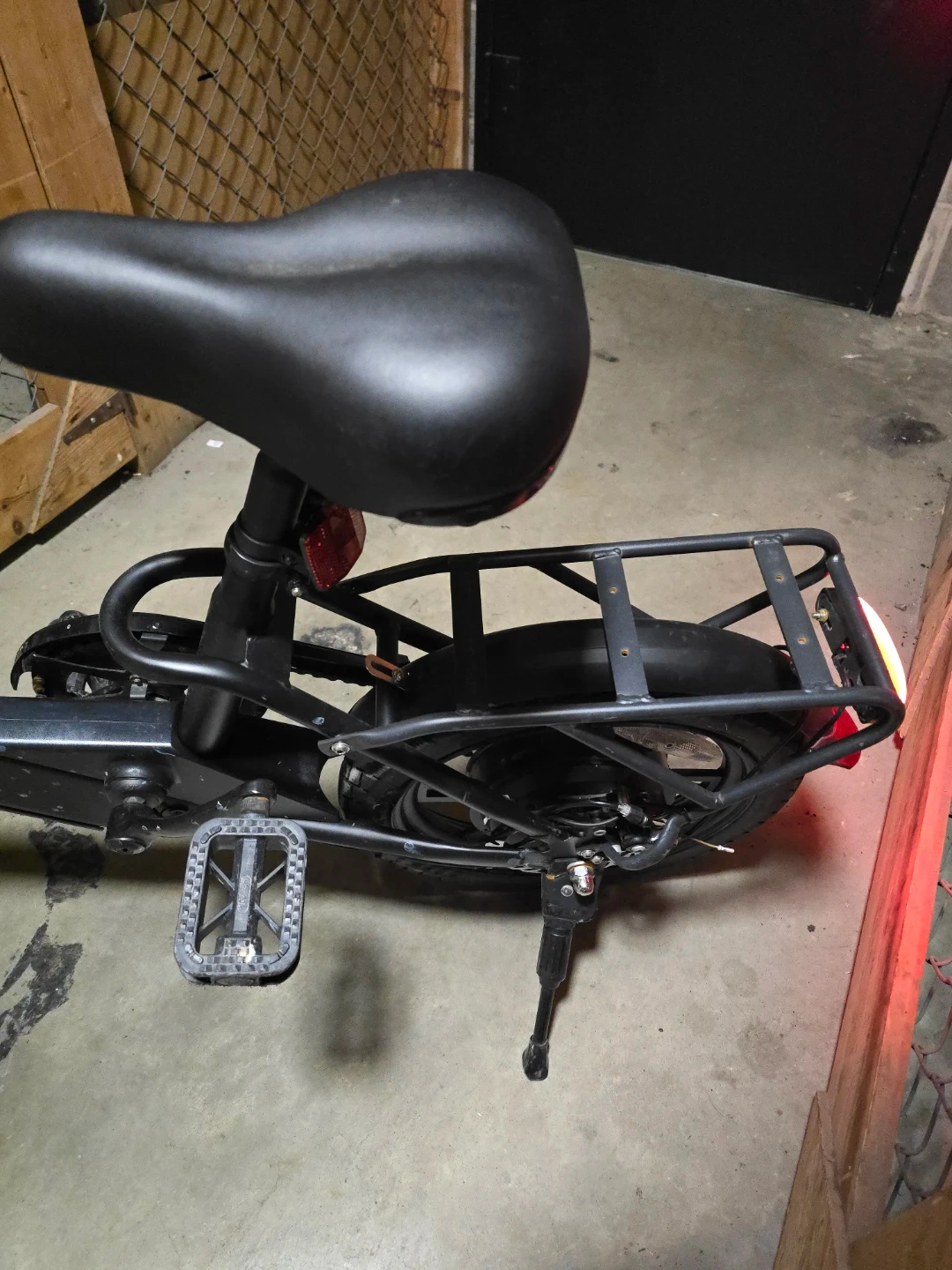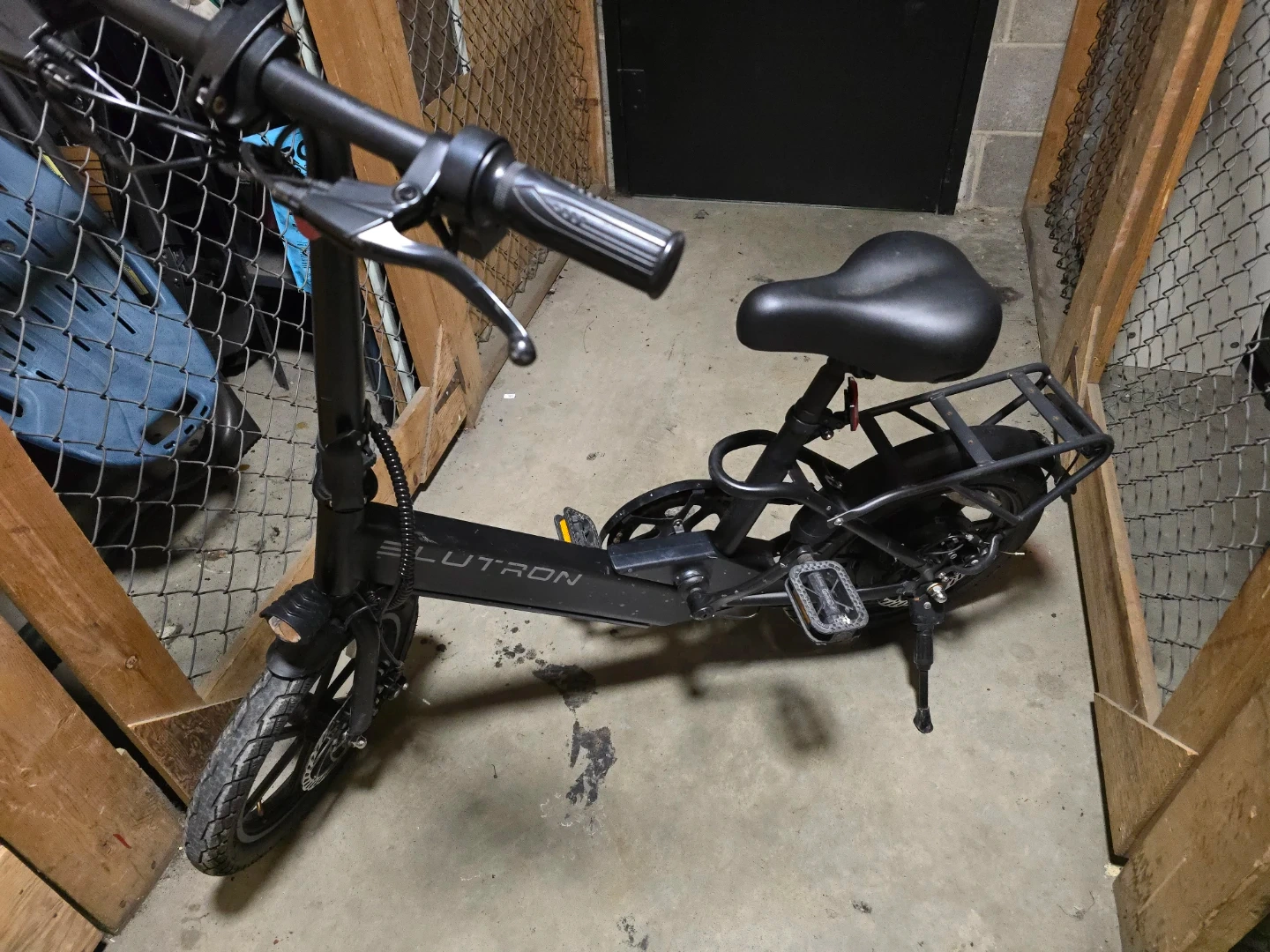 Black E-LUTRON electric scooter. It's equipped with a rear cargo rack and has pedal assist. Comes with a black seat and handlebar.