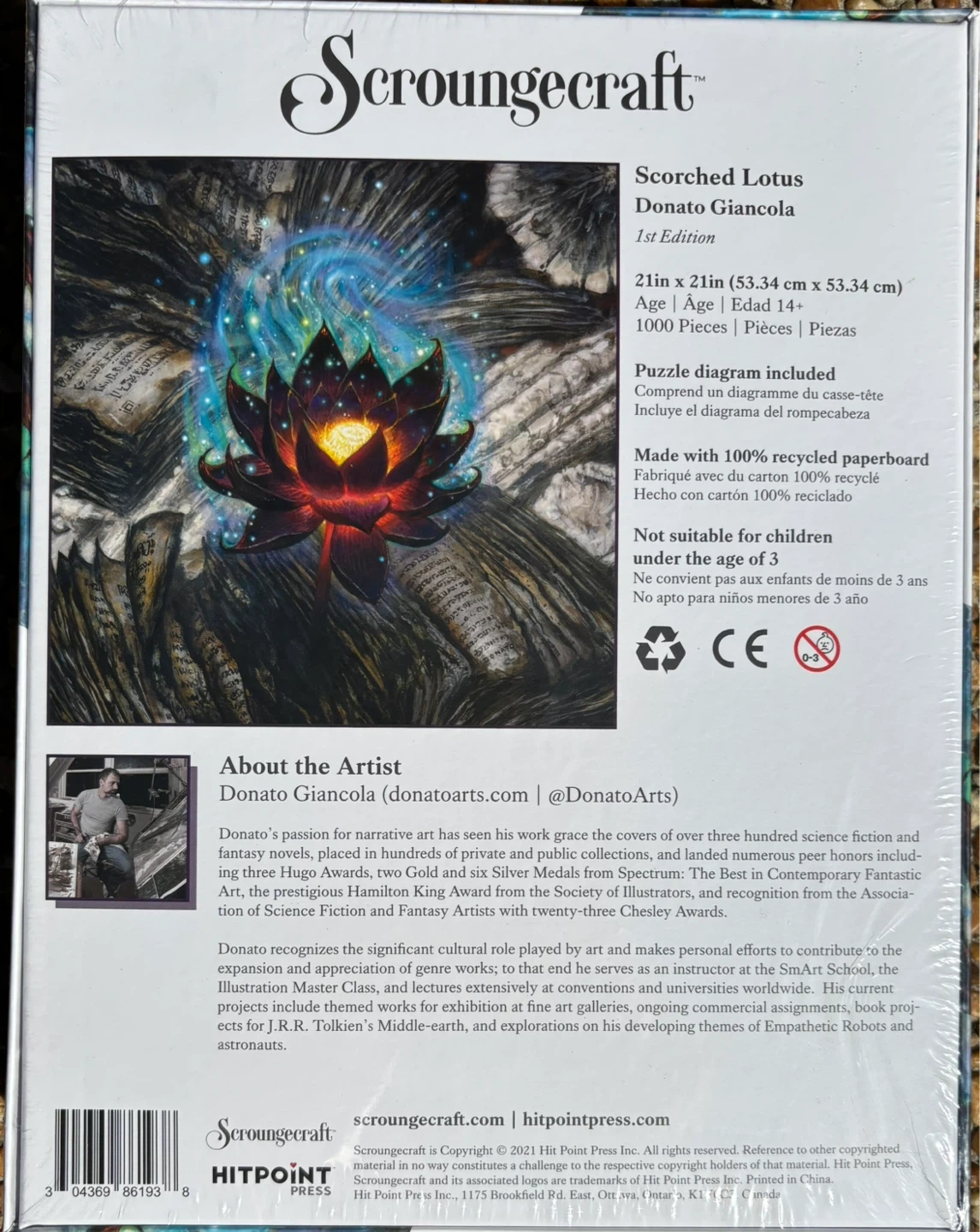 A 1000-piece jigsaw puzzle from Scrougecraft featuring the "Scorched Lotus" artwork. New and still in wrapped box. It's made with 100% recycled paperboard. The finished puzzle measures 21in x 21in.