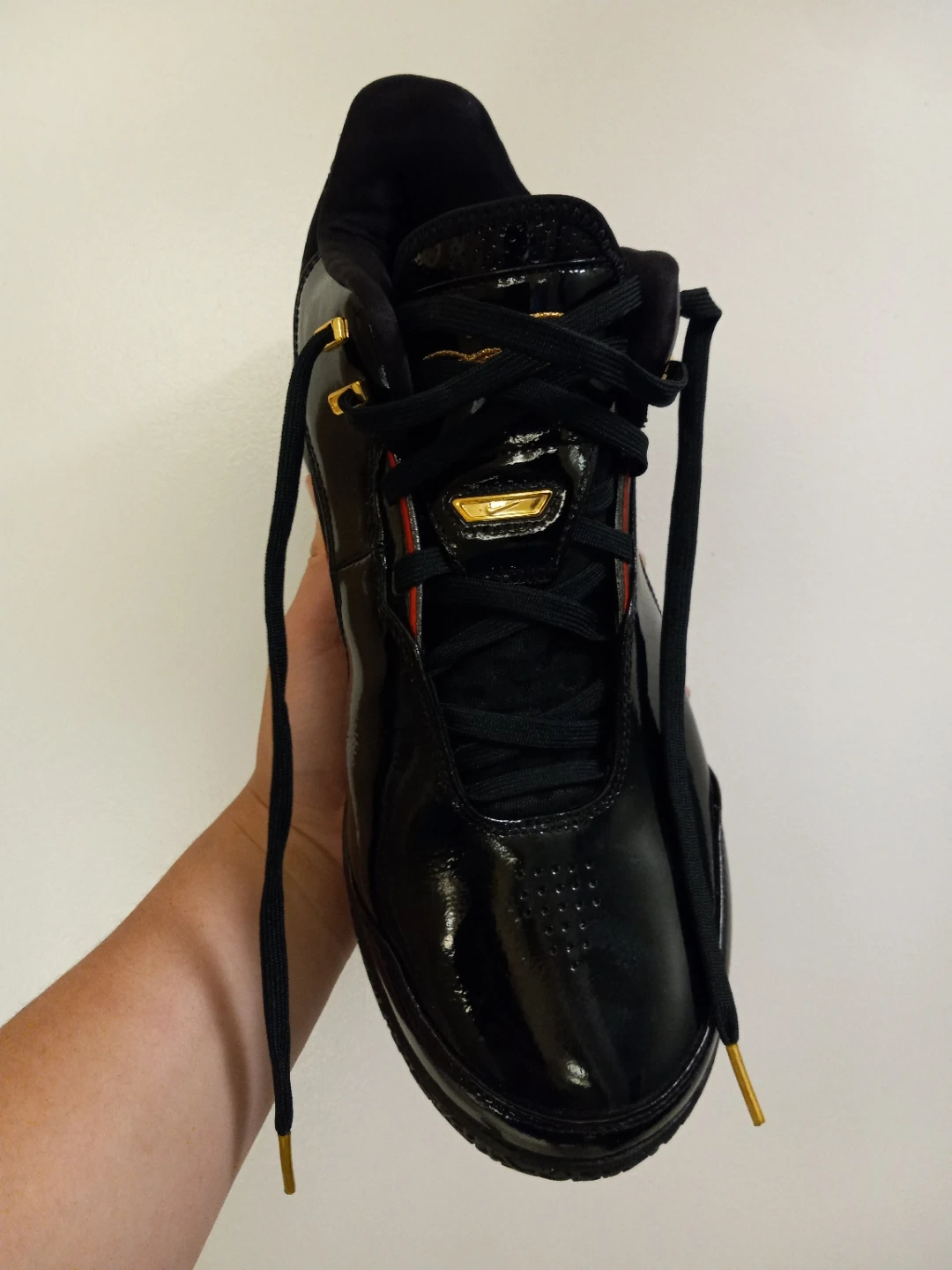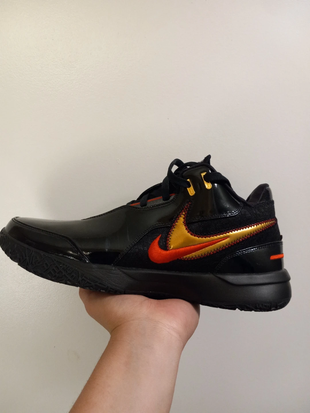 These are lebron nxxt gen Nike basketball shoes in black with orange and gold accents. They feature a shiny patent leather toe and side panels with a mesh heel. The sole has Zoom Air cushioning.