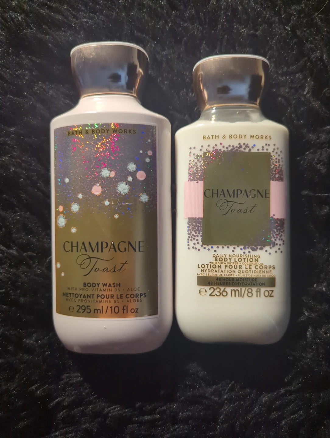 Selling two unused 295/236ml bottles of Champagne Toast body wash and body lotion.