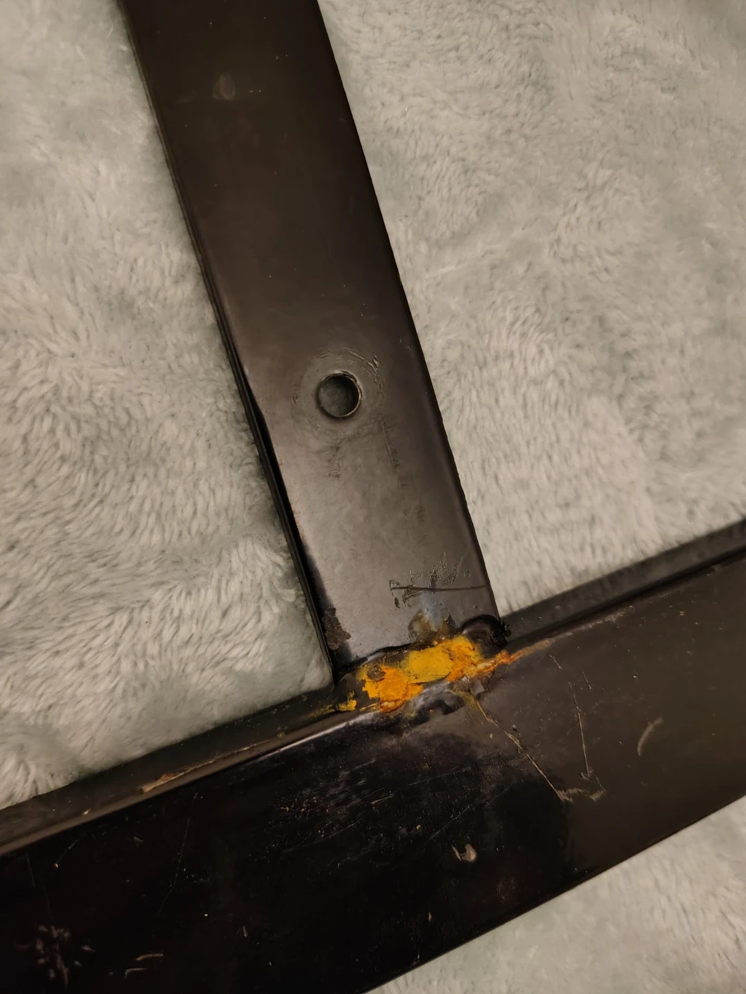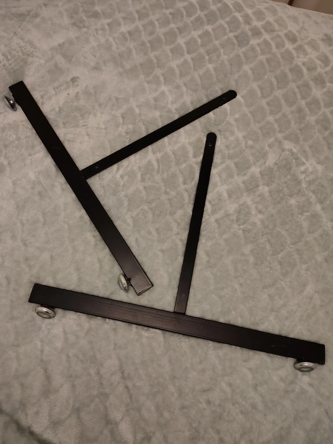 This is a black metal grid display stand base. It's made of metal and has adjustable feet. Some rust is present on one of the base connections. Does not effect it however for function.