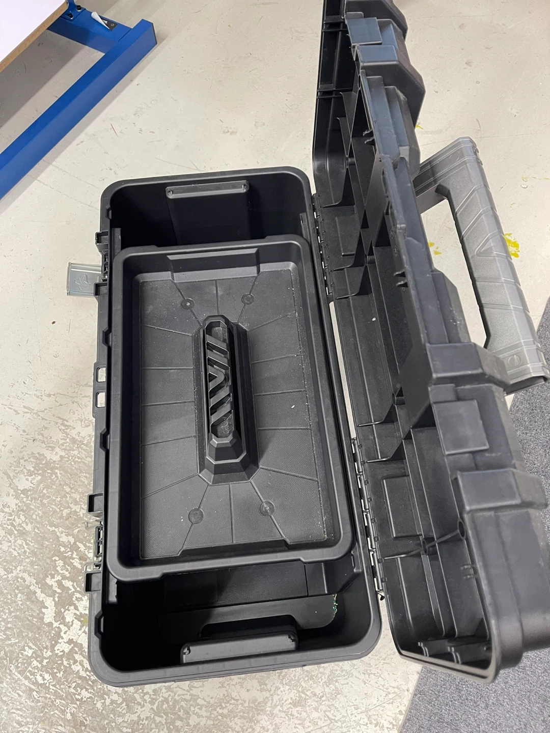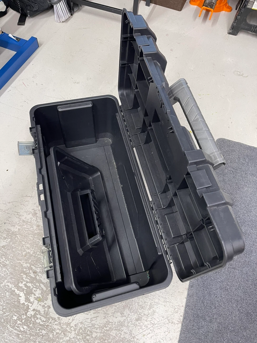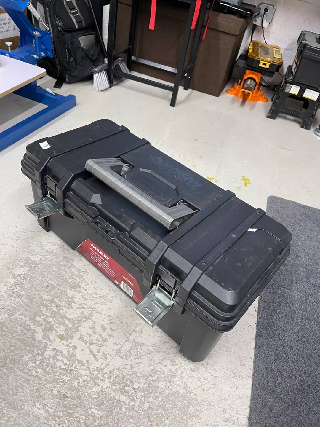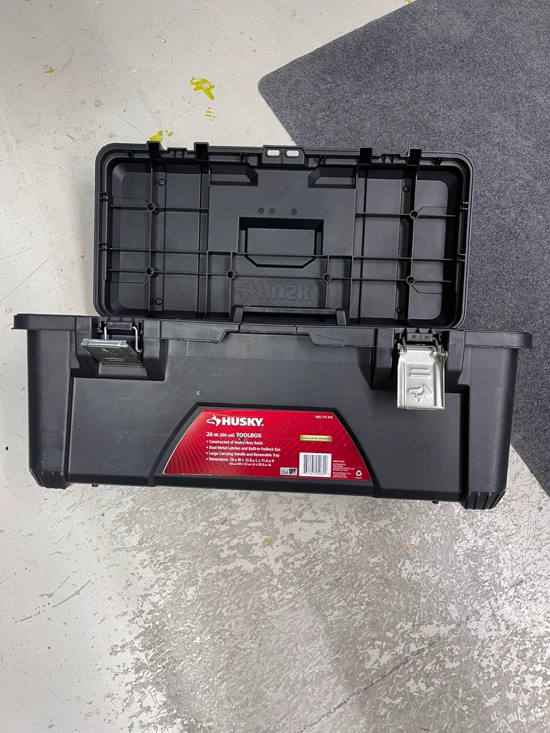 This is a Husky 26 inch toolbox. It's constructed of heavy-duty resin and features dual metal latches and a built-in padlock eye. It also has a large carrying handle and a removable tray.