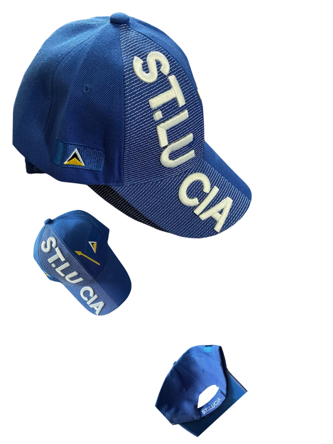 This is a blue baseball cap featuring "ST.LU.CIA" embroidered in white on the front. It also has a small triangular emblem on the side. The phrase "ST.LU.CIA" is also visible on the underside of the brim. It's a great souvenir cap!