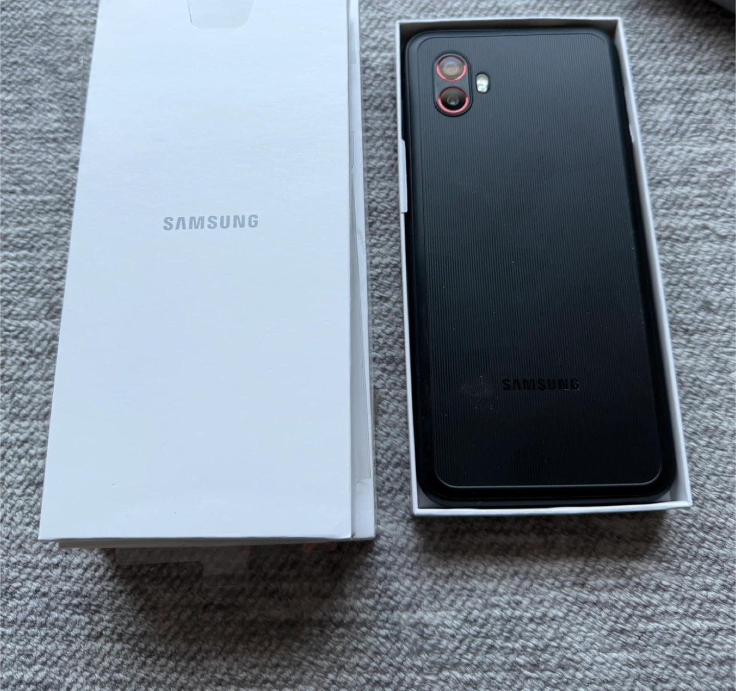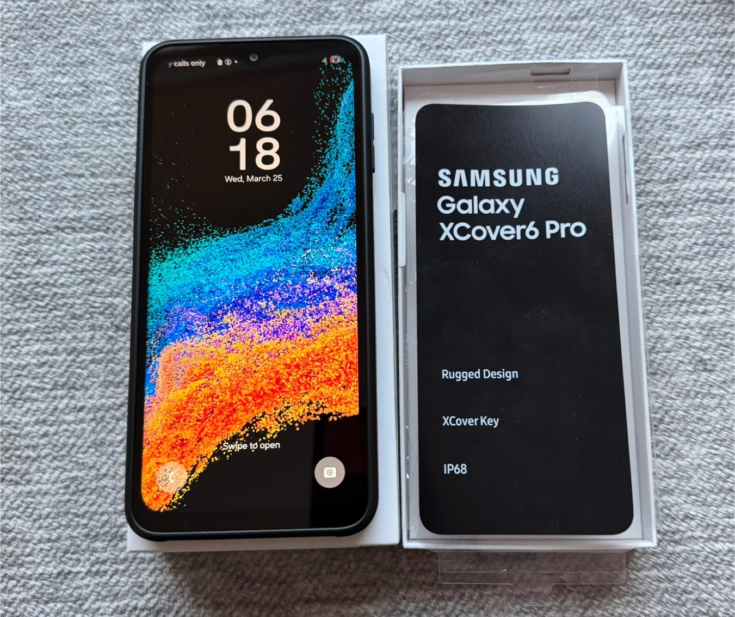 Samsung Galaxy XCover6 Pro smartphone in black. It's a rugged design with IP68 rating. Comes with original box. Like new, works with any carrier.