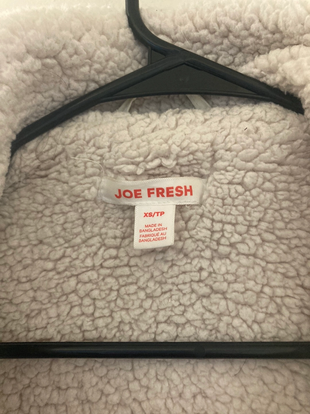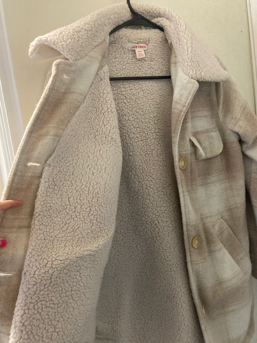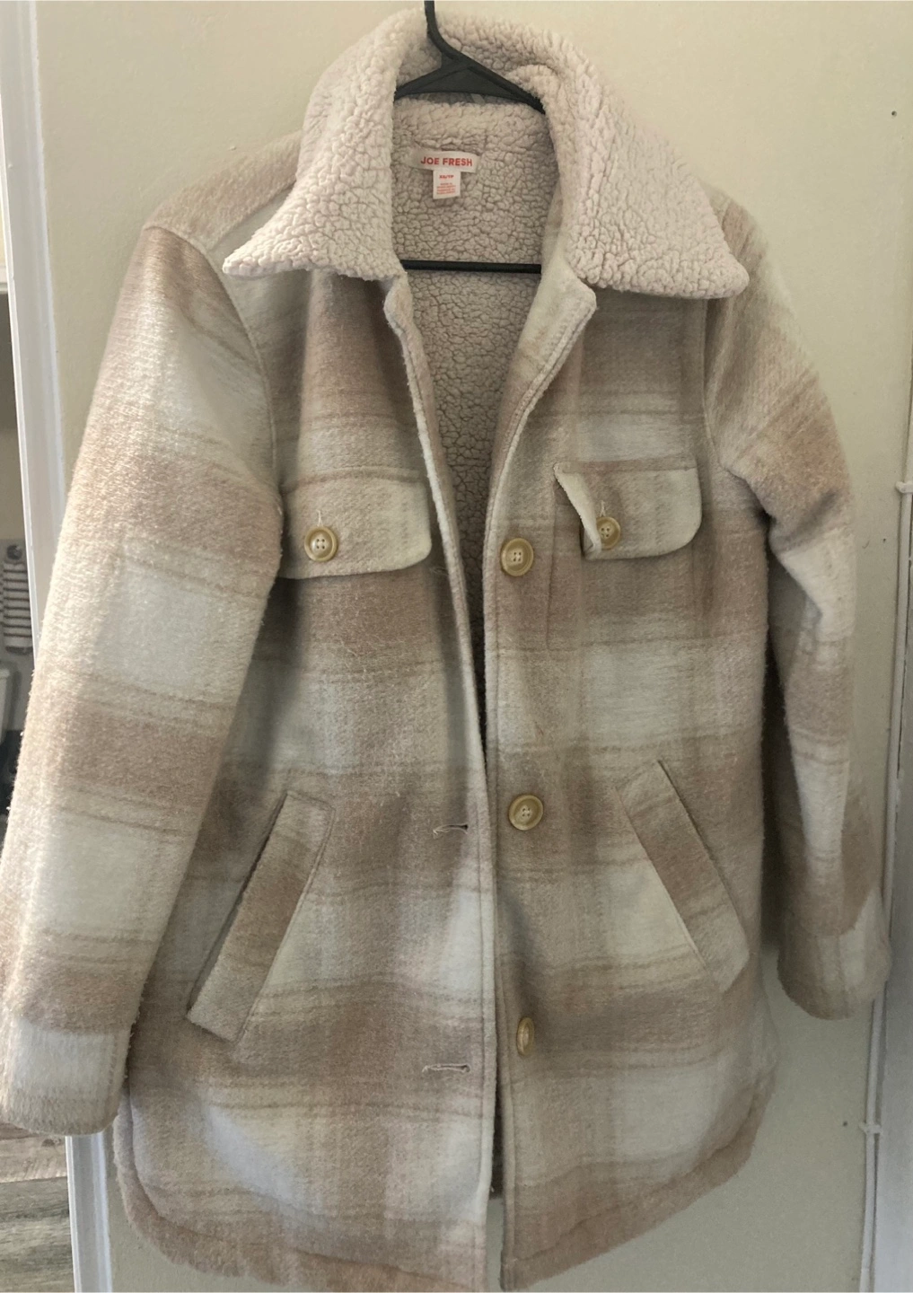 Cozy up in this Joe Fresh sherpa jacket! It's a size XS and features a stylish beige plaid pattern. The sherpa lining will keep you warm and comfy on chilly days. Perfect for layering or wearing on its own! Location: eglinton and Caledonia