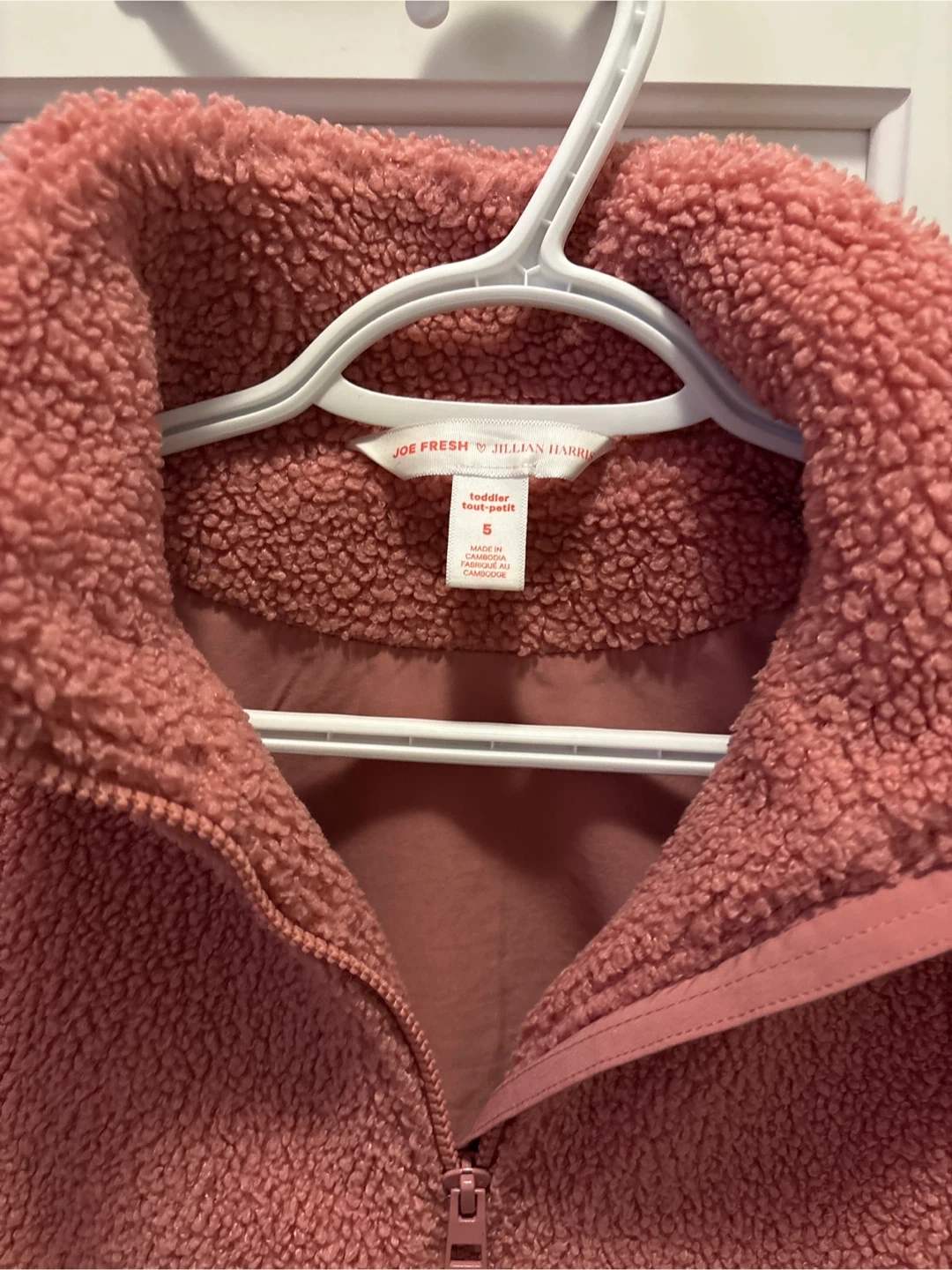 108Selling a super cute Joe Fresh x Jillian Harris toddler jacket! It's a soft, cozy sherpa material in a lovely rose colour. Size is toddler 5 and it's in great condition!