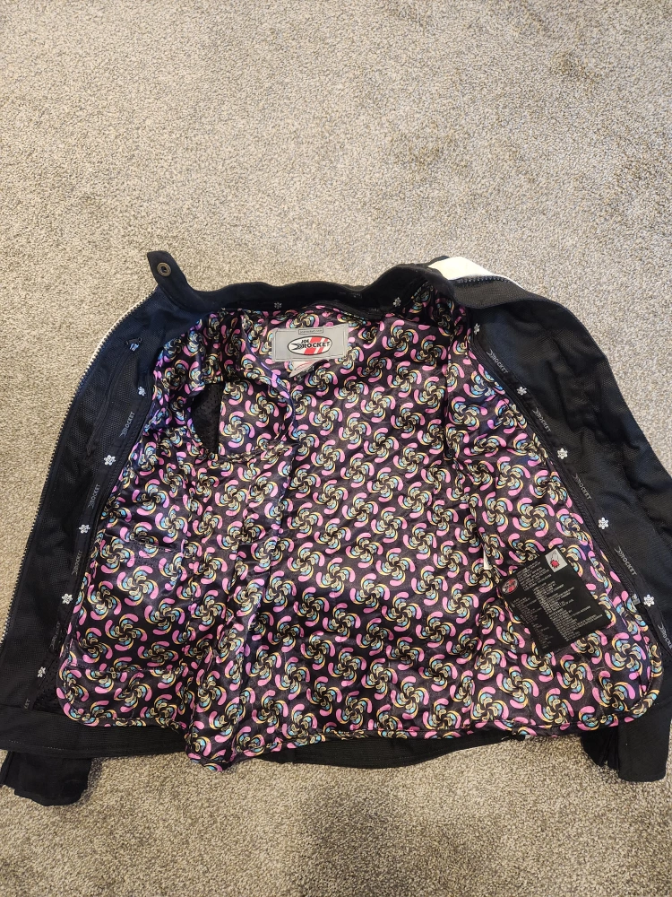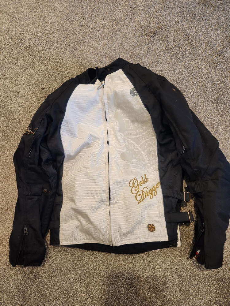 Women's size medium Joe Rocket motorcycle jacket. Black and white colour block design. Gold Digger graphic on back and sleeve. Features multiple pockets and adjustable straps. Removable liner making this jacket very versatile for all weather. Like new condition very clean.