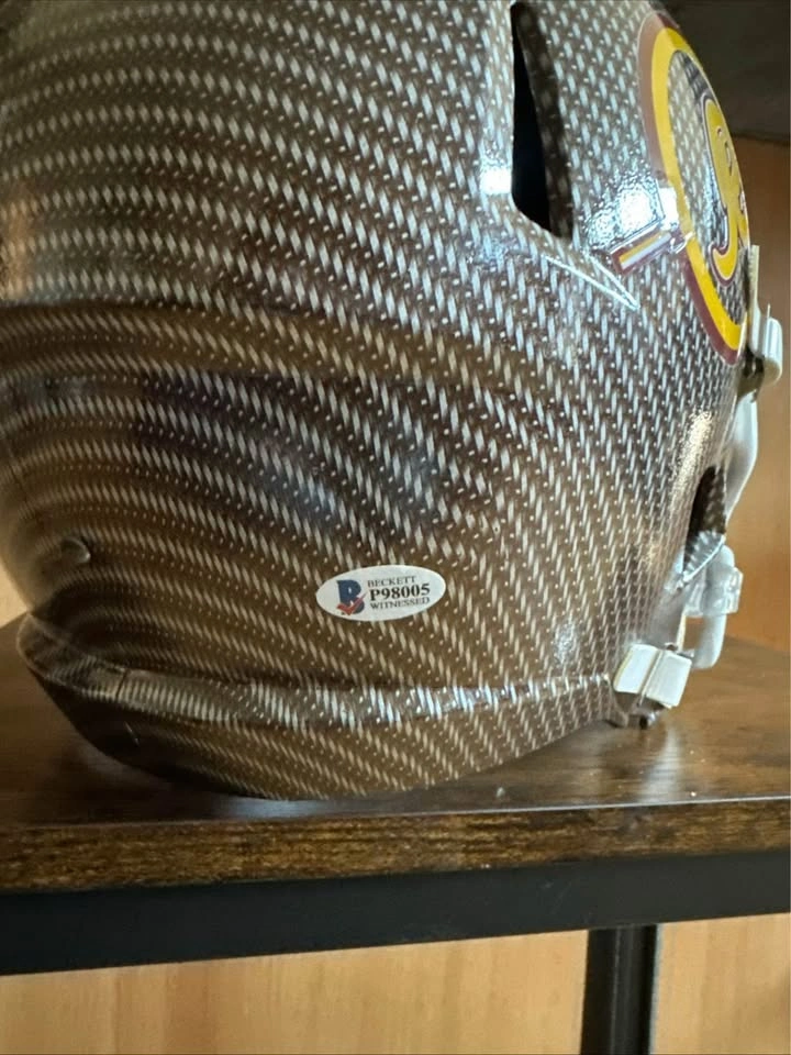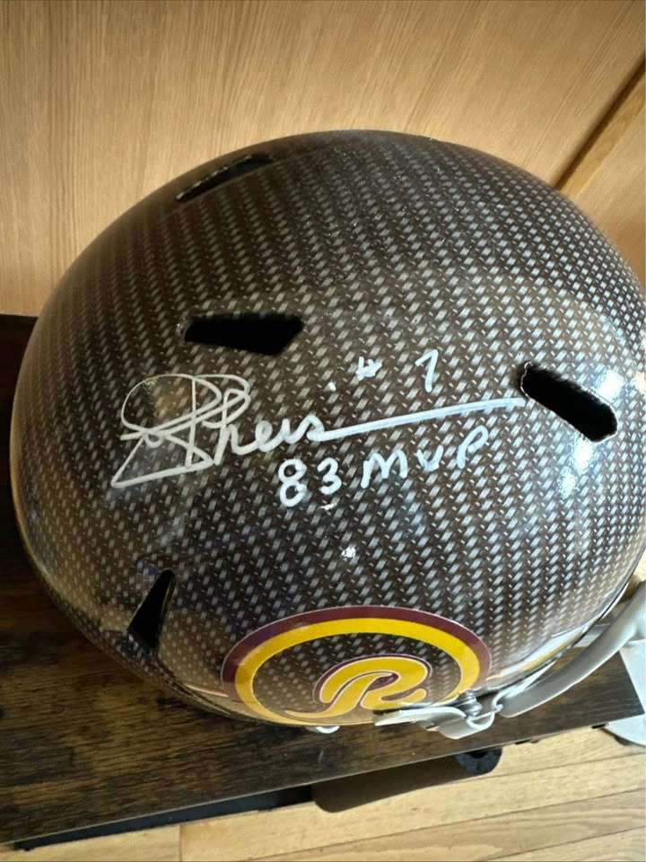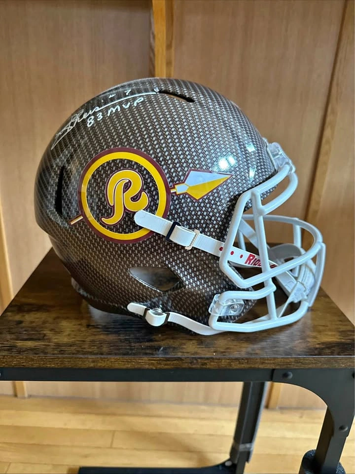 $500 OBO (Can ship at the buyers expense) Autographed Washington Redskins full-size Riddell Carbon Fibre collector helmet signed by Joe Theismann (#7) with the inscription “83 MVP”. • Specialty Carbon Fibre edition — a premium collector’s helmet • Beckett Witnessed authentication (sticker & COA included) • Clean, bold signature with inscription • Excellent condition, ideal for display or investment-grade memorabilia Carbon Fibre helmets are much rarer and more desirable than standard replicas. Market value for Beckett-authenticated Theismann Carbon Fibre helmets typically sits between $650-$750, and this one is priced fairly with room for negotiation.