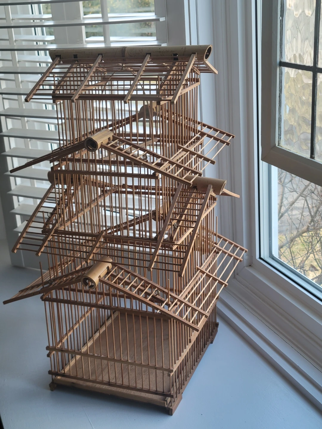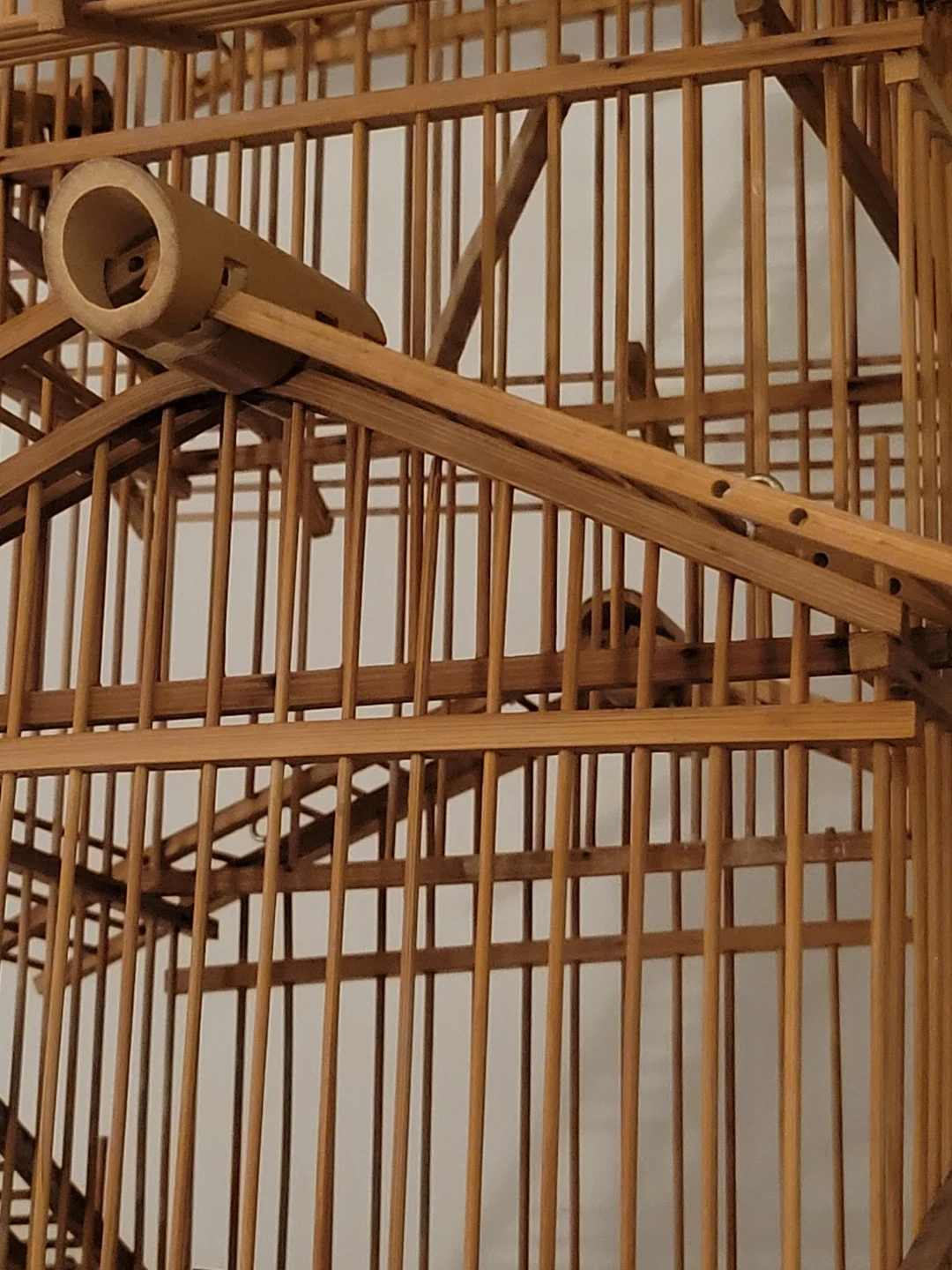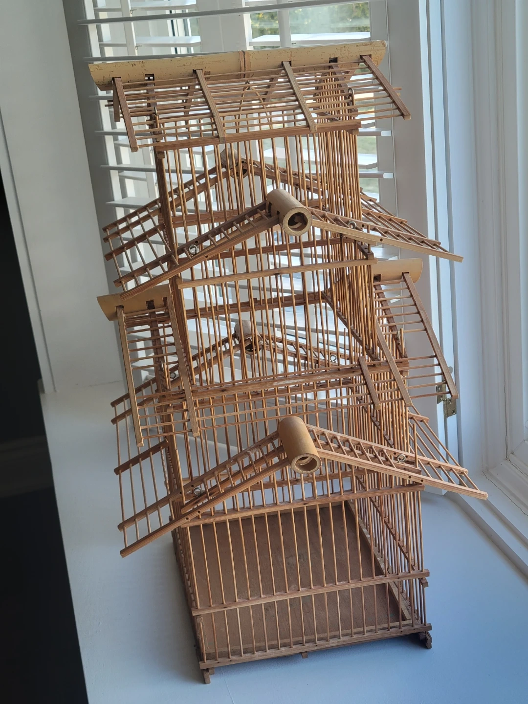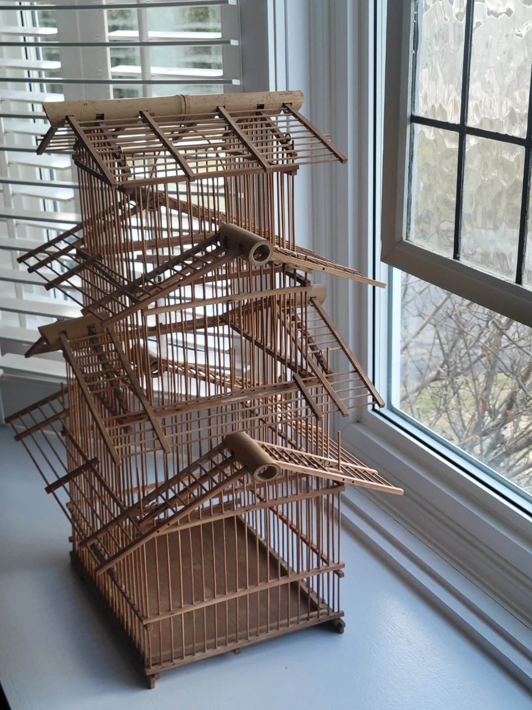 This vintage traditional pagoda-style birdhouse is crafted from bamboo, offering a unique decorative piece with a tiered design reminiscent of classic Asian architecture; it adds an exotic touch to any space, showcasing detailed craftsmanship in its layered roof and vertical supports. It is used, but in good condition.