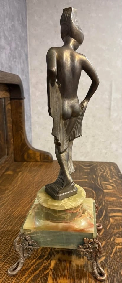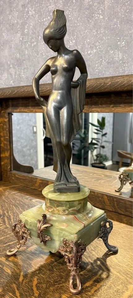 Elegant Art Deco style bronze sculpture depicting a classical female figure with graceful form and balanced proportions. The piece features a beautiful natural aged patina and is mounted on a genuine green onyx stone base. This sculpture reflects the timeless sophistication of the Art Deco period, making it a striking decorative statement for collectors or refined interiors. Details: Total height (with base): approx. 50 cm. Material: Cast bronze (hollow cast). Finish: Original aged patina. Base: Genuine green onyx. Solid and stable. Vintage condition with natural age-related character. A distinctive Art Deco piece that adds elegance and character to any space.
