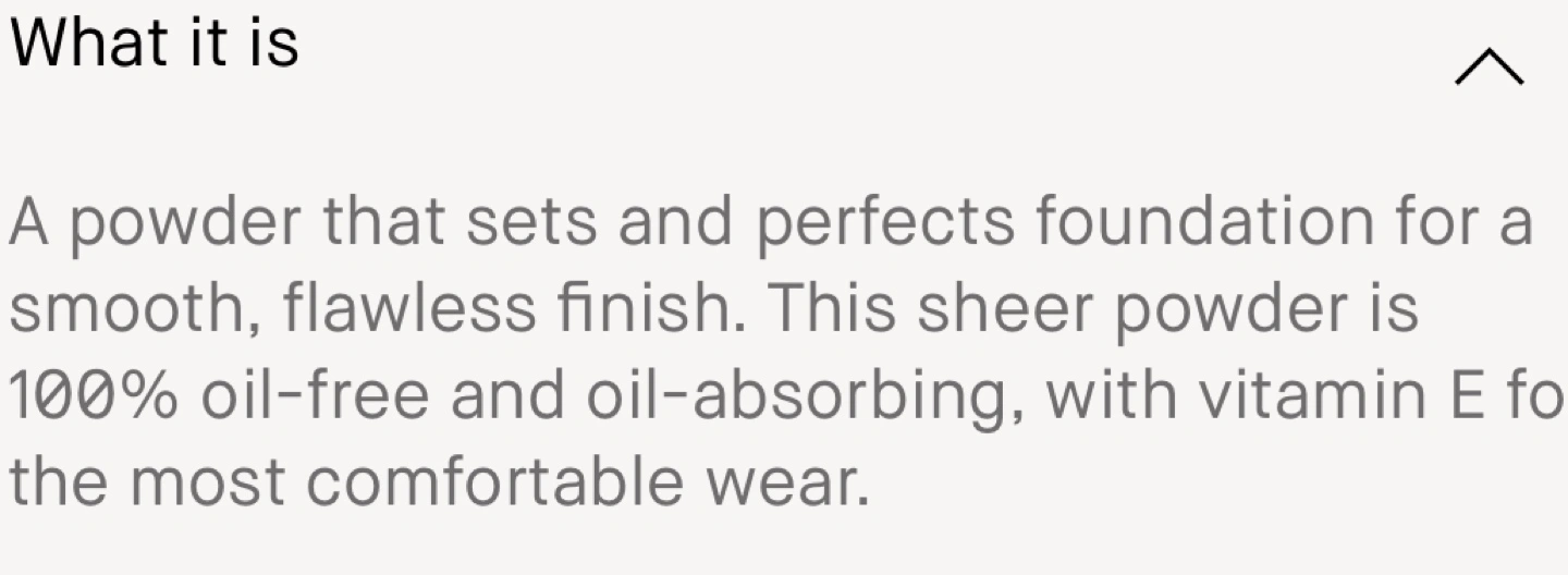 Sheer loose powder. Sets and perfects foundation. Oil-free and oil-absorbing. Vitamin E for comfortable wear. Pale yellow shade, ideal for fair to medium skin.
