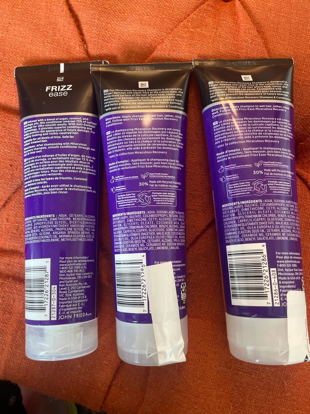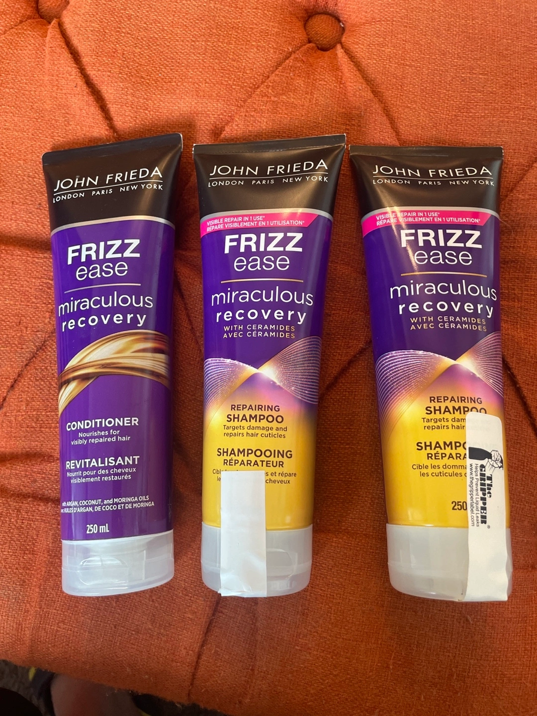 79Price per bottle. Three bottles of John Frieda Frizz Ease Miraculous Recovery. Includes one shampoo and two conditioners. New, unopened. Perfect for taming frizz and repairing damaged hair. Amazon price $12,98+tax