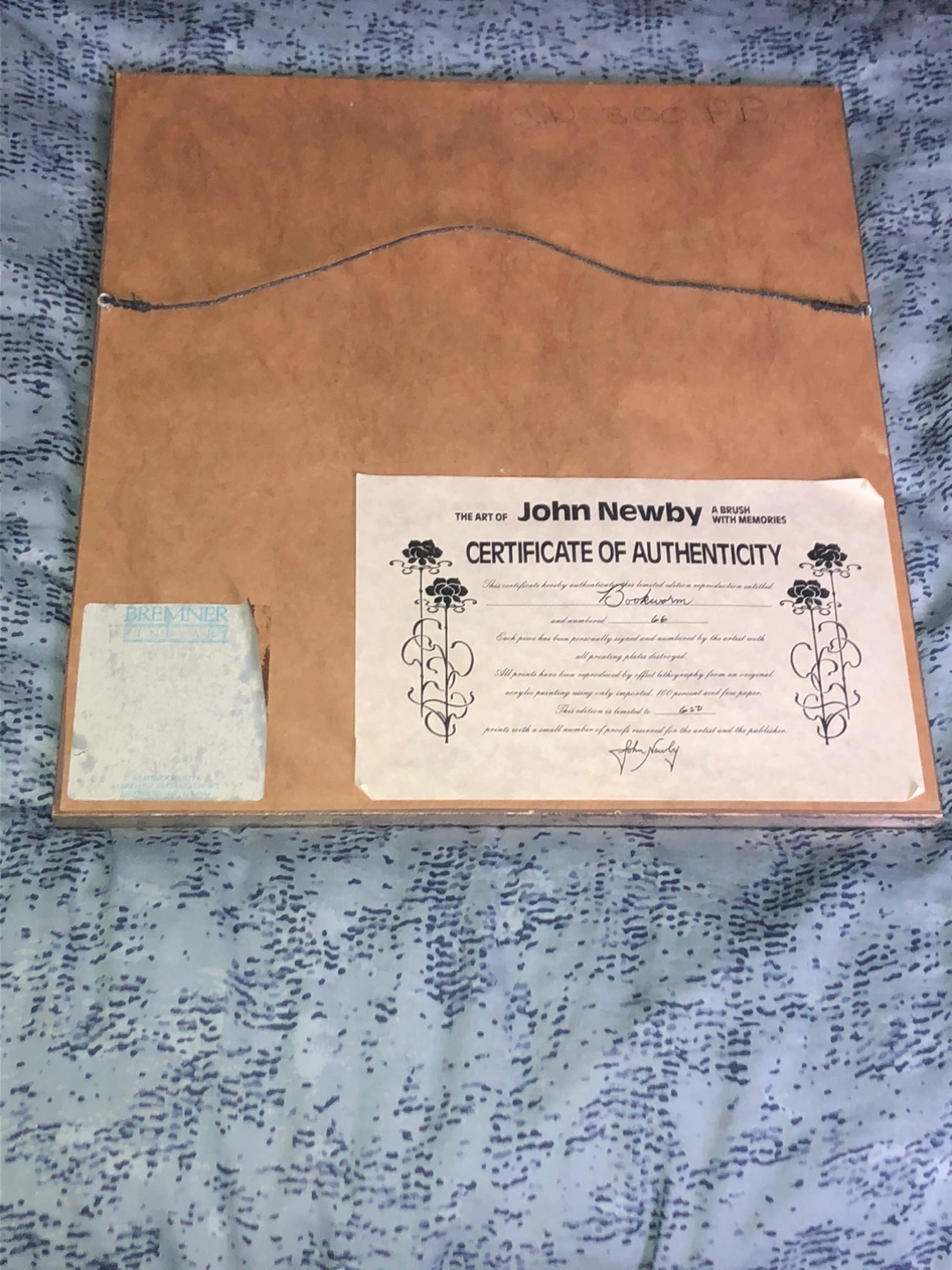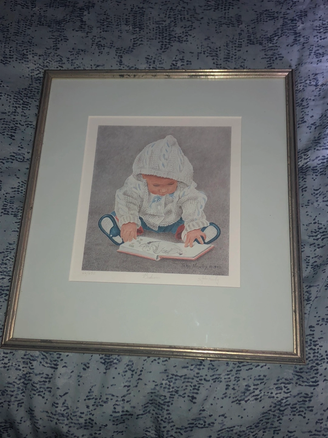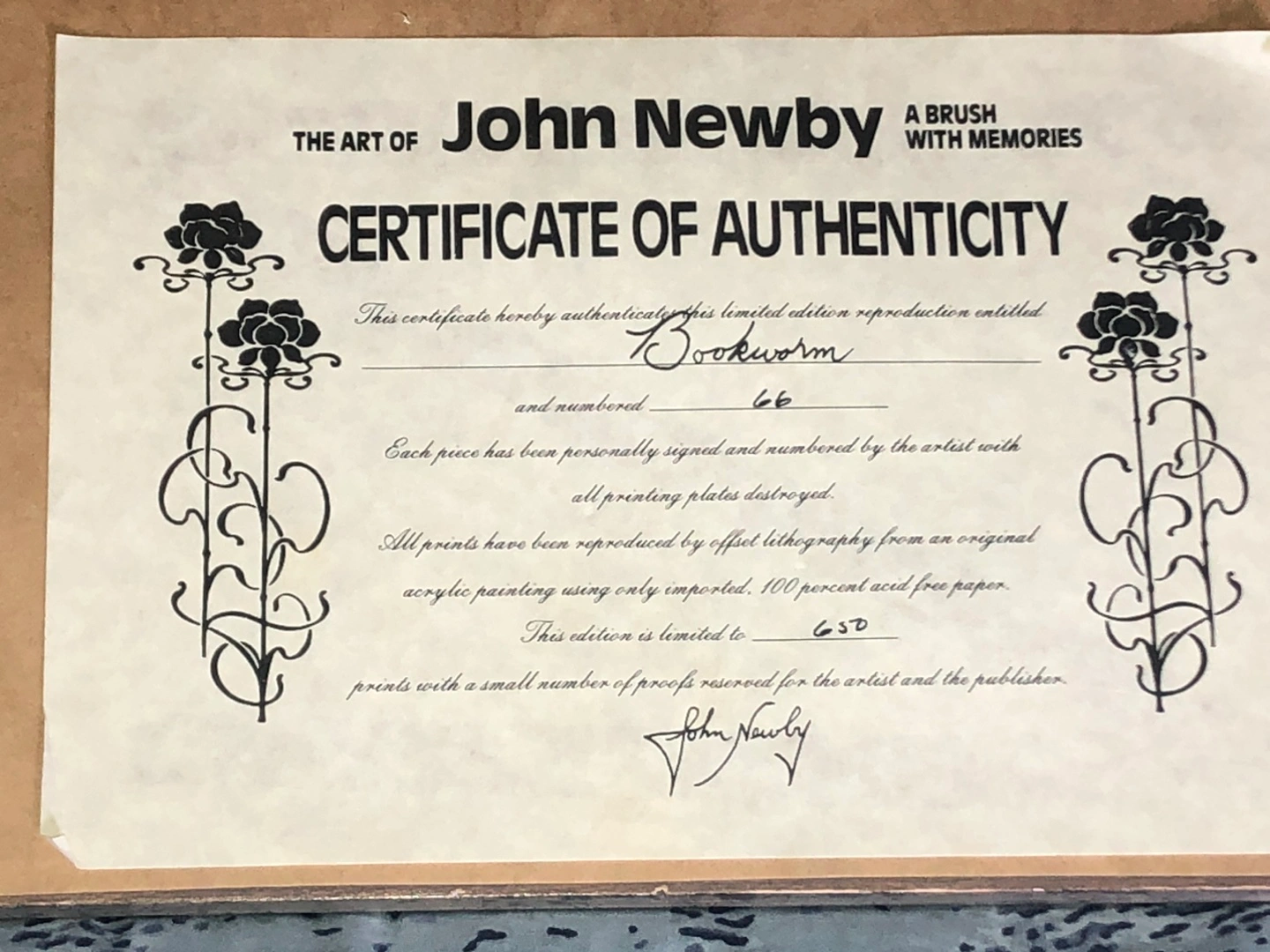 Selling a framed art print by John Newby titled 'Bookworm'. It comes with a certificate of authenticity. This is a limited edition reproduction, numbered 66 out of 650. A charming piece for any nursery or art collection!