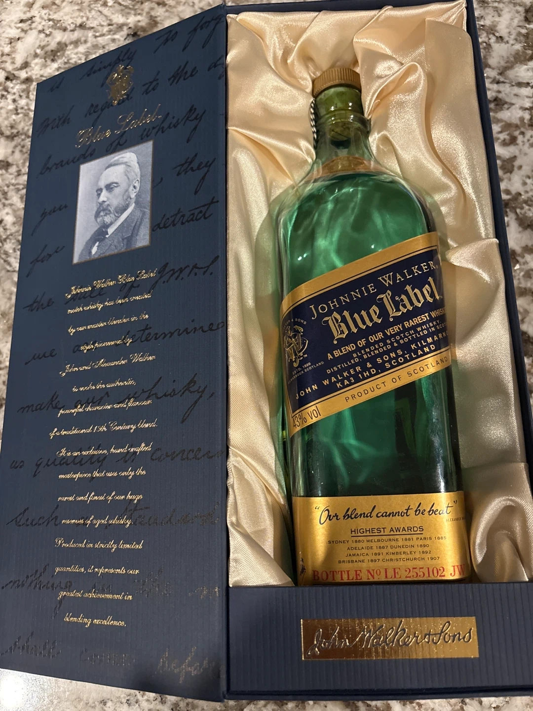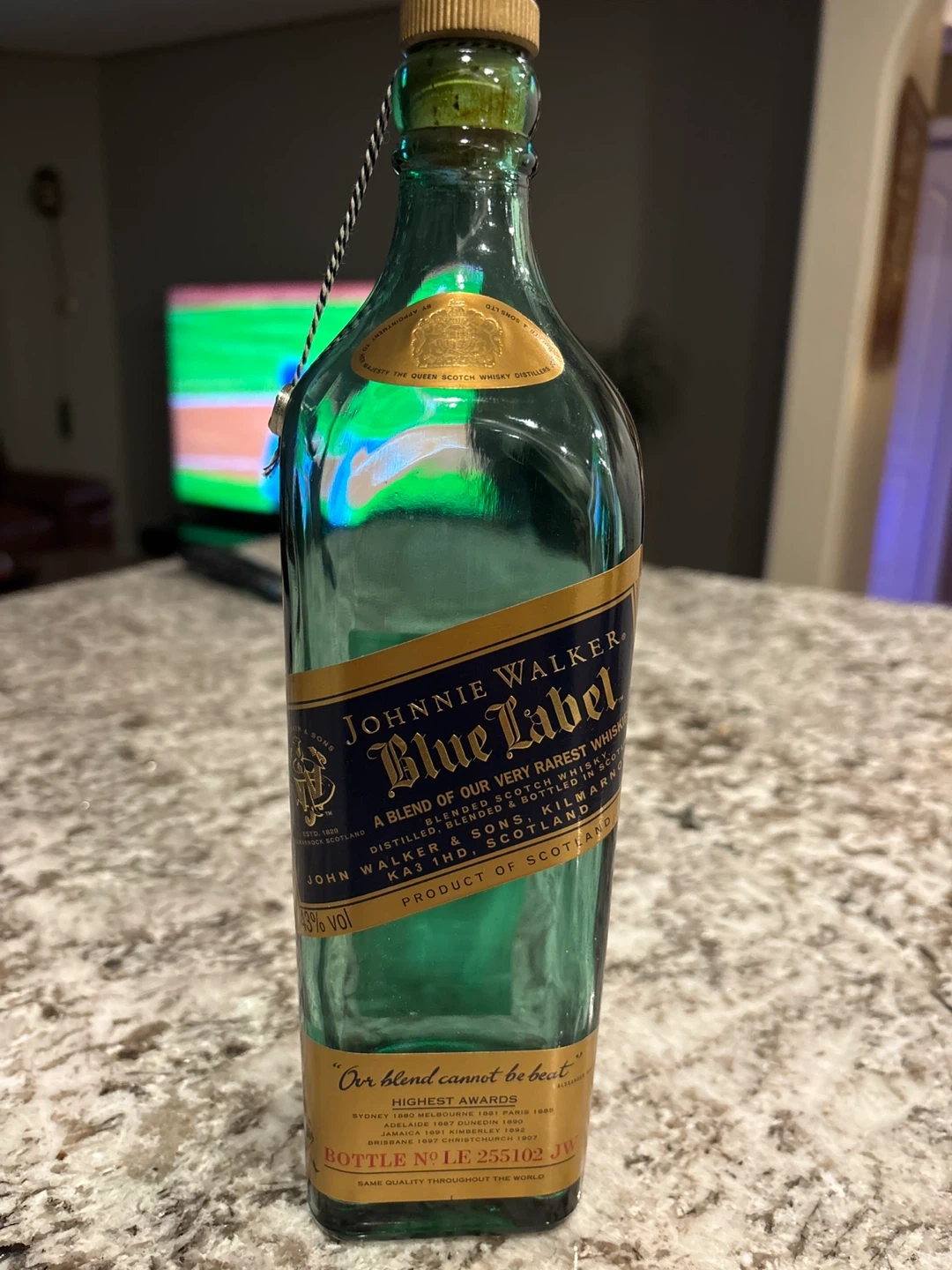10Selling an empty bottle of Johnnie Walker Blue Label Scotch Whisky. It comes with the original box. A blend of very rarest whiskies. Bottle No LE 255102 JW. Perfect for a collector or whisky enthusiast