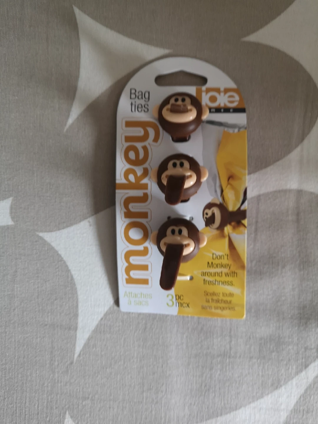 30Keep your snacks fresh with these adorable Joie Monkey bag ties! This set of 3 is perfect for sealing up bags of chips, cereal, or anything else you want to keep airtight. They can also be used to attach cables, napkins, flowers, etc. Cute and functional!