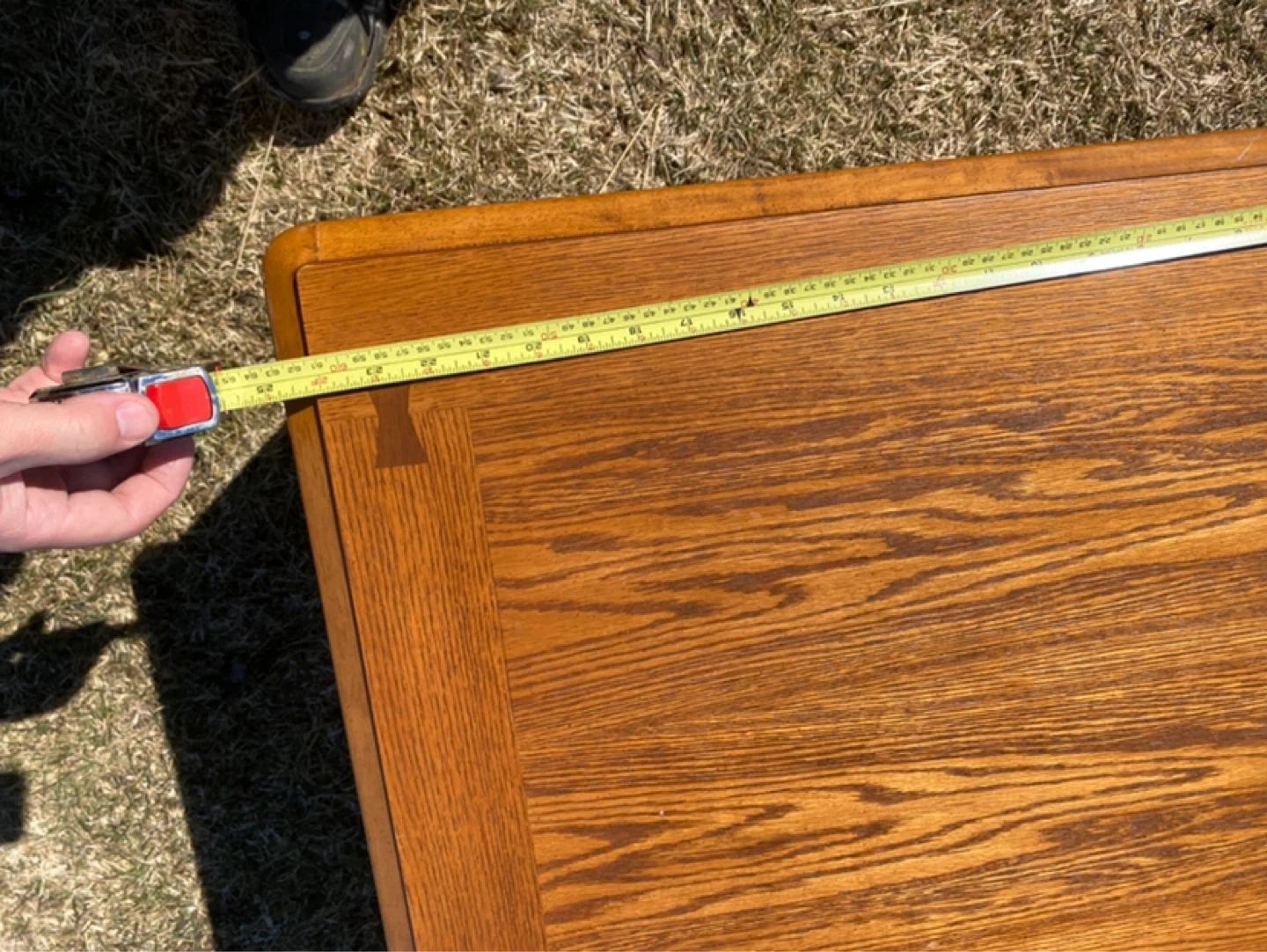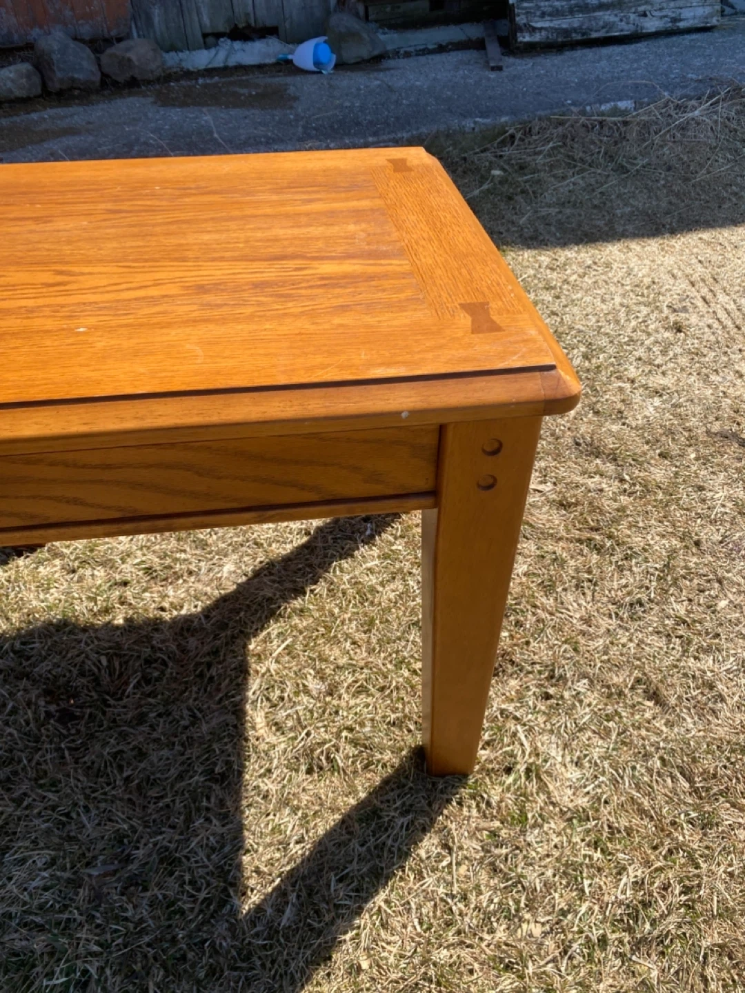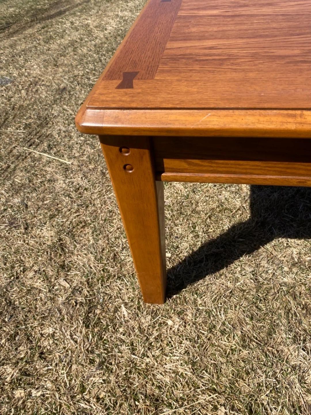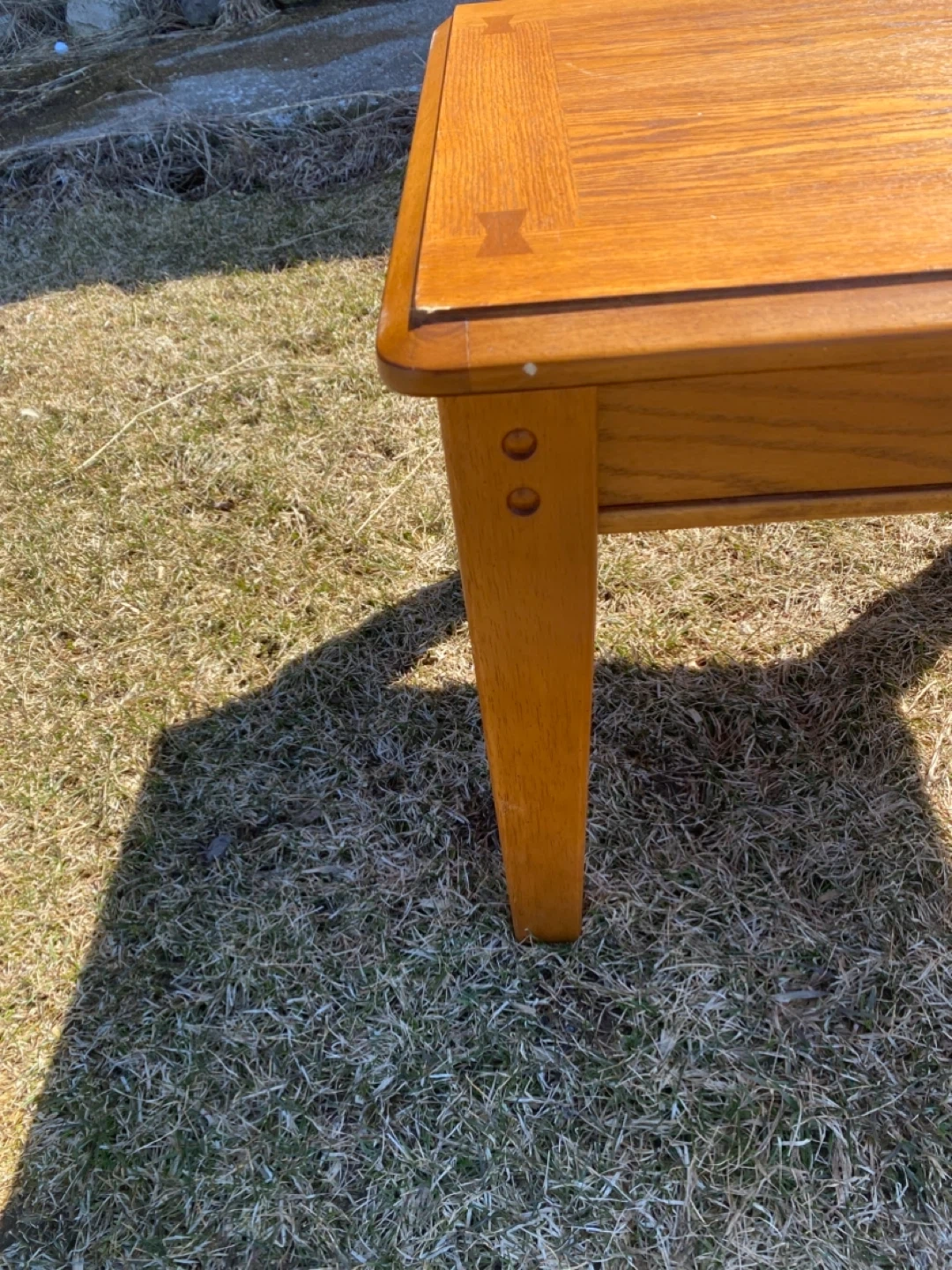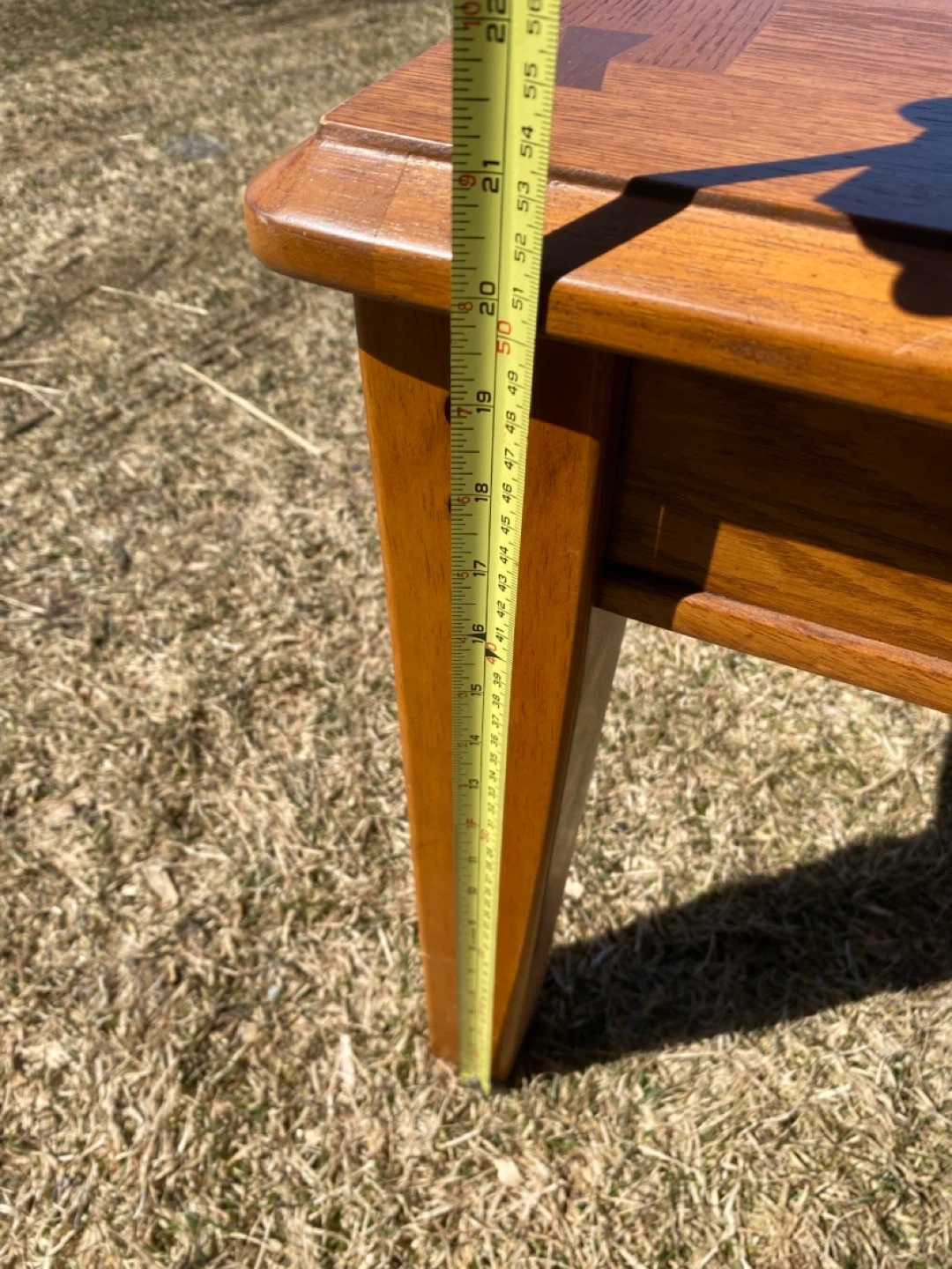 Wooden side table with a dark oak finish. The top has inlaid wood details. Table height is 21.5 inches. Table width is approximately 23 inches.
