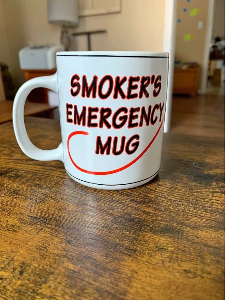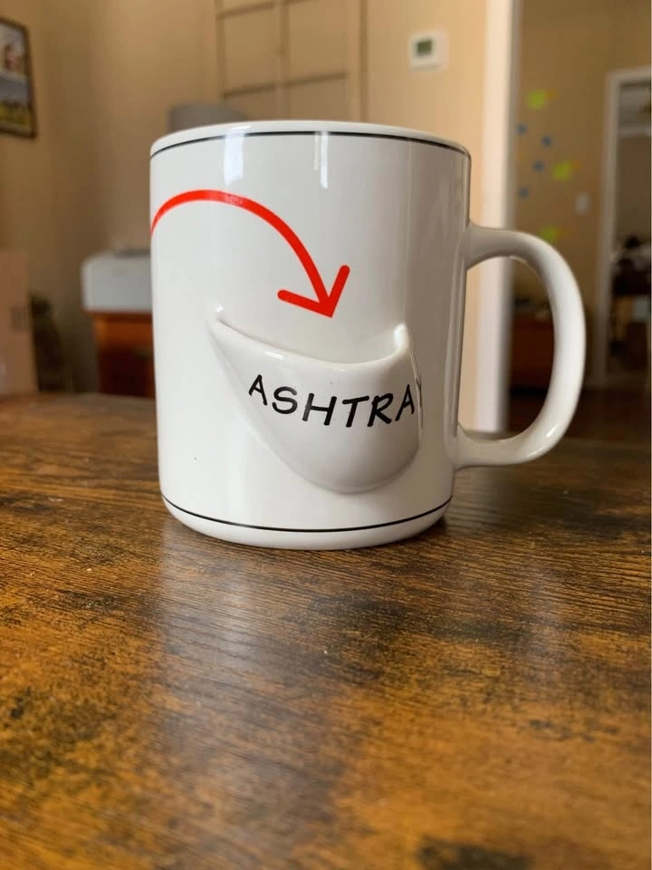 60Funny coffee mug with built in ashtray for smoking on the front porch.