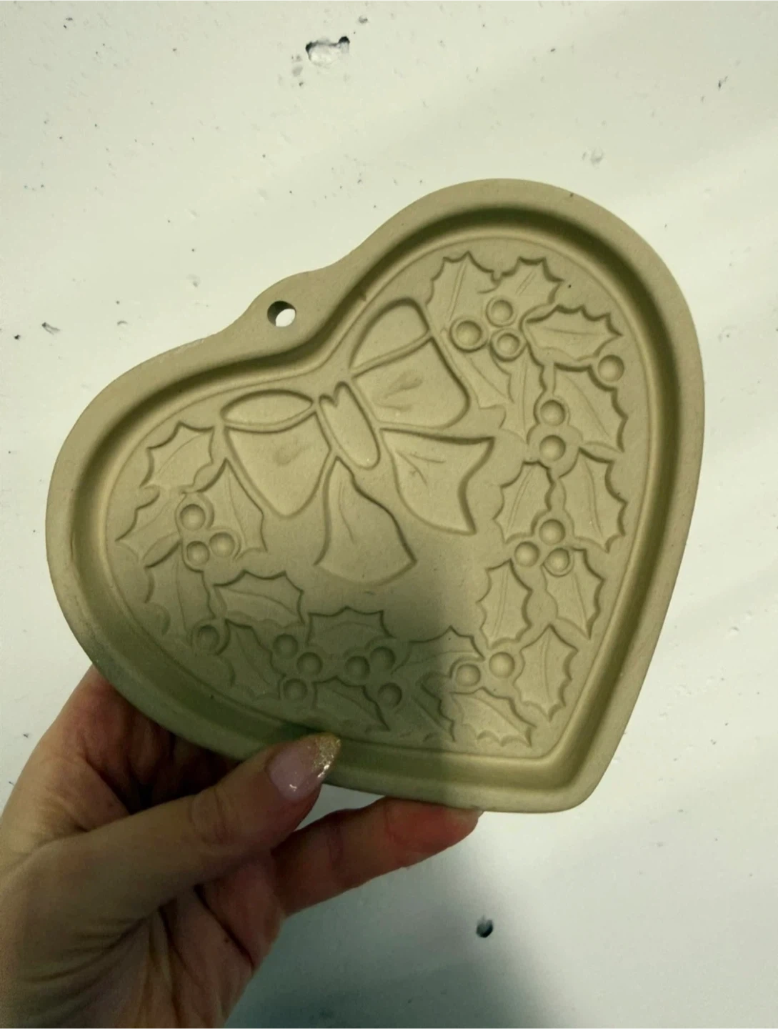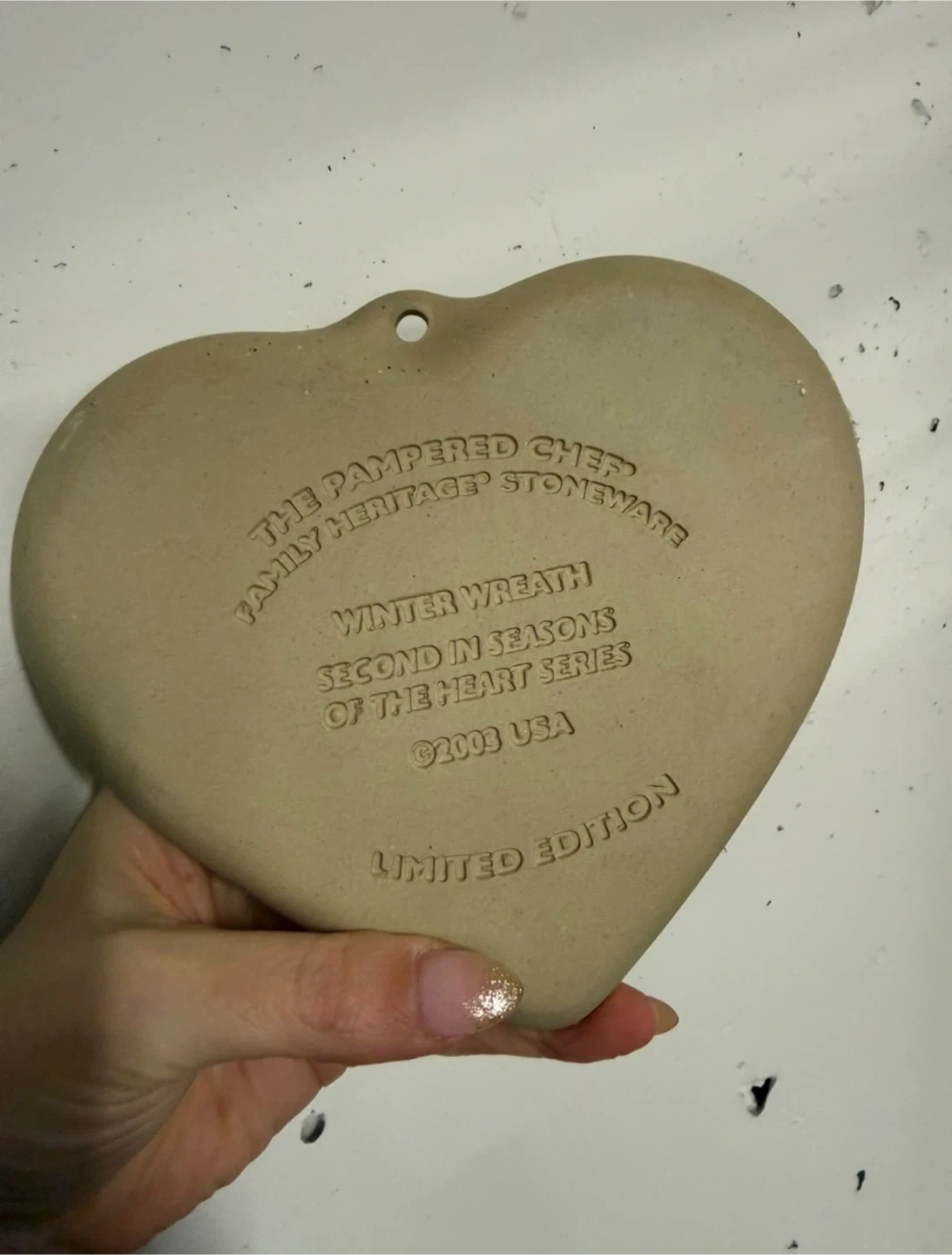 This is The Pampered Chef stoneware heart, part of the Winter Wreath series and Second in Seasons collection. It's a limited edition piece from 2003. This decorative item is perfect for seasonal display!