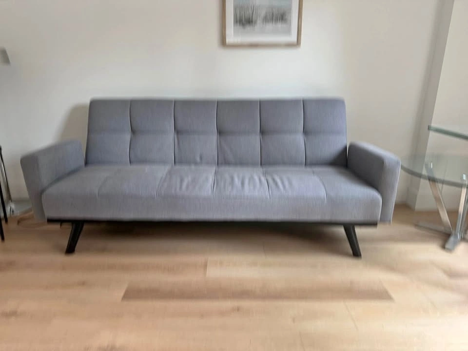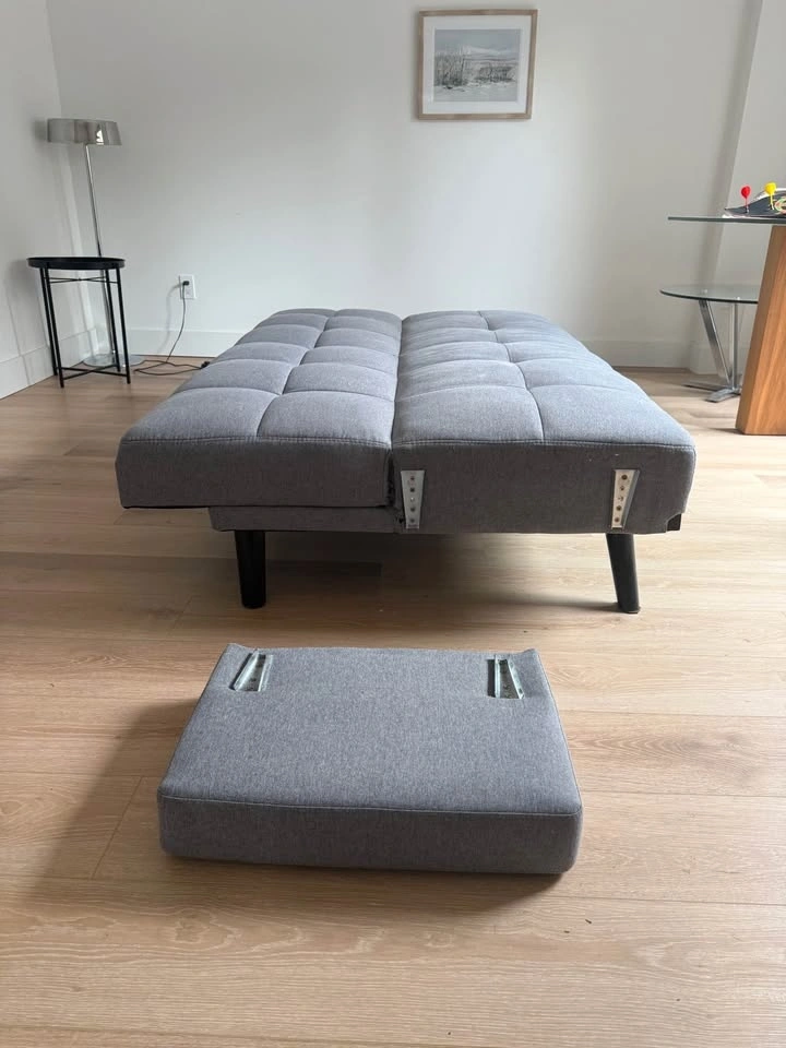 Mo’s Collection Heiderbed sofa / sleeper in grey fabric. Converts easily from sofa to bed and is comfortable and supportive. Clean, modern design with tufted cushions.