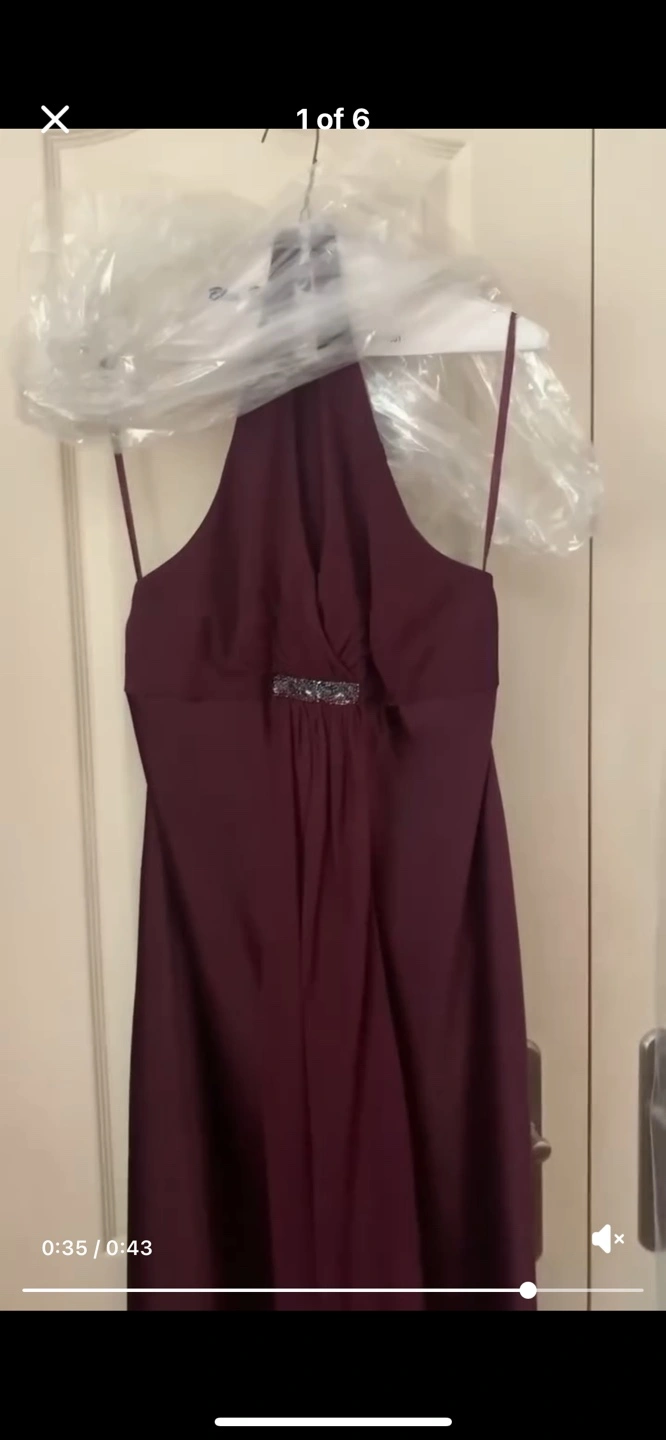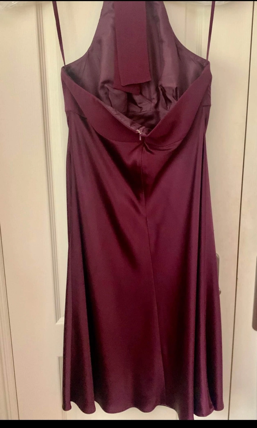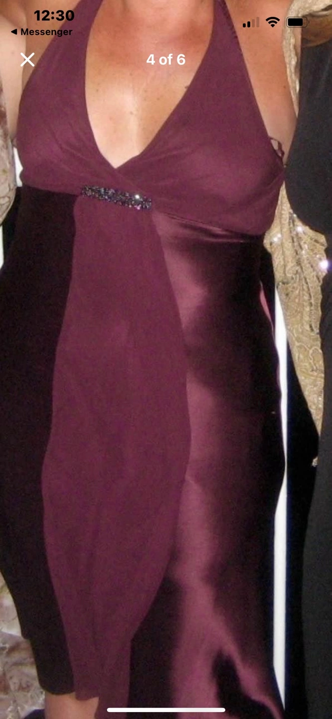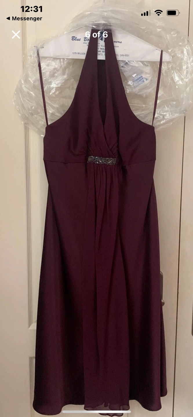 87Burgundy halter dress with a beaded detail at the bust. Size 12, mid length, below the knee Like new. Dry Cleaned
