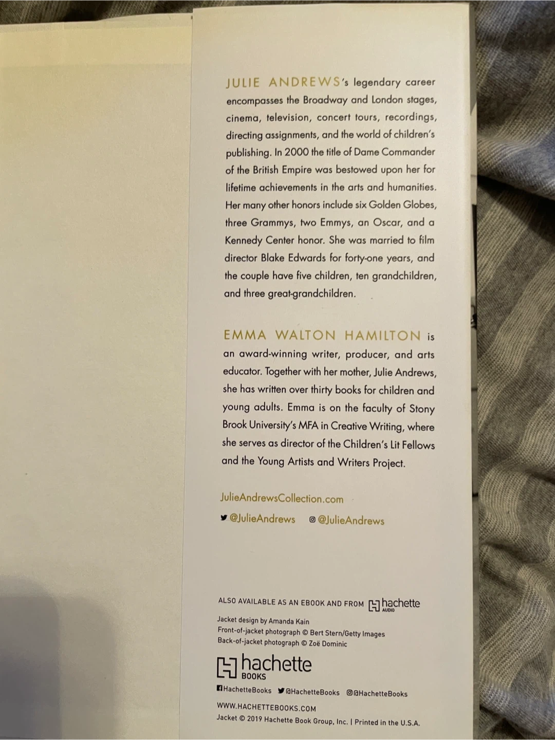 Hard cover. This is Julie Andrews' memoir detailing her Hollywood years and career. It covers her arrival in Hollywood, famous roles, and personal life. Authored by Julie Andrews with Emma Walton Hamilton.