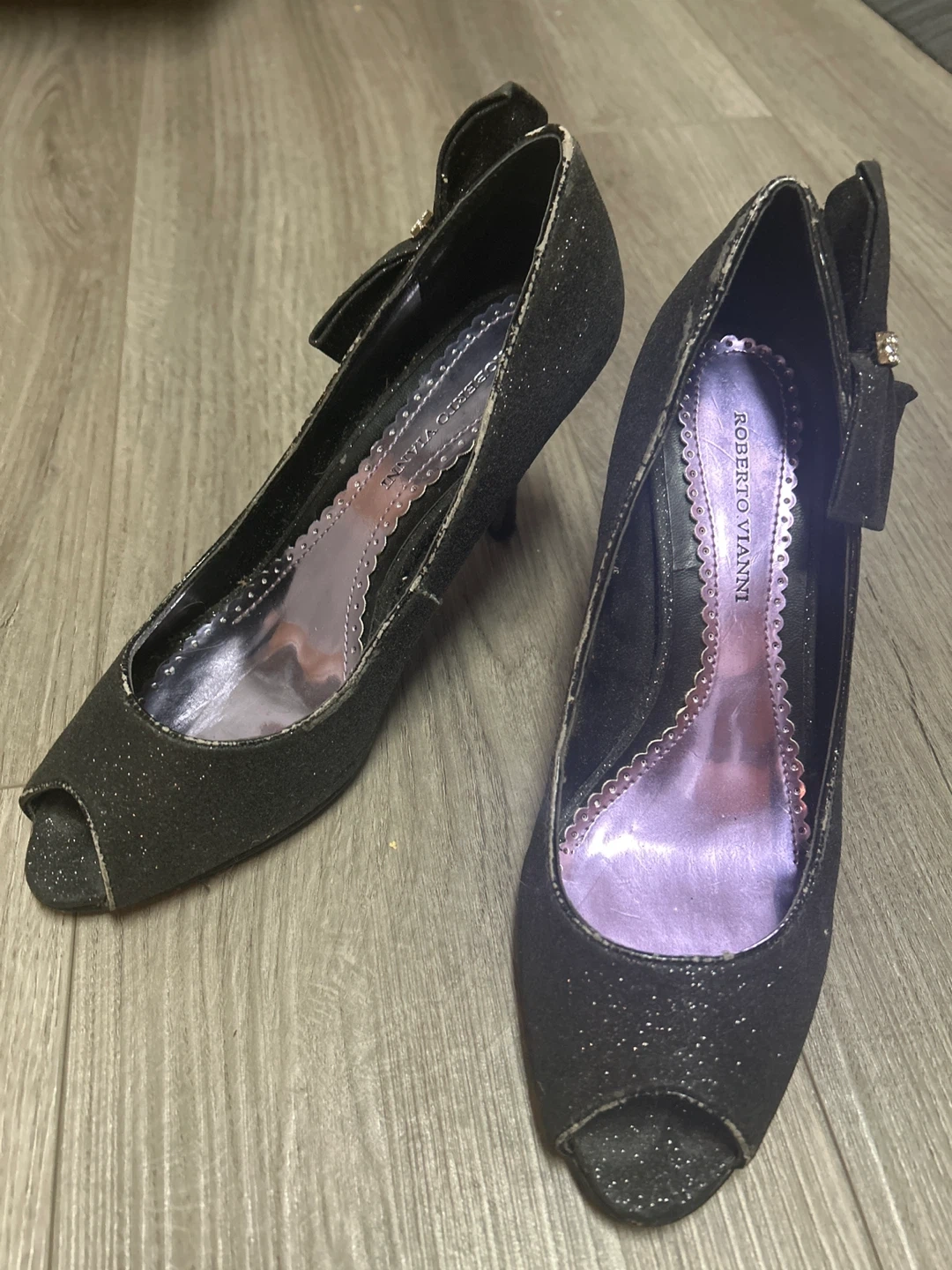 Sparkly black peep-toe heels from Roberto Vianni. They feature a decorative bow with a rhinestone accent on the back. Perfect for dressing up an outfit!