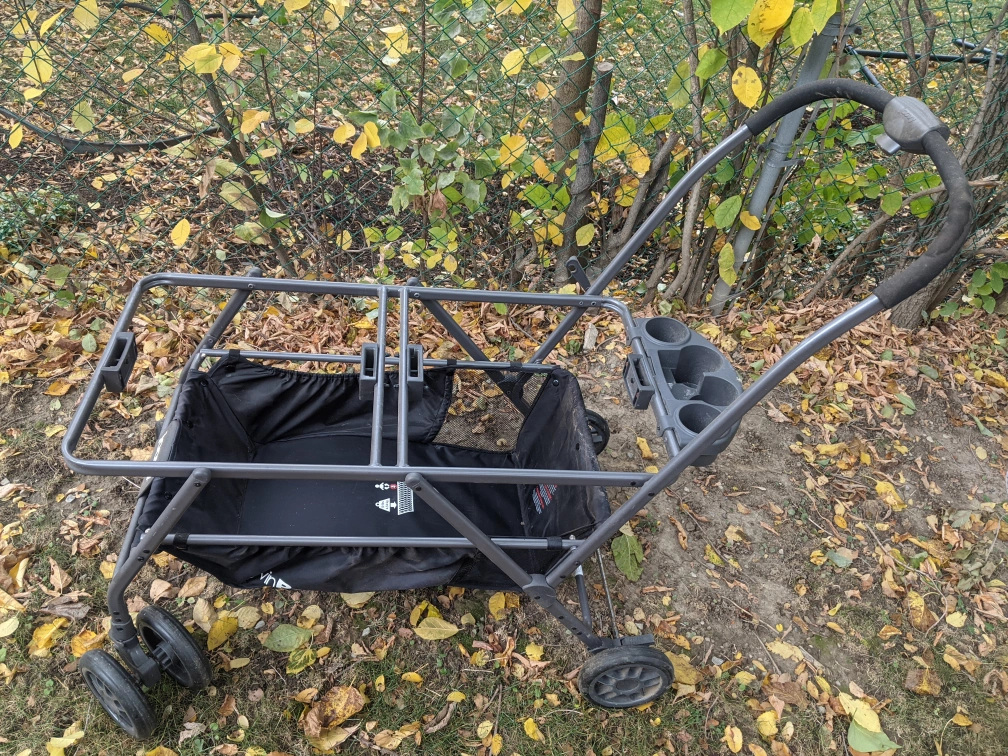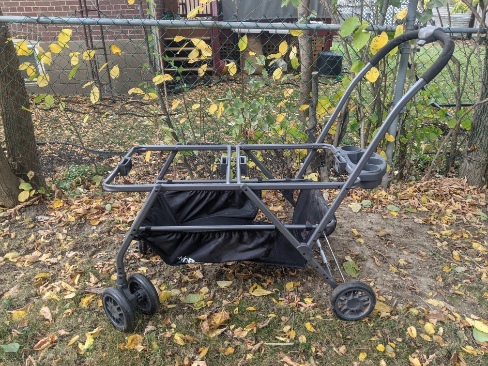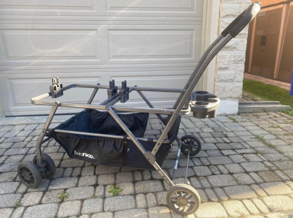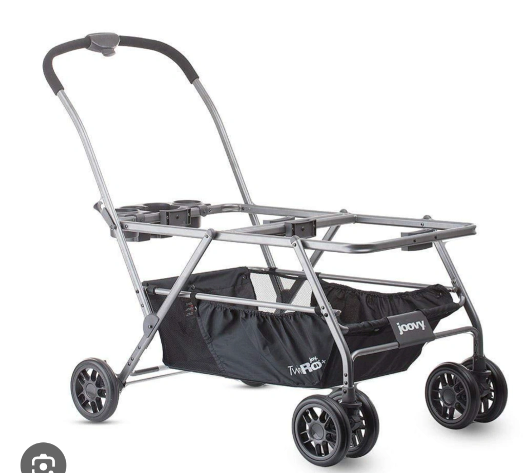 26Double stroller frame in good condition. Includes cup holders and a storage basket. Suitable for two car seats.