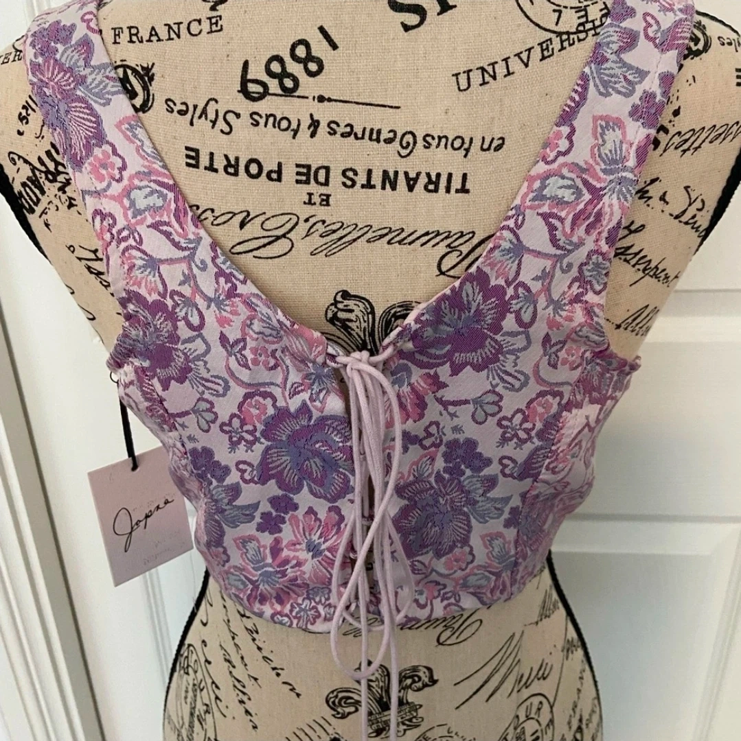 125Selling a cute Jopara corset top in a lovely floral pattern! It's a size S/P and features a lace-up front. Perfect for adding a touch of charm to your wardrobe Would most likely fit a medium too as its adjustable Nwt