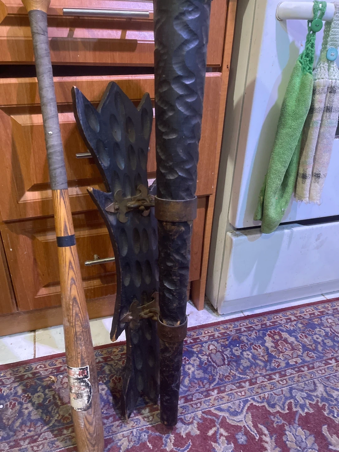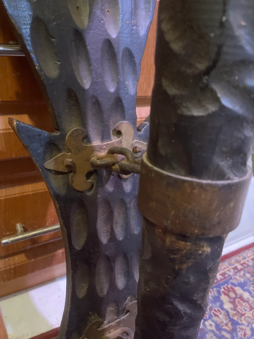 This unique sculpture features carved dark wood with intricate metal chain and accent details. It stands as a striking decorative piece. The dark wood has a rustic, textured finish