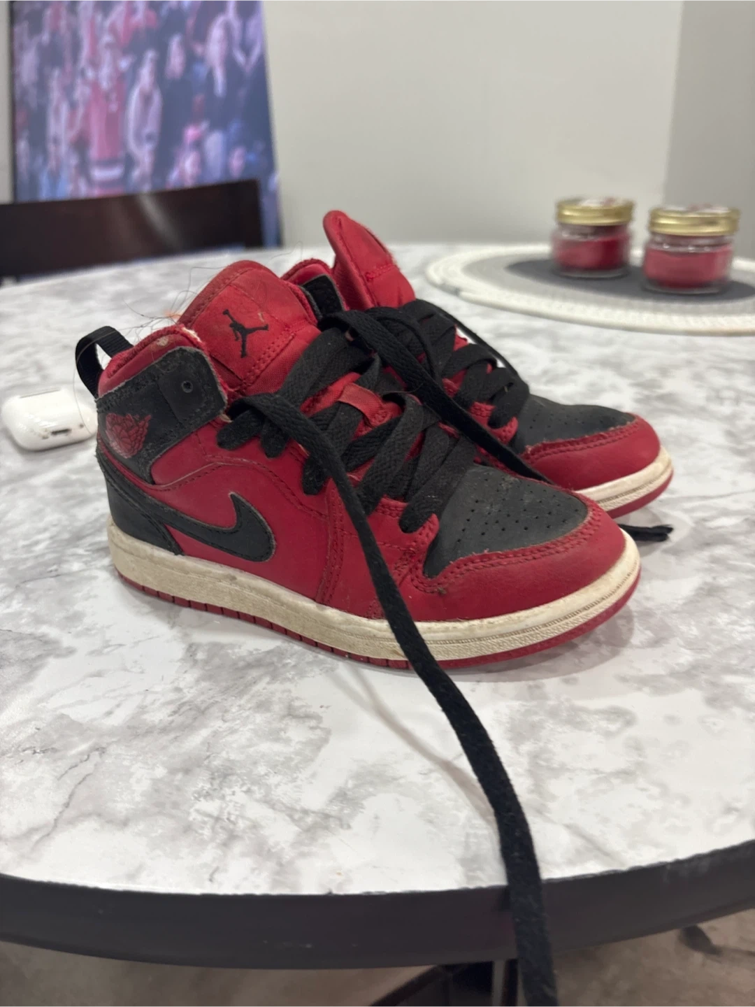 65Selling a pair of toddler-sized Jordan 1 Mid sneakers in red and black. They're in good condition and ready for a new home!