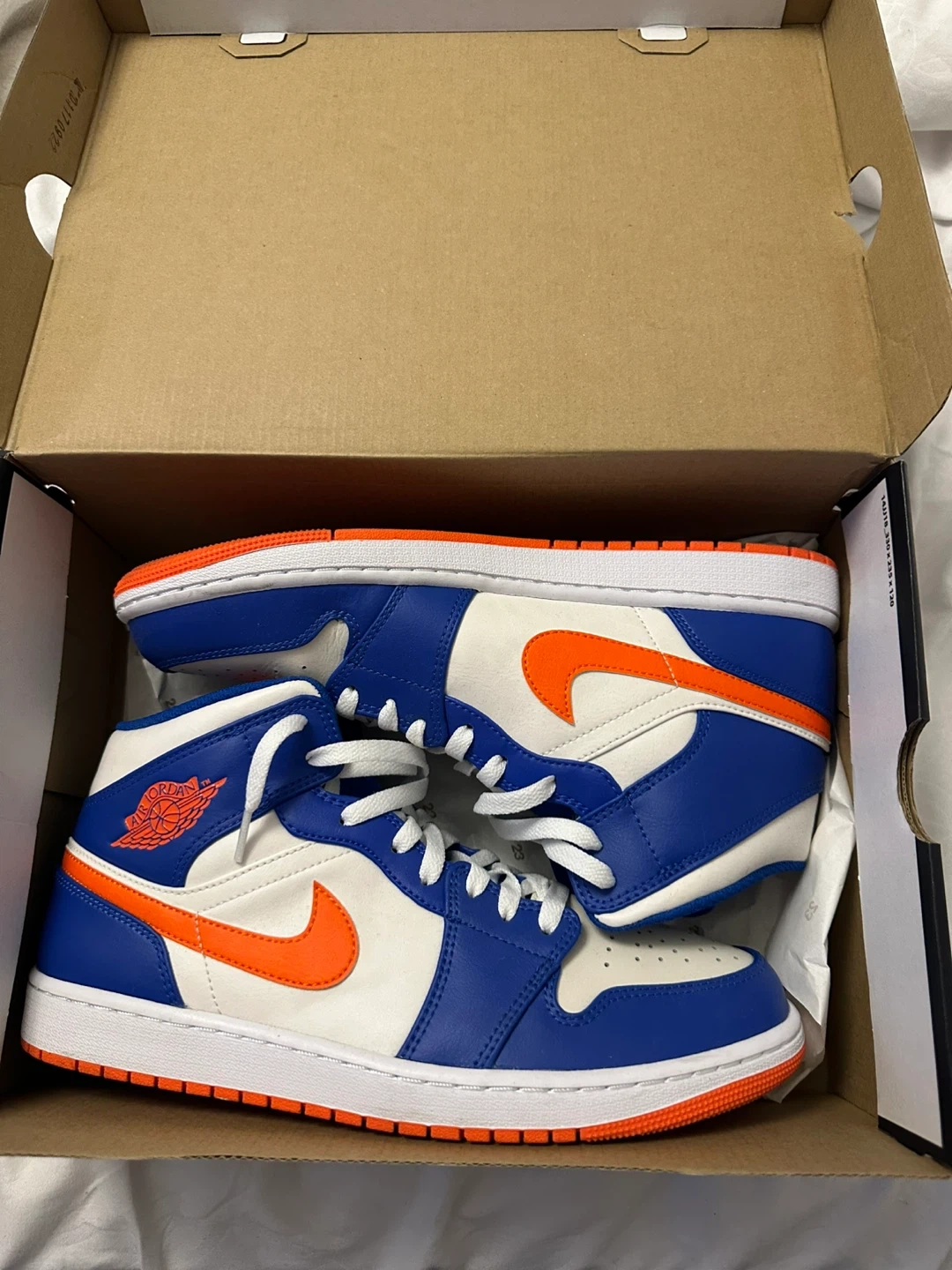 15Air Jordan 1 Mid in Hyper Royal and Orange! These shoes are in excellent condition and come with the original box. A great addition to any sneaker collection!