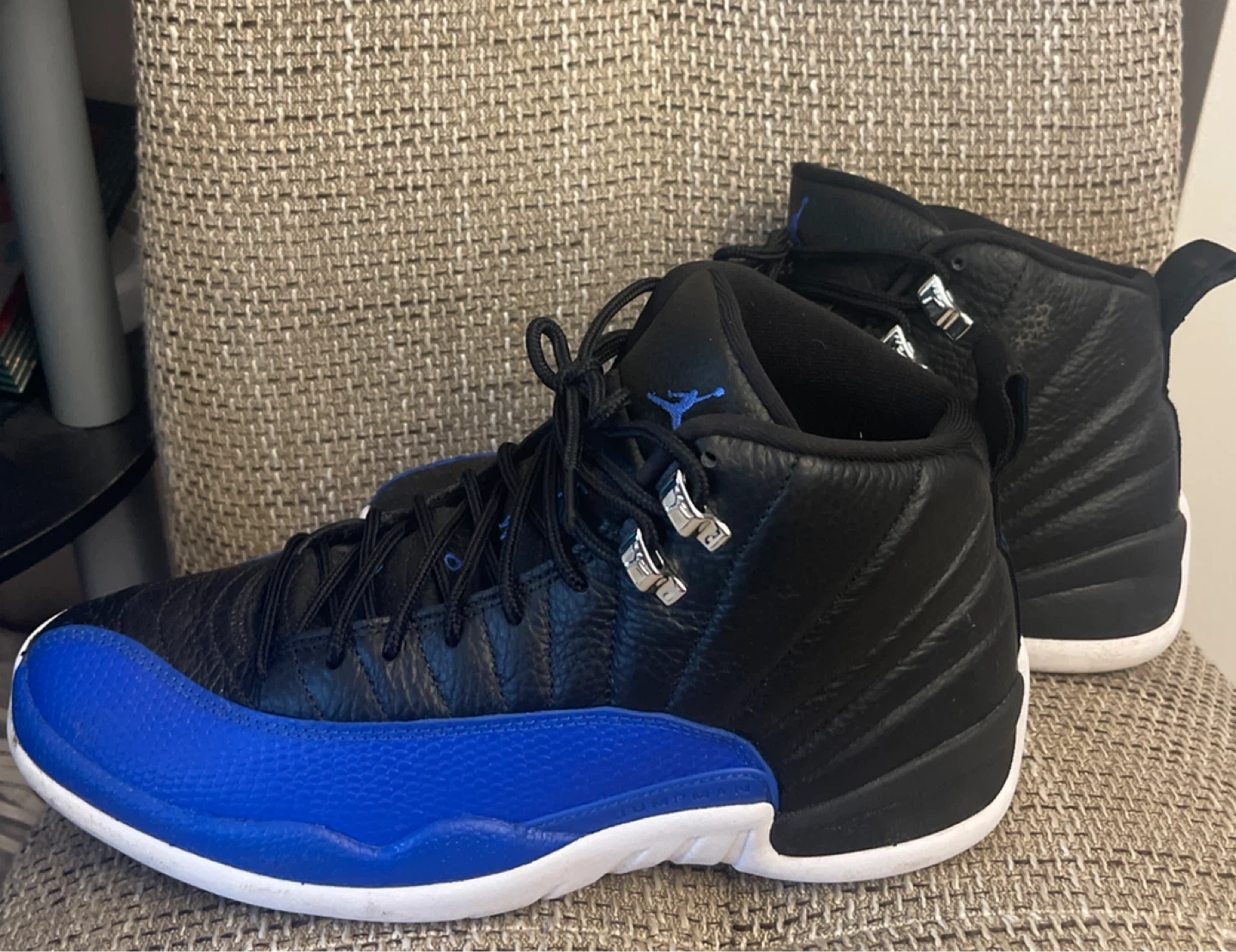 Selling a pair of Air Jordan 12 Retro sneakers in black and royal blue. These shoes are in great condition and feature the classic design with the number 23 on the heel. Woman’s size 11 (Men’s size 9.5)