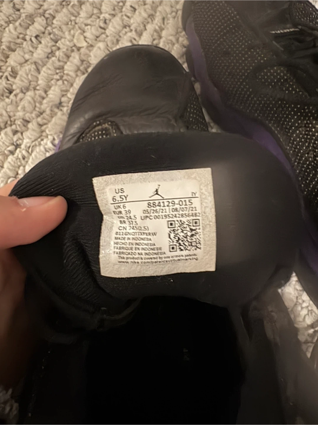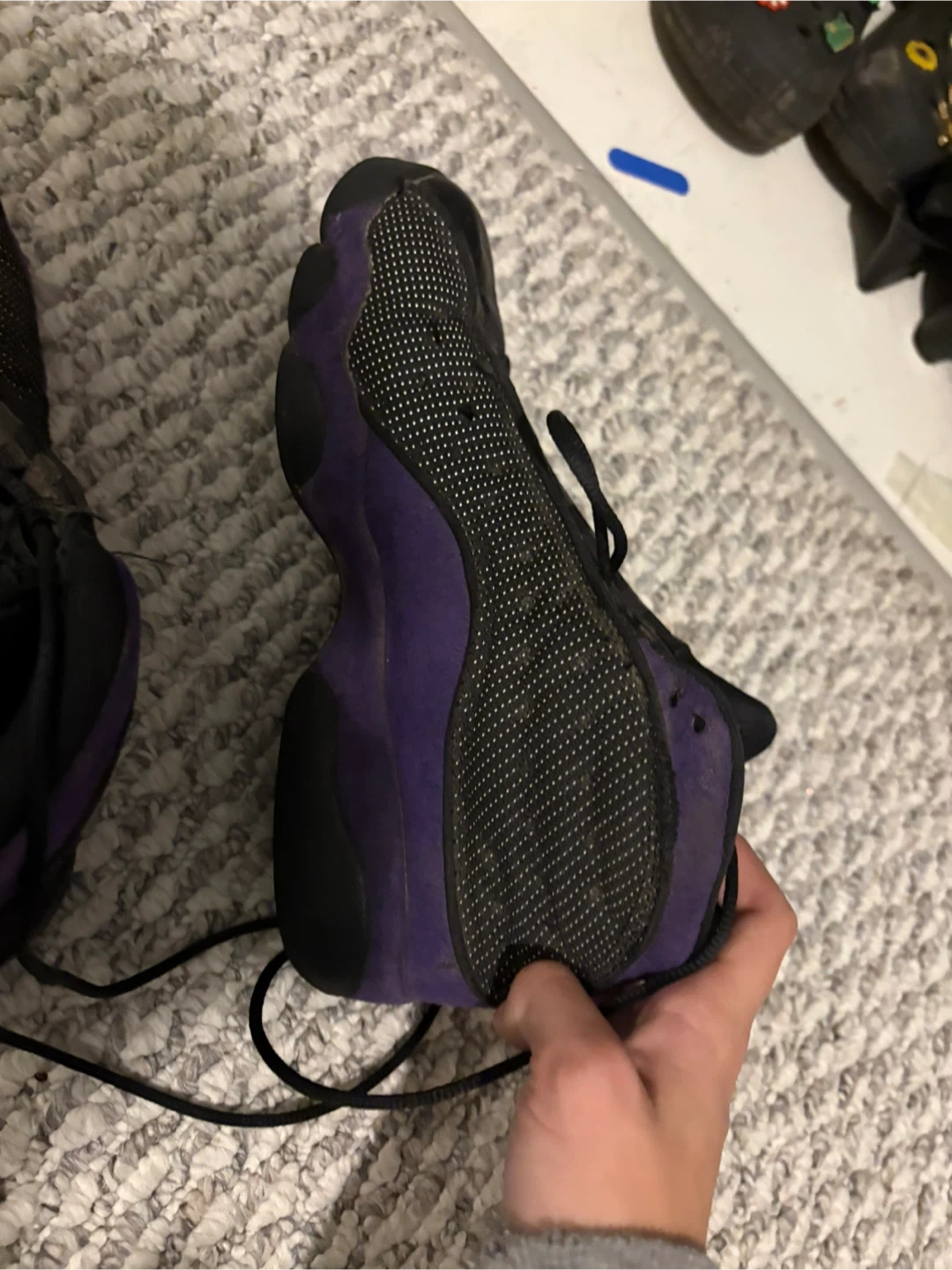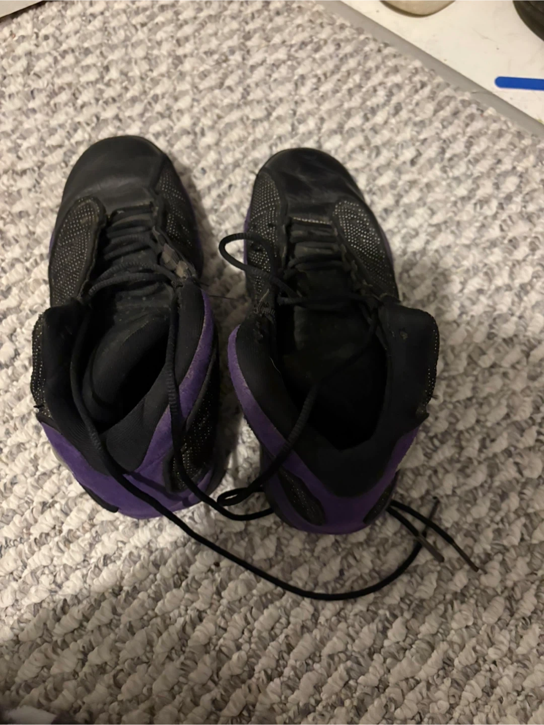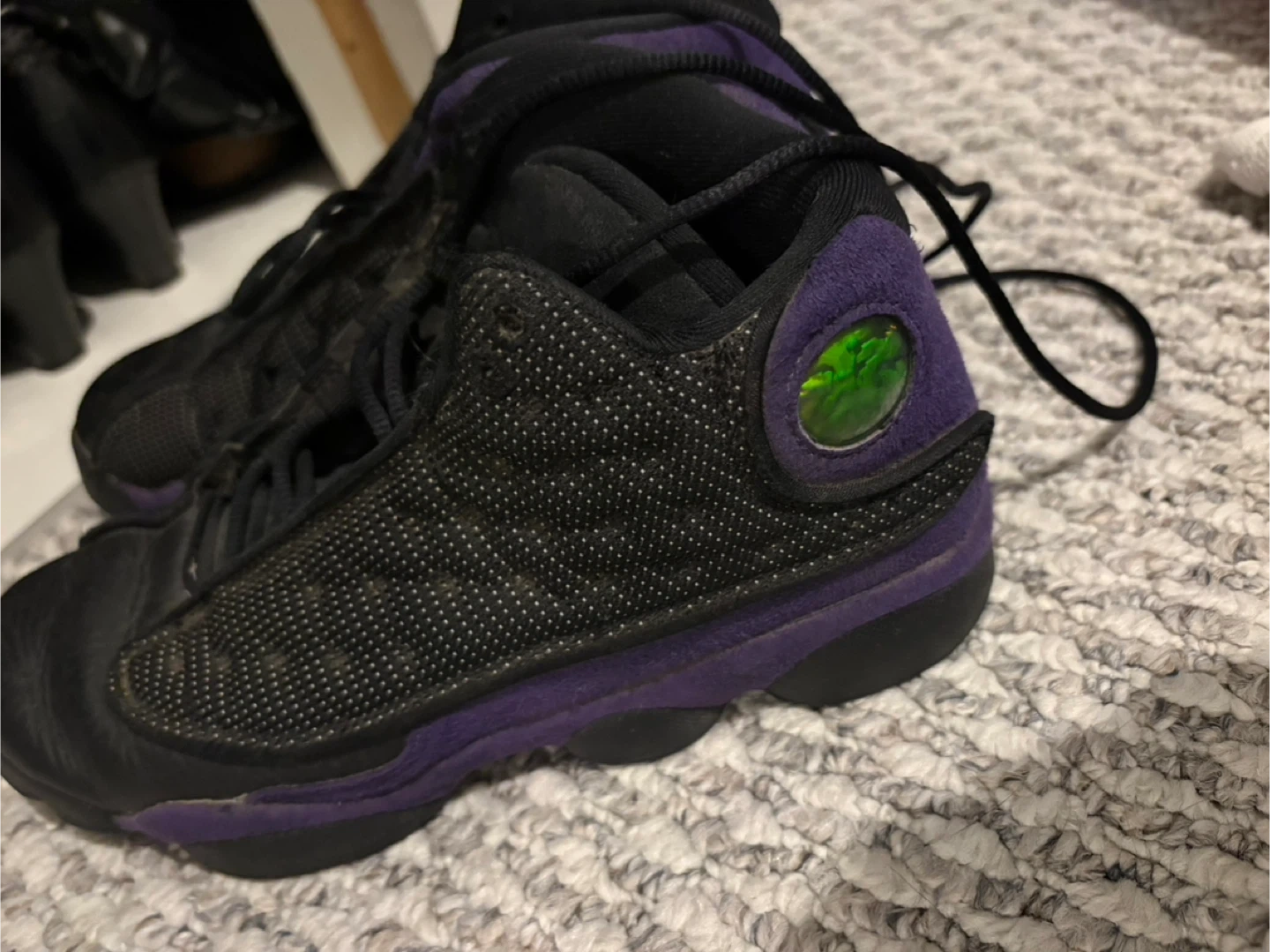 10Selling a pair of Jordan 13 Retro sneakers in black and purple. They are a youth size 6.5. There are some signs of wear, as shown in the pictures, but they're still in good condition for everyday wear!