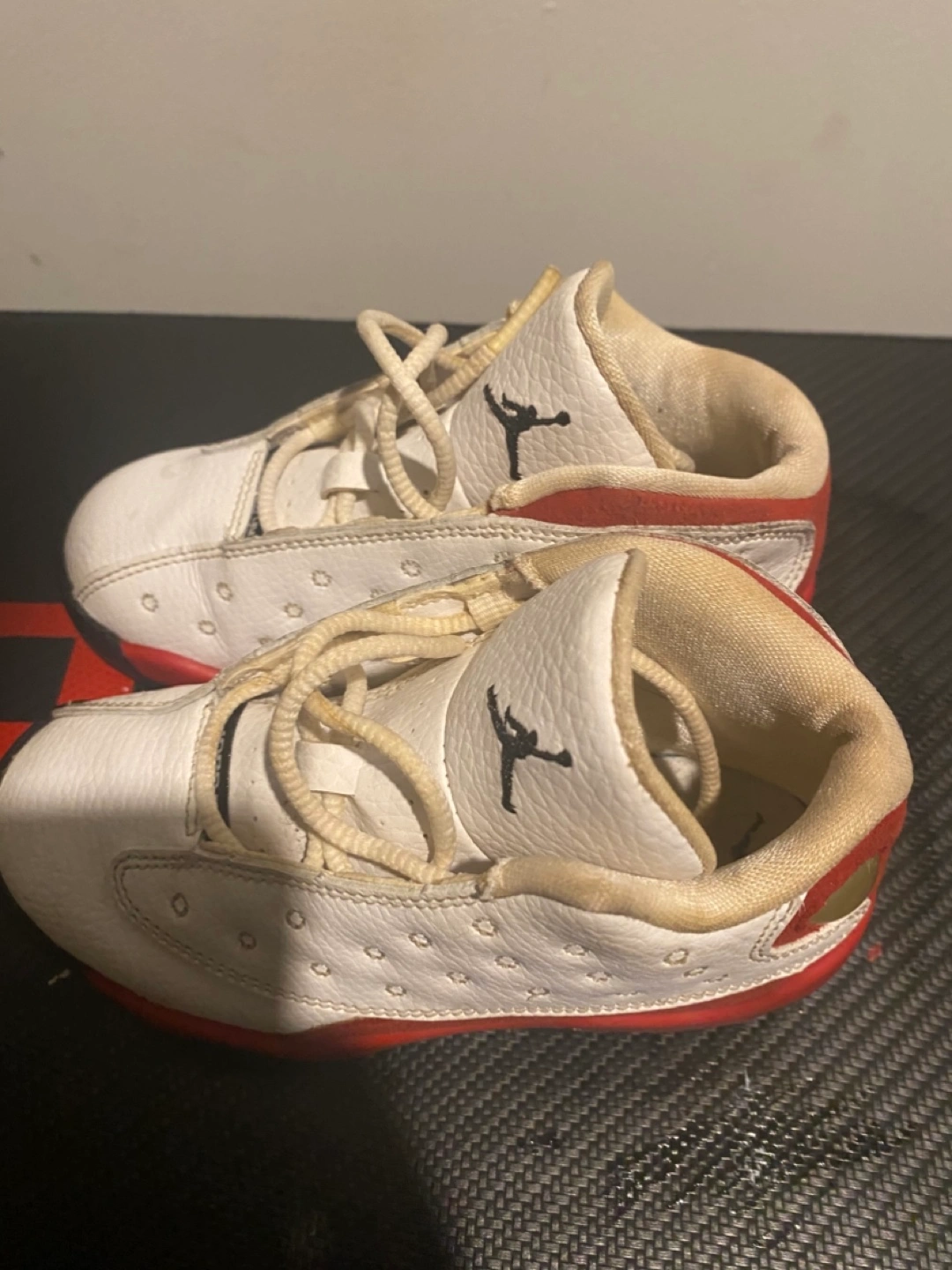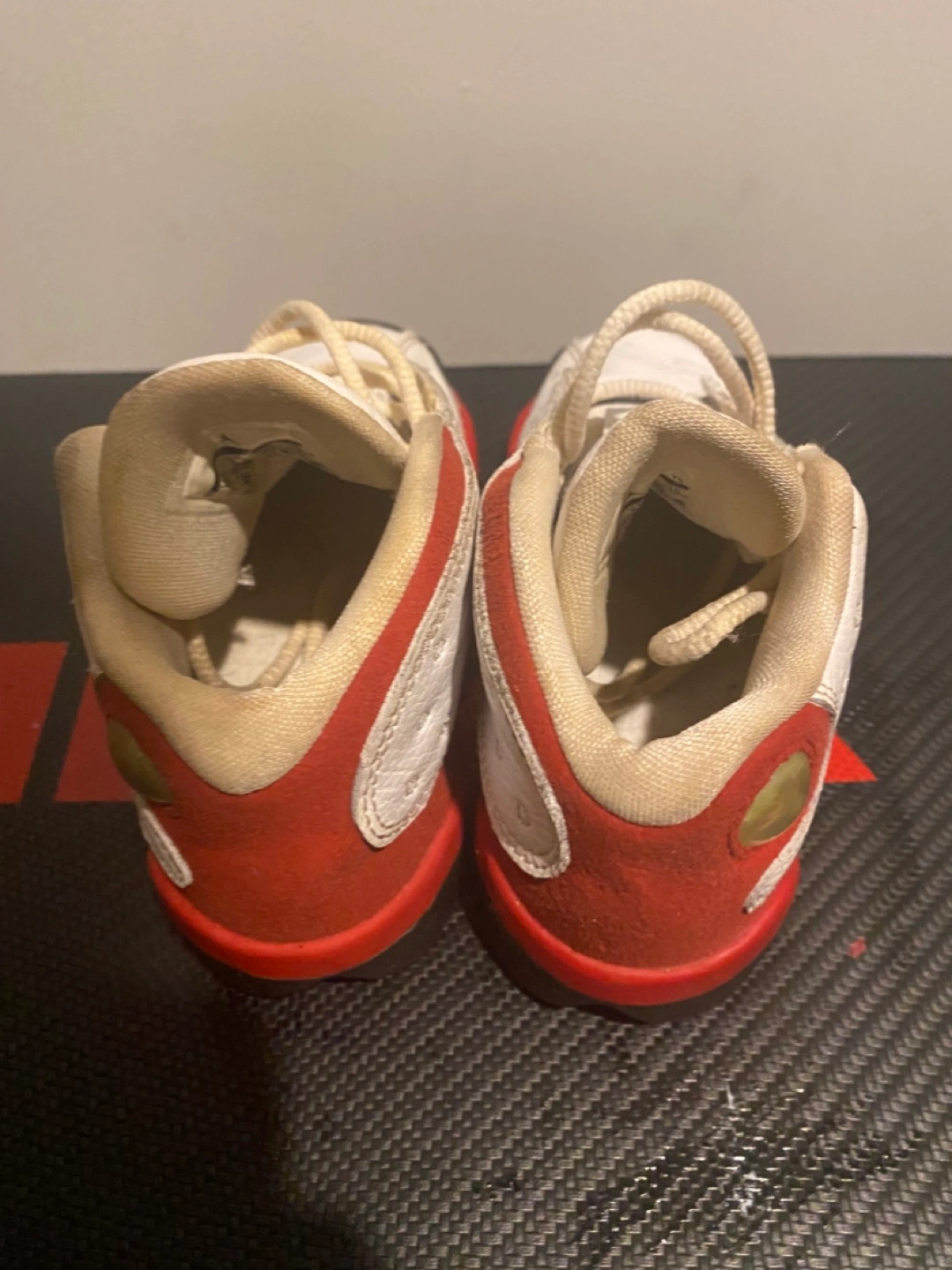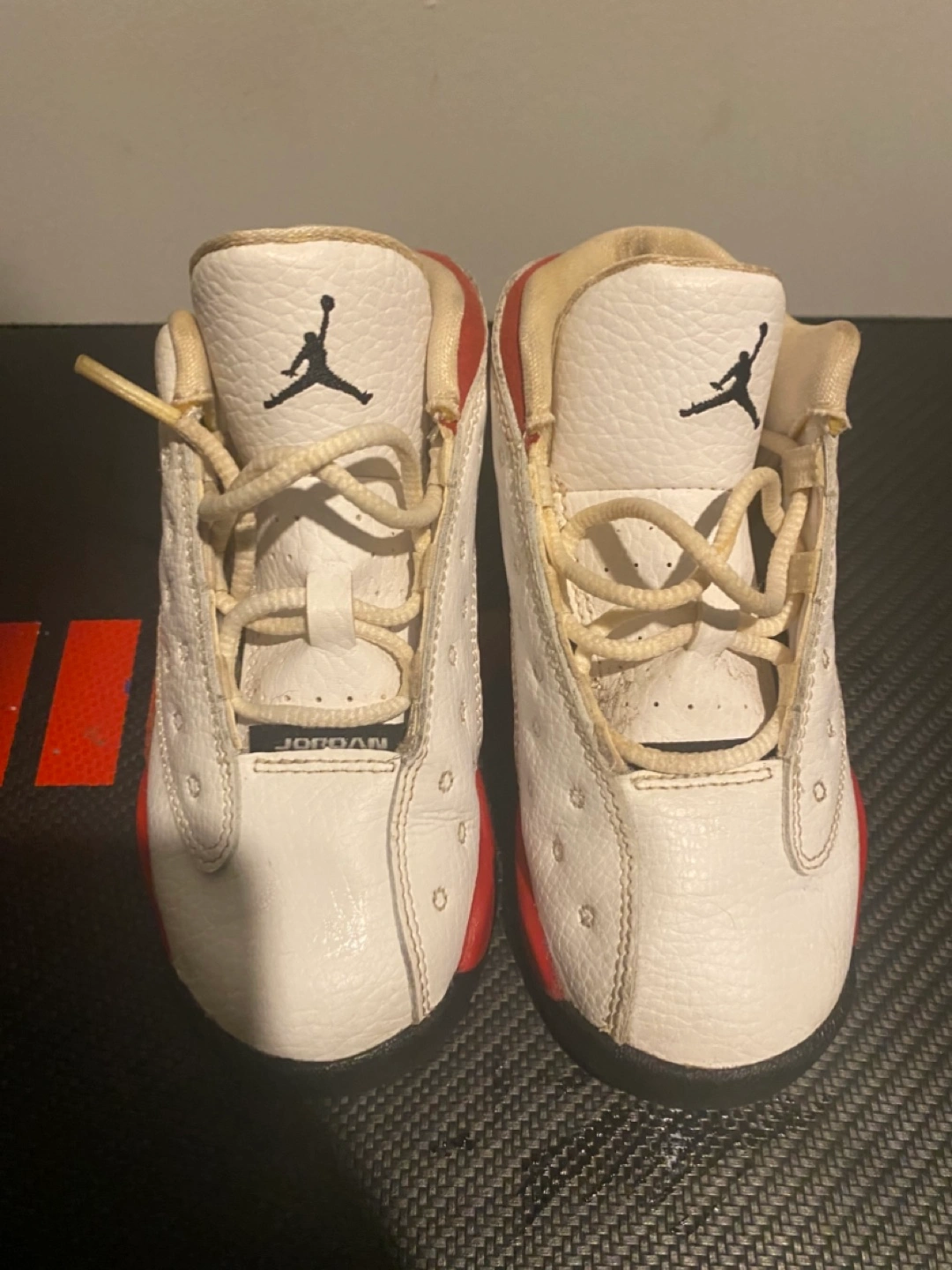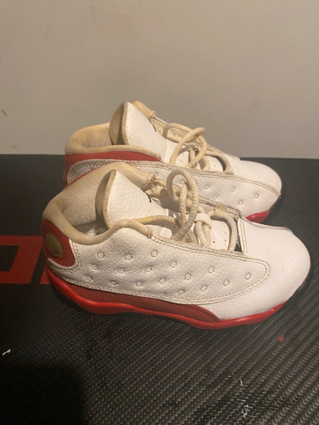 13Selling a pair of Jordan 13 Retro kids shoes in white and red! They are in used condition. The size is 9C.