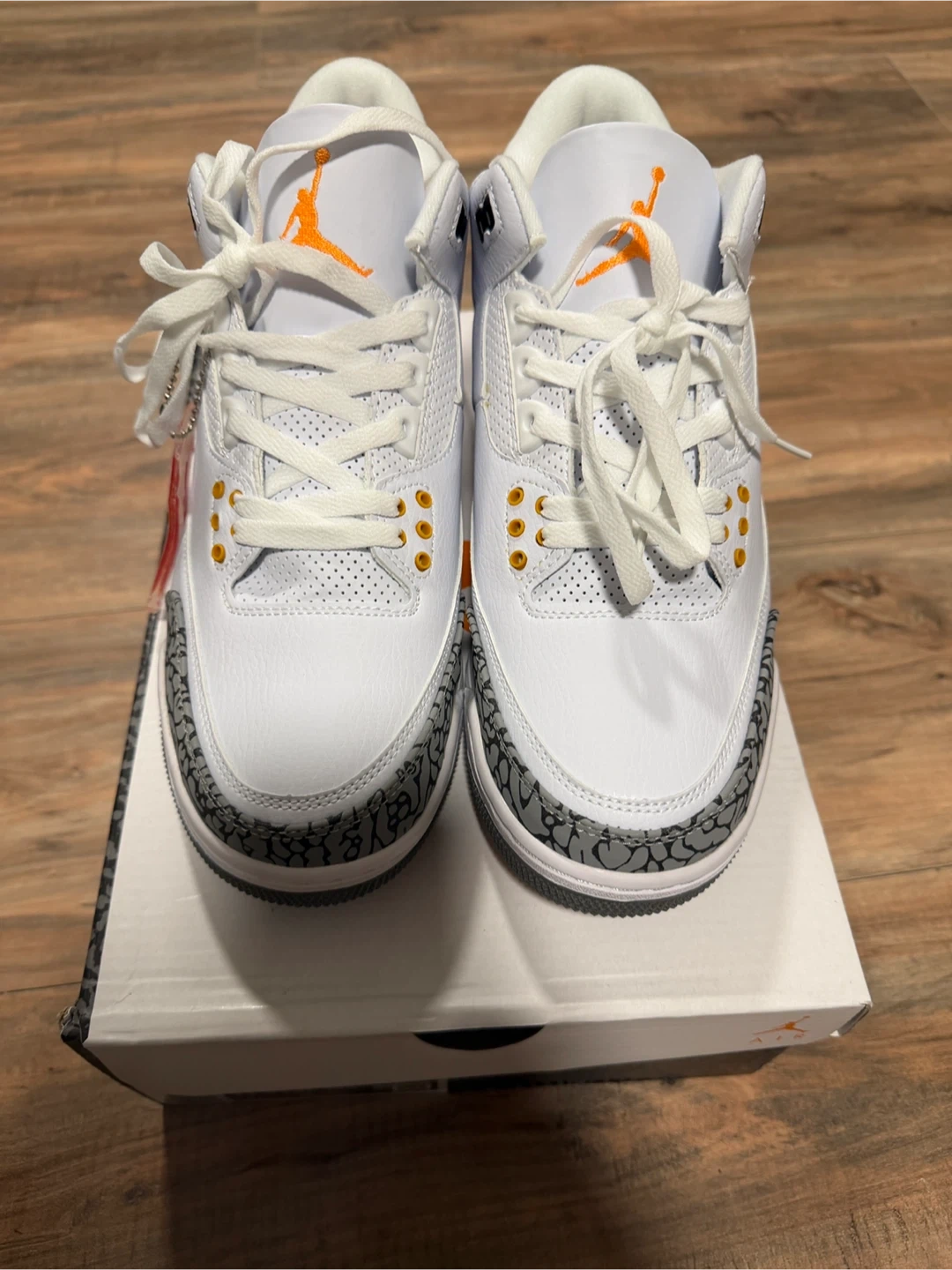 113Selling a pair of brand new Jordan 3 Retro shoes in a clean white and orange colourway! These are in perfect condition and come with the box. The classic design and vibrant accents make them a standout addition to any sneaker collection.