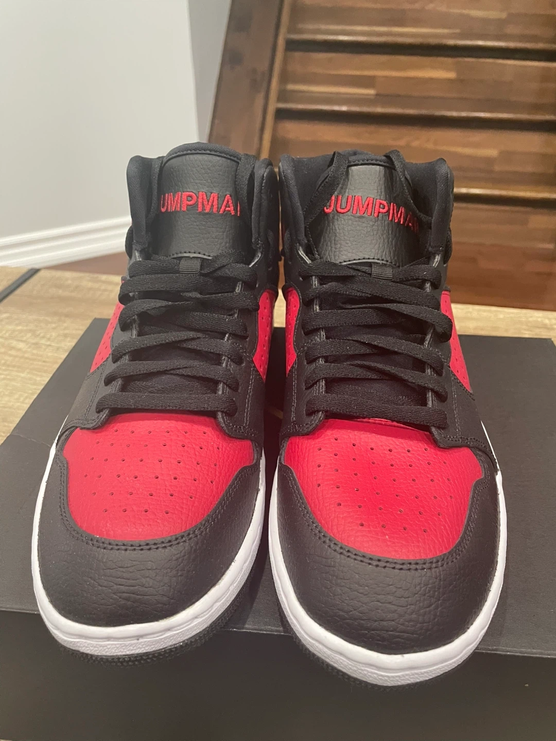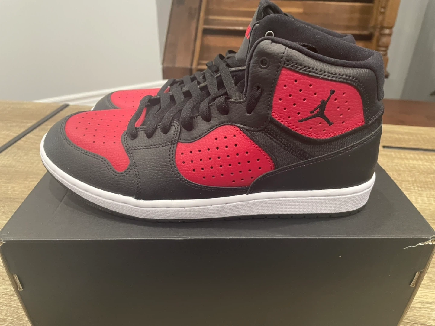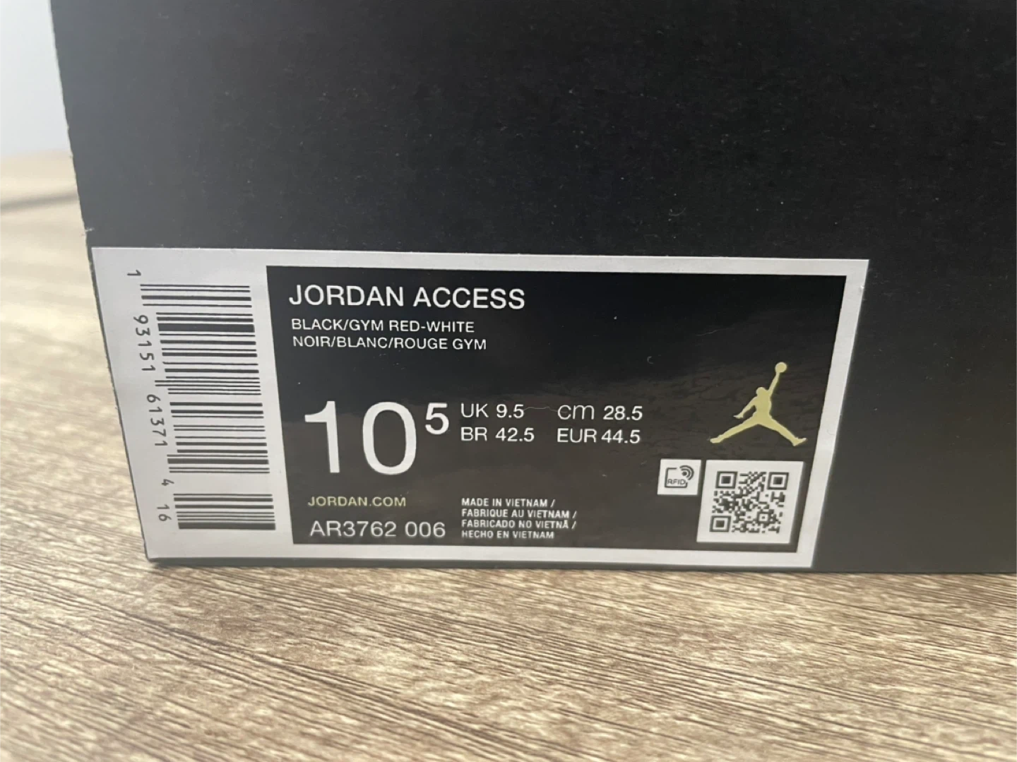 Selling a pair of Jordan Access sneakers in black, gym red, and white. They are a size 10.5 and come with the original box. A stylish and comfortable addition to your footwear collection!