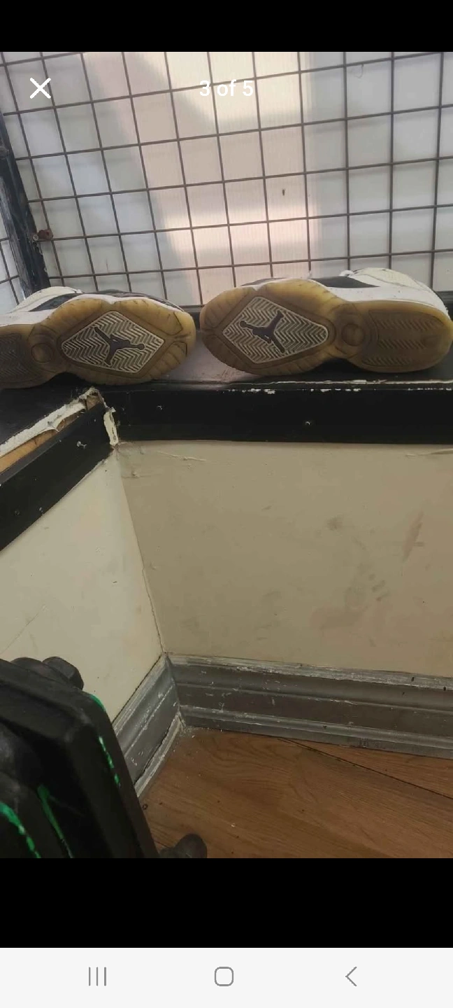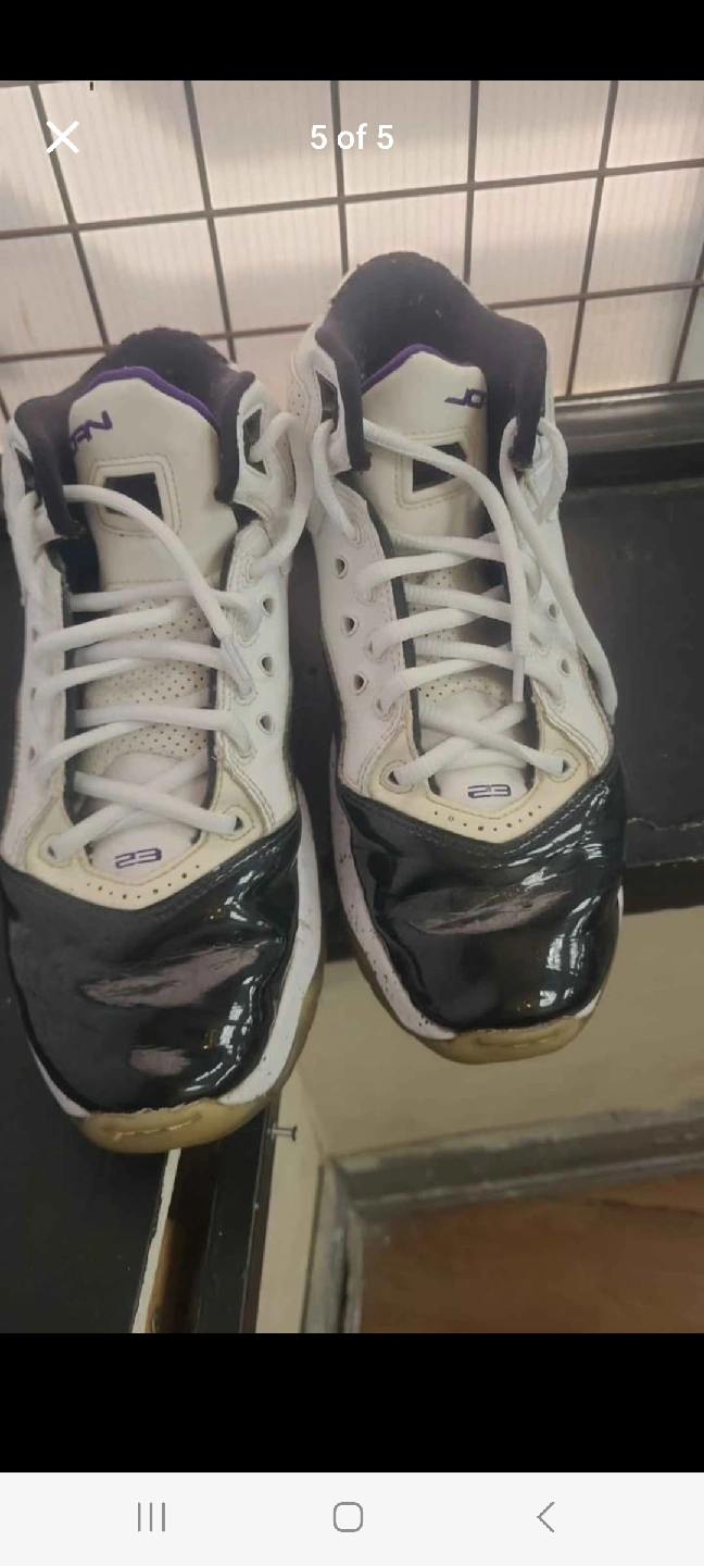 Selling a pair of Jordan basketball shoes in size 6Y. They have a white and black colour scheme with purple accents. They're in used condition, but still have lots of life left in them!