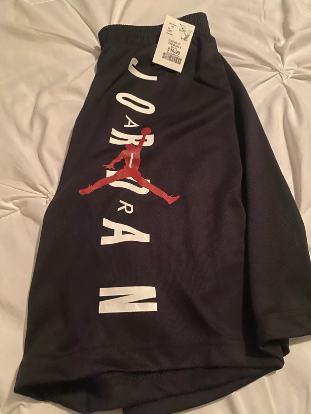 Selling a pair of Jordan black shorts. They feature the Jordan logo in red and the word 'JORDAN' in white down the side. The tag shows they were originally $16.99