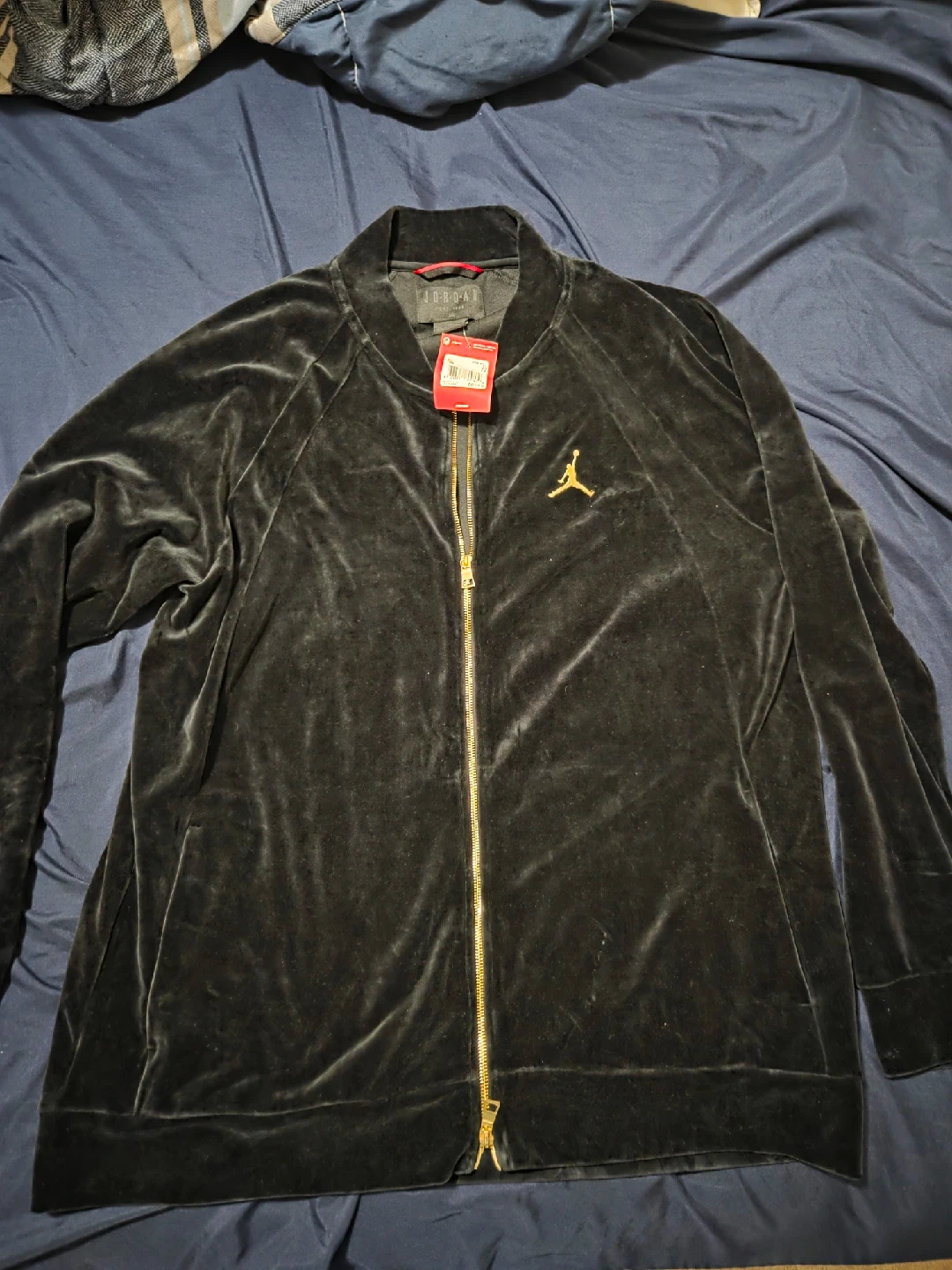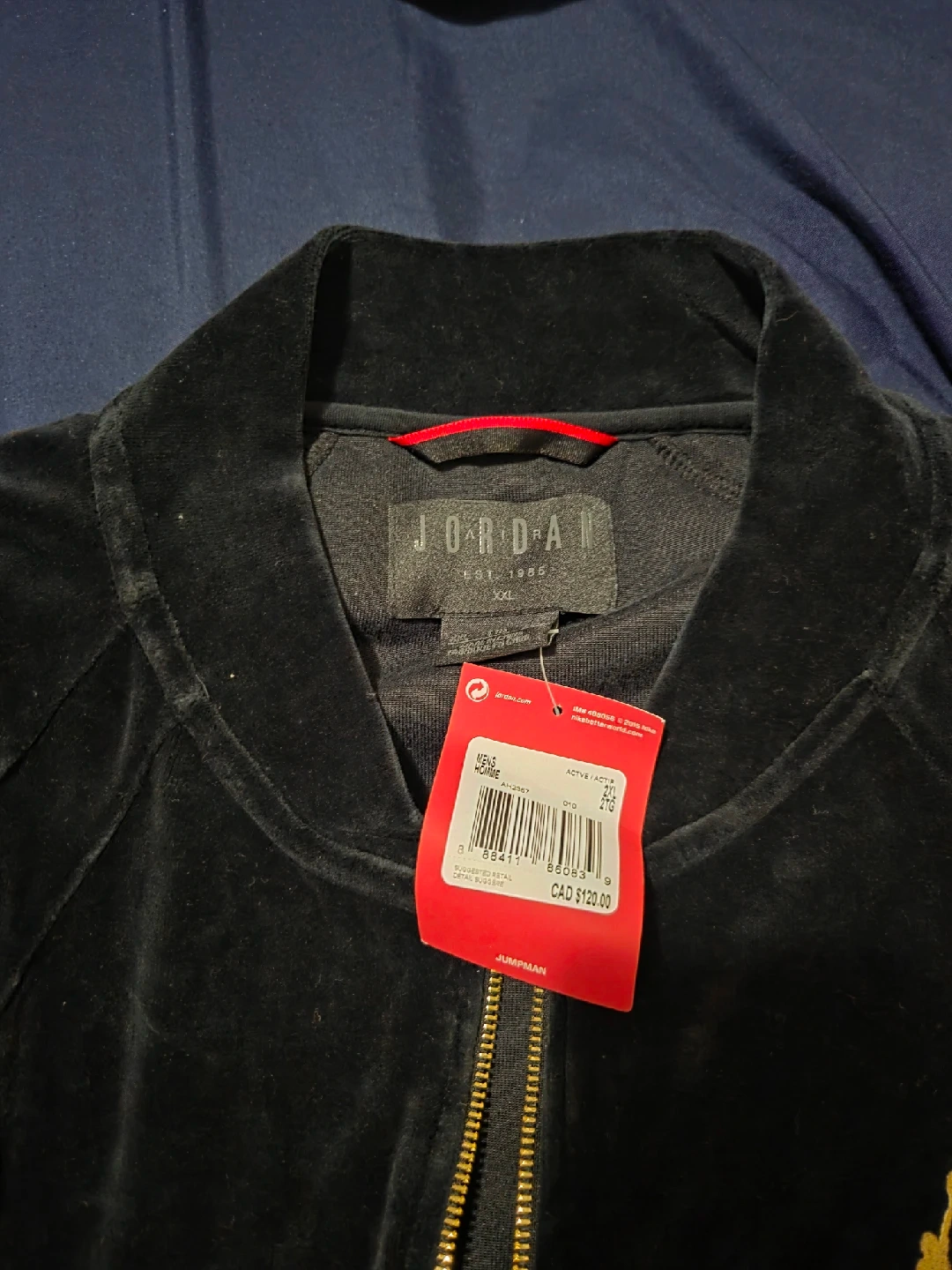 15Selling a brand new Jordan Est. 1985 black velour jacket in size XXL! It's a stylish and comfortable piece, perfect for adding a touch of luxury to your wardrobe. The tag shows it originally retailed for $120 CAD. Don't miss out!