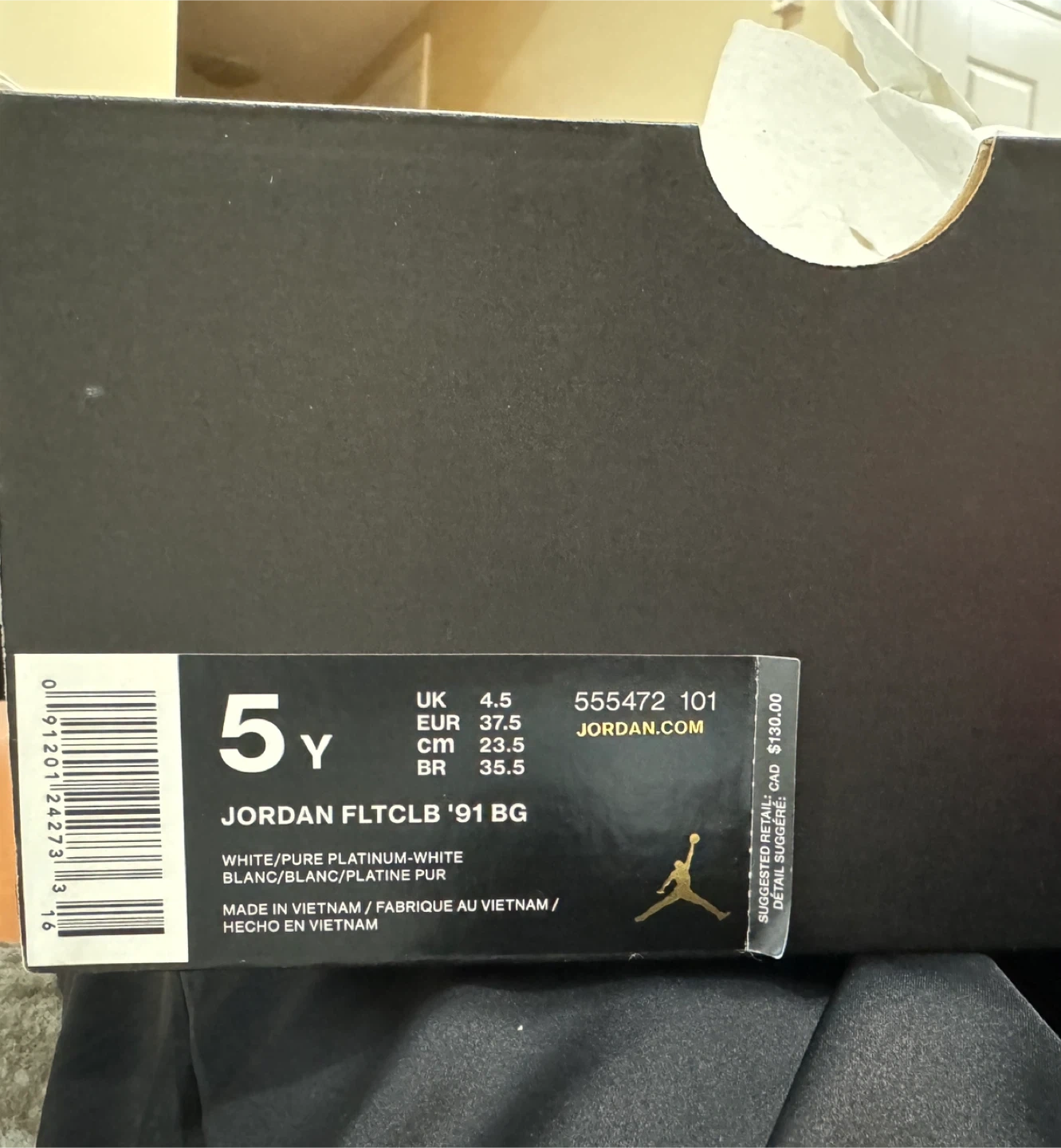 10Selling a pair of Jordan Fltclb '91 BG sneakers in white, size 5Y. They come with the original box.