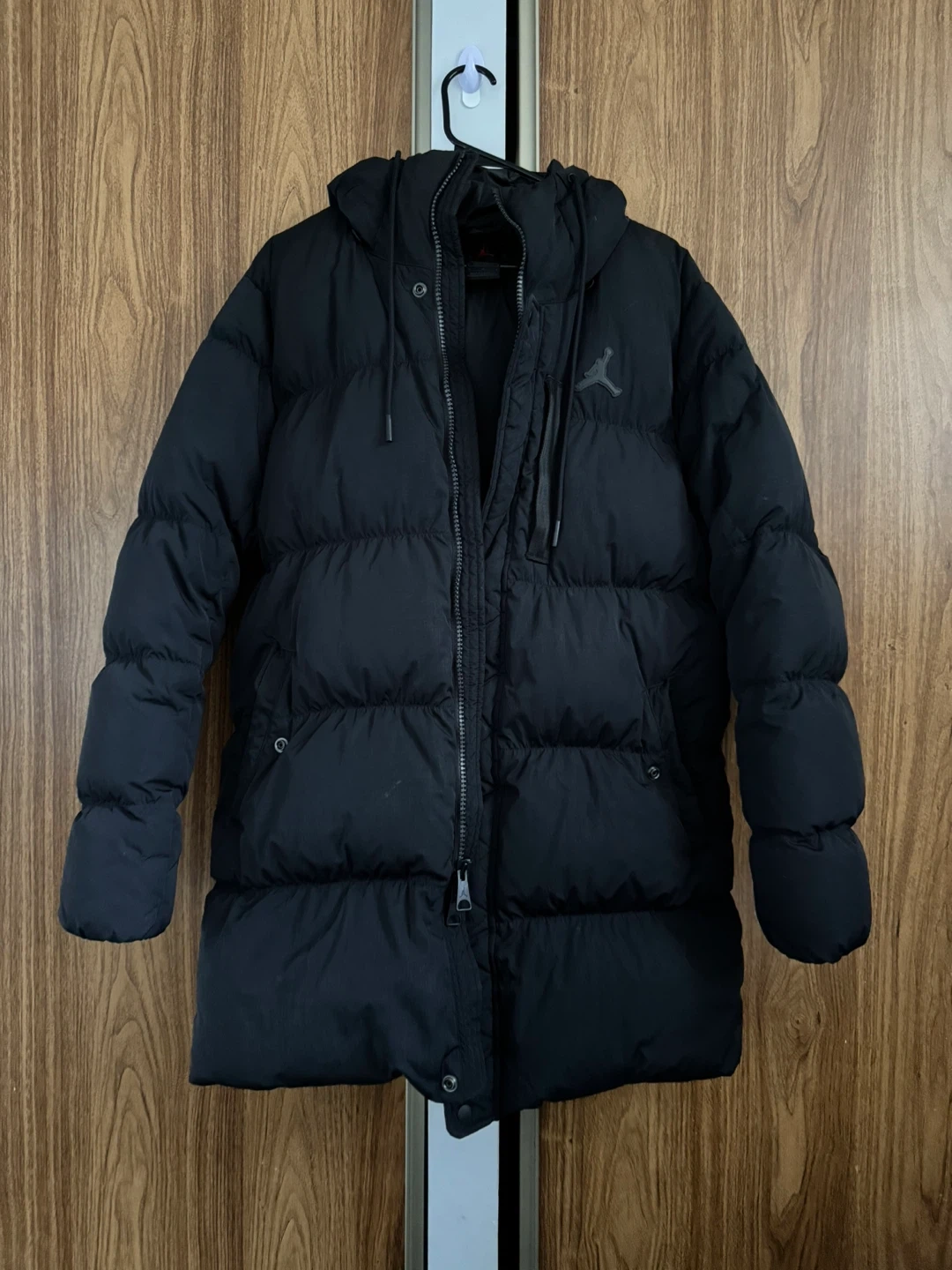 10Cozy up with this Jordan puffer jacket in classic black! It's a great addition to your winter wardrobe. The jacket features a hood and a full-zip front, perfect for those chilly days.