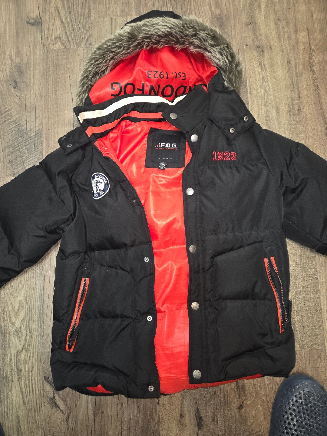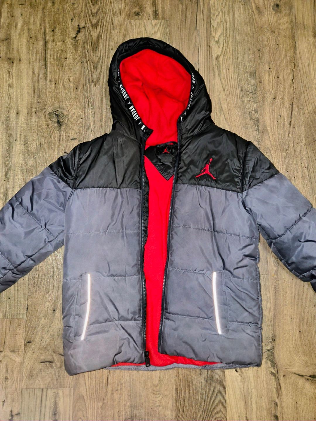 5Cozy Jordan puffer jacket in size 12! It's in great condition and ready for the colder weather. Features a stylish design with a black and grey exterior and a vibrant red interior. Perfect for keeping your little one warm and looking cool! Also London Fog available as well.