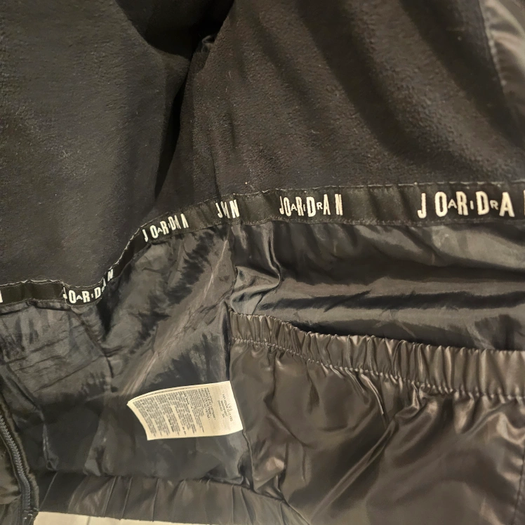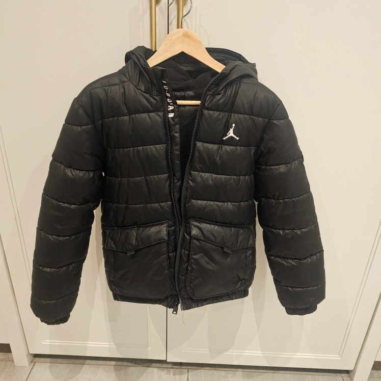 Selling a Jordan puffer jacket in great condition! It's a size L, recommended for ages 12-13 years (147-163cm). The jacket is black and made of 100% polyester. Perfect for keeping warm this winter!