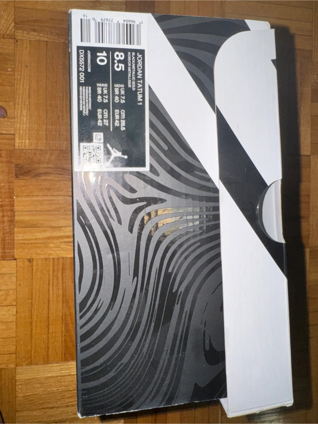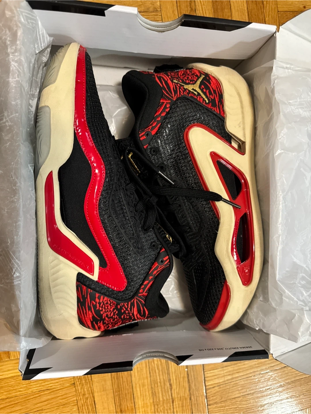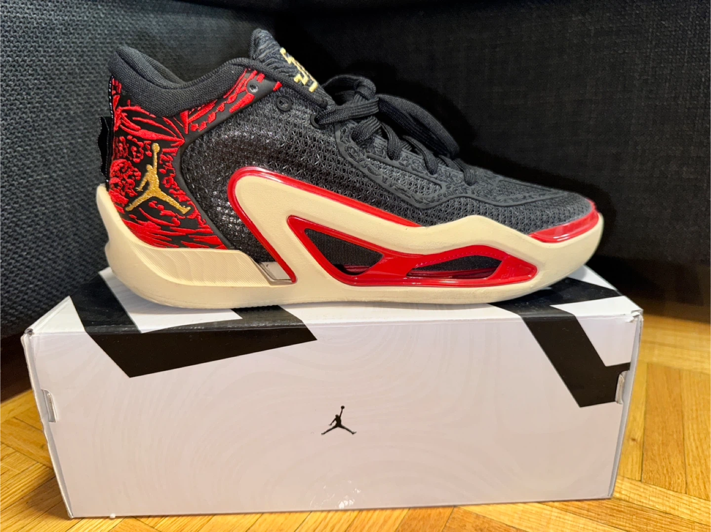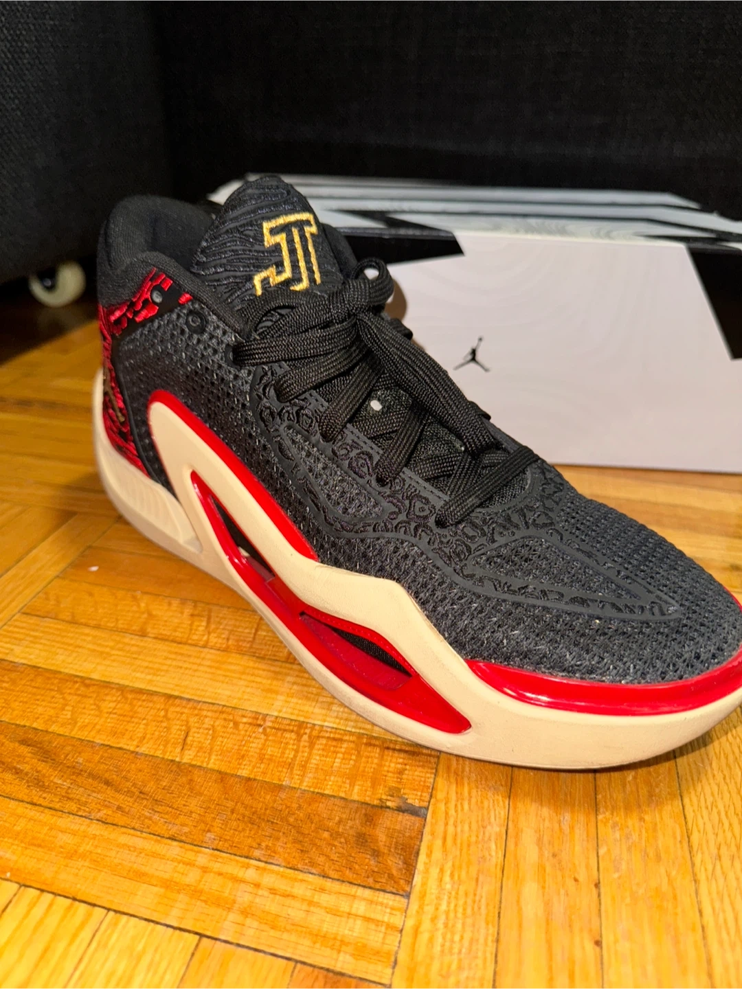 Selling a pair of Jordan Tatum 1 basketball shoes in size 8.5. The shoes are black with red and beige accents, and feature the JT logo. Comes with the original box! Hardly worn once.