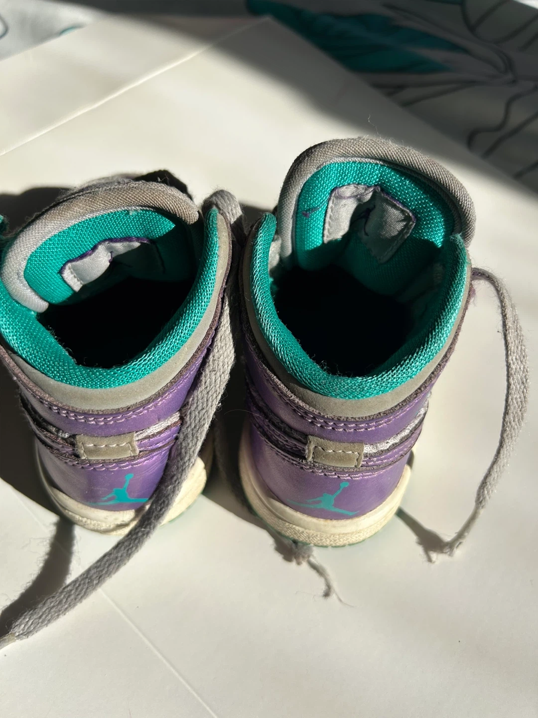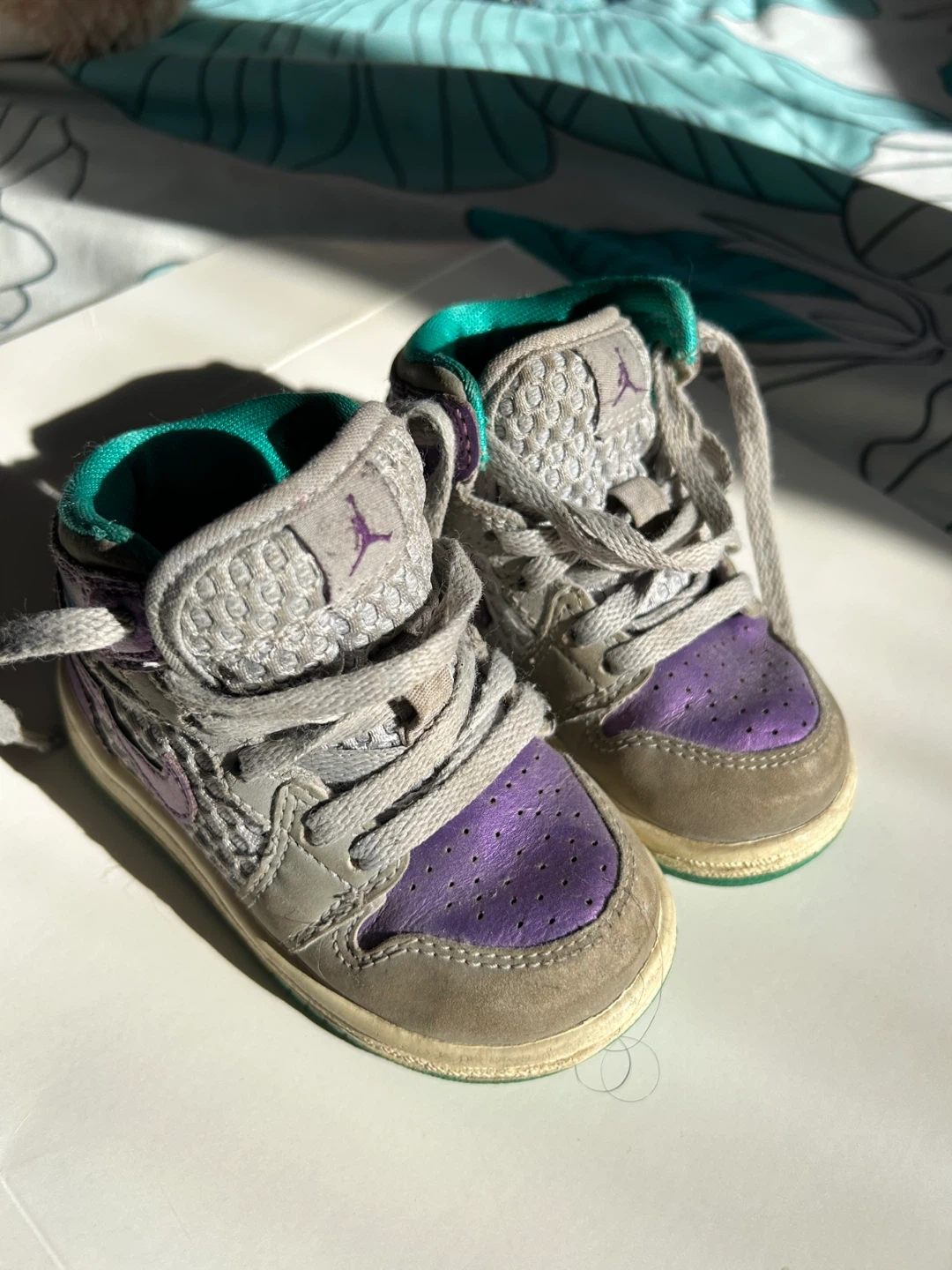 420These cute toddler Jordan sneakers are a size 5C according to inner tag. They feature a grey, purple, and teal colour scheme. Perfect for your little one! Used and in okay condition.